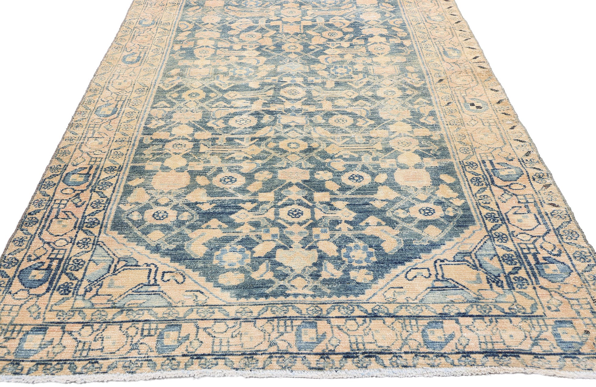 This hand-knotted wool distressed antique Persian Hussainabad Hamadan rug runner is a stunning example of the time-honored weaving traditions from the Hamadan region of Iran. With its soft, muted palette of faded blues and peach champagne, this piece exudes an air of sophistication and charm that only comes with age and expert craftsmanship. The delicate antique wash enhances its nostalgic allure, creating a harmonious balance of colors and textures that make it a versatile addition to nearly any interior space.