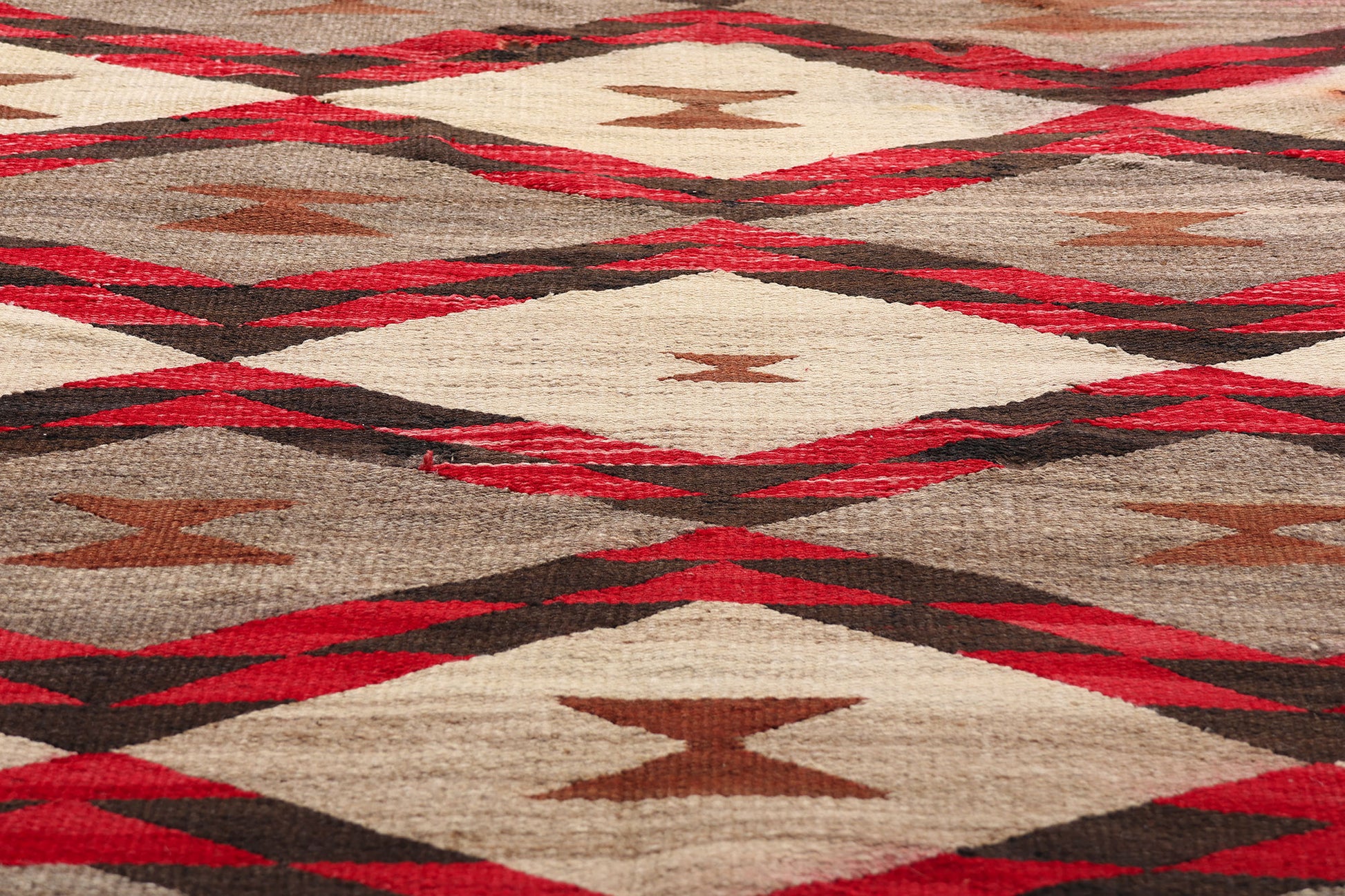 This handwoven wool antique Crystal Navajo rug is a captivating relic of early 20th-century artistry, where the fusion of Navajo tradition and trader-influenced design reached a height of aesthetic refinement. Its dramatic serrated diamond lattice, rendered in a bold interplay of crimson, deep brown, and natural ivory, evokes the intensity of desert sunsets cast upon sacred sandstone cliffs. Each deliberate step of the zigzag lines pulses with vitality, while the hourglass-shaped motifs nestled within the diamonds whisper of harmony, balance, and life force—sacred principles carried forward through generations of master weavers.