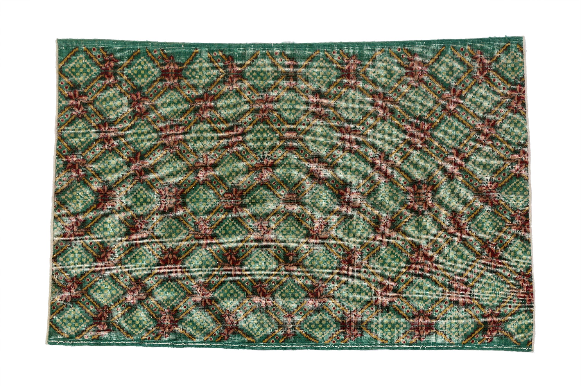 51936, Zeki Muren Distressed Vintage Turkish Sivas Rug with English Country Shabby Chic Style, 03'10 X 06'00. This distressed vintage Turkish Sivas rug with European Country style features a diamond lattice and garden trellis design with stylized flowers, diamonds and dots. Stylish and versatile, this shabby chic rug makes a wonderful eye-catching focal point or a subtle embellishing background piece. With its well-defined composition and simplistic style, this vintage Sivas rug is full of character and brings an artistic impact to complement modern and traditional interiors. Displaying a weathered appearance and the right amount of color pop, this Zeki Muren inspired rug adds visual interest and texture. It is suitable for a wide range of styles: Tudor, European Country, Shabby Chic, Farmhouse, French Country, Art Deco, Abstract, Industrial, Rustic, Lodge, Abstract Expressionism, Cubism, Abstract, Modern, Cubism, Abstract, Traditional, Contemporary, Organic Modern, Art Deco, Postmodern, Expressionism, Bauhaus, and Memphis design. Perfect for hallway, loft, converted factory apartment, warehouse chic, living room, bedroom, pool room, game room, lounge, man cave, study, studio, library, mud room, sitting room, hall, open foyer, entry, office and entryway. Rendered in variegated shades of emerald, jade, dark green, wine, burgundy, brick red, rose, brass, and coffee with other accent colors. Distressed. Abrash. Desirable Age Wear. Hand knotted wool. Made in Turkey. Measures: 03'10 x 06'00.