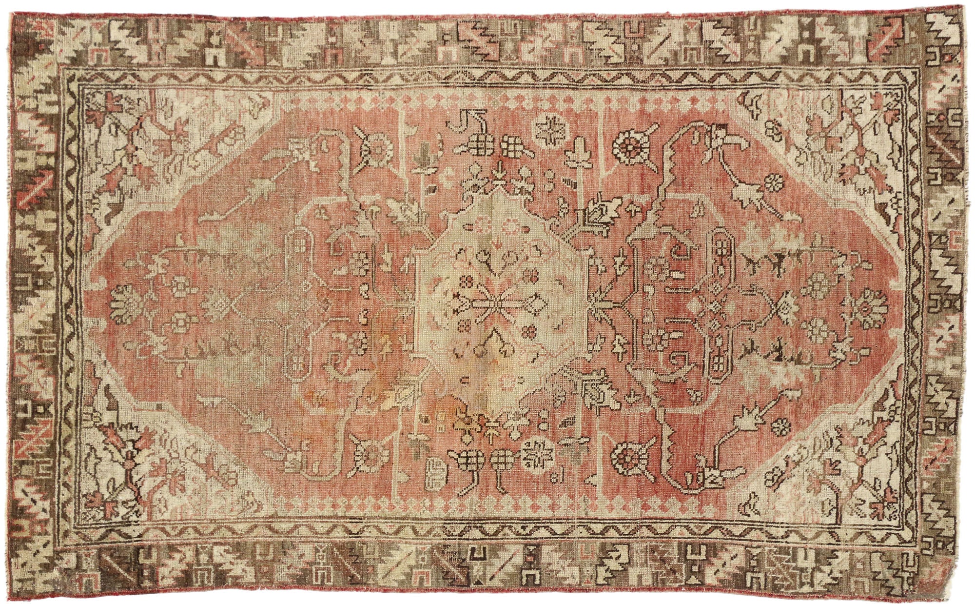 This hand-knotted wool vintage Turkish Oushak rug features a