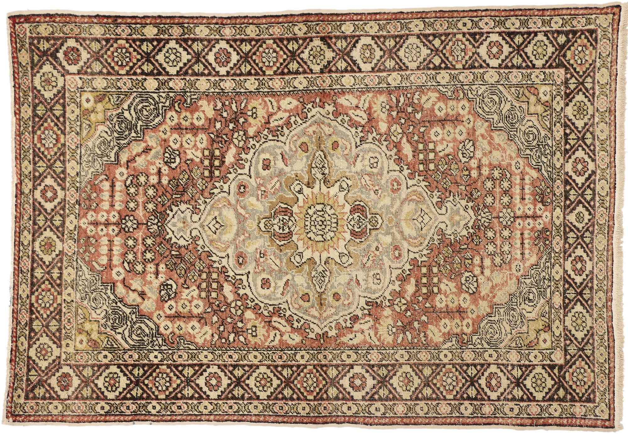 73912 Distressed Vintage Turkish Sivas Rug with Rustic Cottage Arts & Crafts Style 04'05 x 06'04. With architectural elements of curved forms and decorative detailing, this hand knotted wool vintage Turkish Sivas rug features a cusped center medallion surrounded by an all-over floral pattern composed of blooming palmettes extending with florals, delicate millefleurs, dancing blossoms and arabesque vines. With its commitment to tradition and Old World charm, this vintage Turkish area rug can enliven nearly any opulent period-interior with color and vitality. Perfect for an entry, foyer, open hall, bedroom, front room, living room, billiard room, private library, music room, home office, studio, study or formal sitting room. Blending cozy and Classic with warm and welcoming, this vintage Sivas rug is the perfect mix of simplicity and refinement. Well-suited for a variety of interior styles: Art Nouveau, Traditional, French Country, Elizabethan, Artisan, Old World, Carolean, English Cottage, Victorian, Russian Home, Venetian, William & Mary, Arts & Crafts, Italian, Egyptian, Louis XIV, Louis XI, Louis XV, Rococo, Chippendale, Regal, Baroque, and Renaissance. Rendered in variegated shades of beige, almond, taupe, greige, sand, tan, ecru, rust, muted brick red, terra cotta, gray, light gray, oyster gray, espresso, and coffee. Distressed. Desirable Age Wear. Abrash. Hand knotted wool. Made in Turkey. Measures: 04'05 X 06'04.