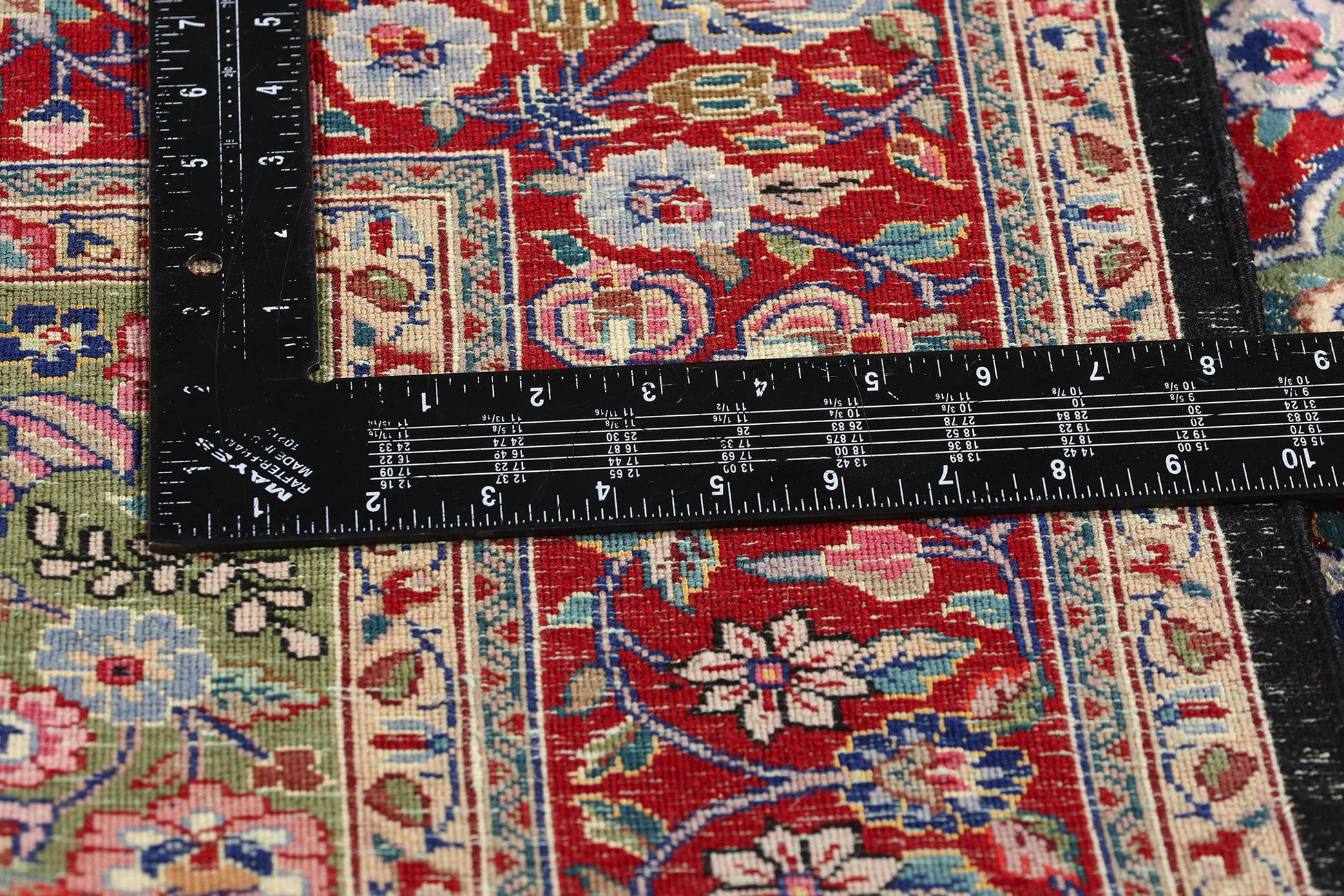 The Chinese Tabriz rug's green corner spandrels, with their scalloped edges, echo the designs found within the central field, reinforcing the rug’s ornamental and balanced composition. These corner details are not merely decorative, but serve to link the borders with the central medallion, creating a seamless flow throughout the piece. A delicate main red border wraps around the rug, featuring more floral designs and arabesque vinery that echo the beauty of the medallion. The smaller guard borders, adorned with dainty floral motifs, add layers of depth, framing the rug with a refined and continuous pattern.