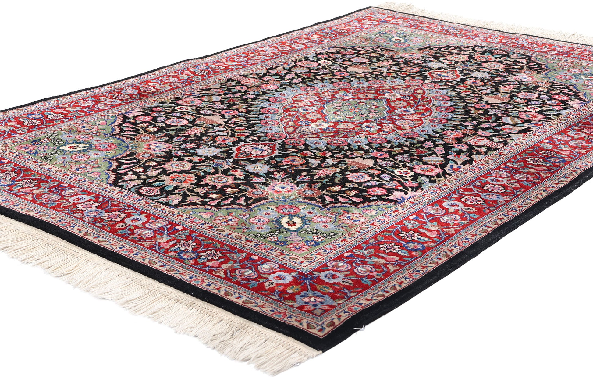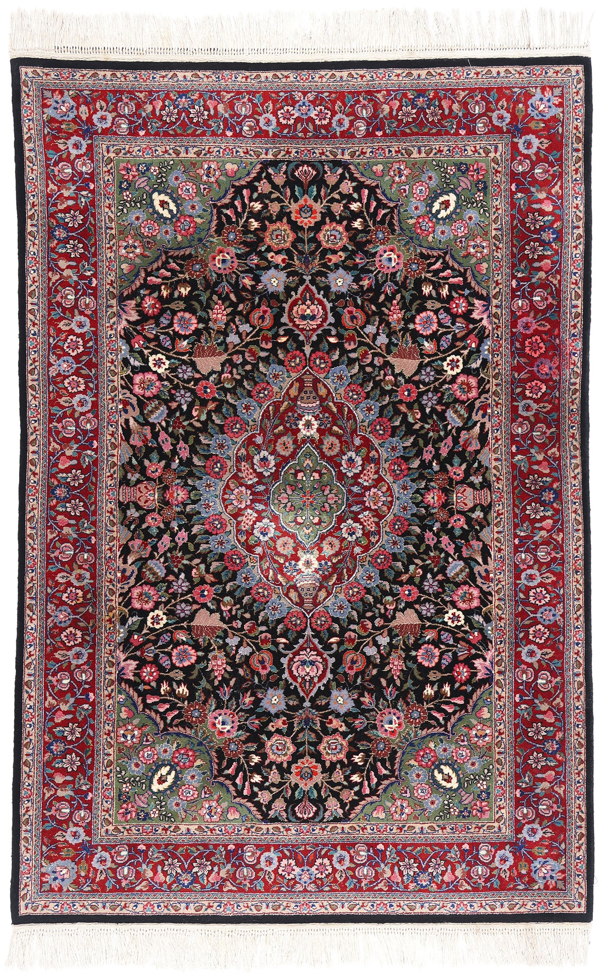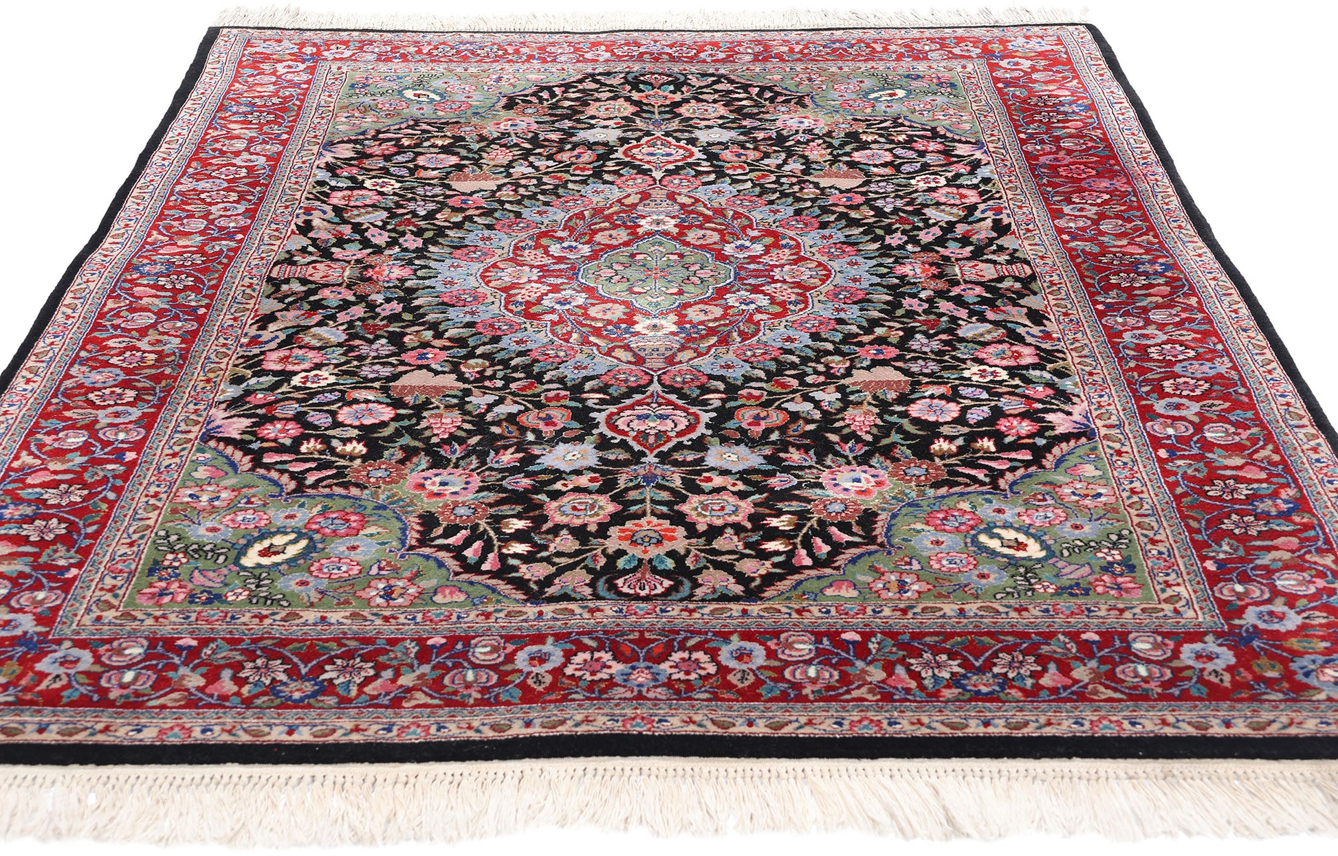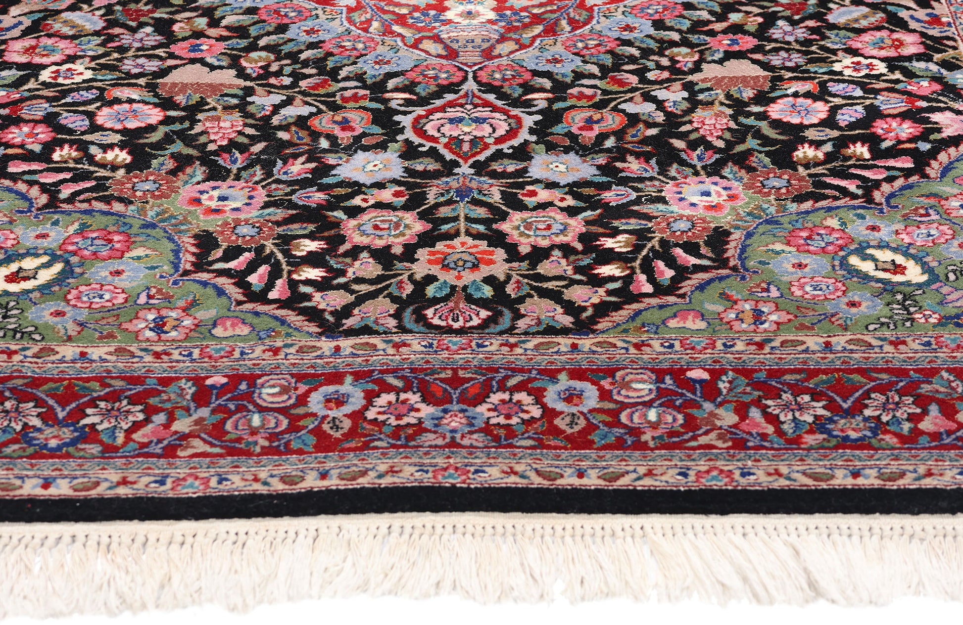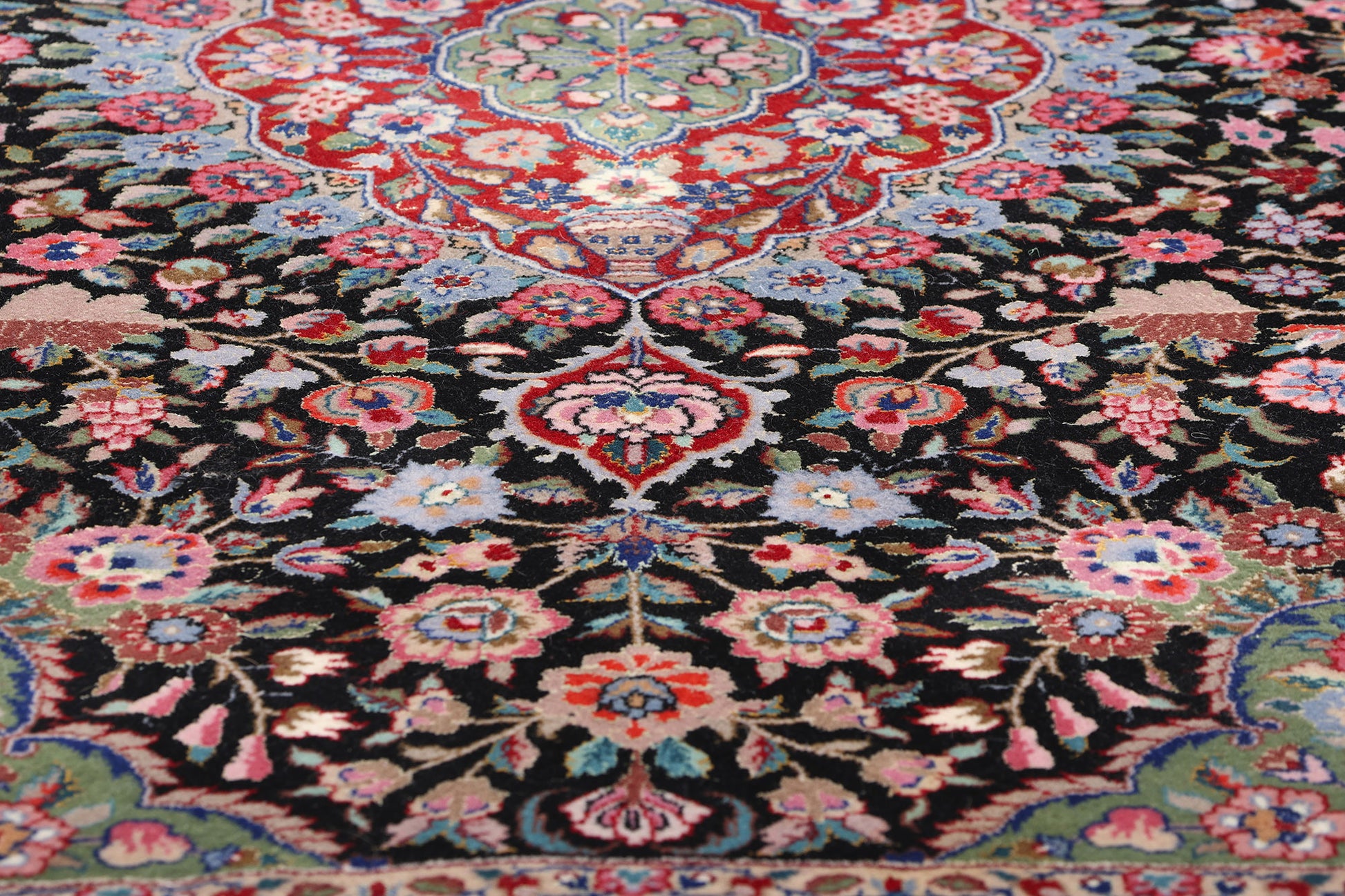 The medallion itself, in lavish shades of red, green, and soft blues, stands out as the focal point, symbolizing the ethereal beauty of nature. Surrounding the medallion, the field is alive with dense arrangements of flowers, vines, and urns, which flow outward in a symmetrical yet organic fashion, inviting the viewer's eye to trace their delicate shapes. The finely executed design creates a sense of movement and life, with every element carefully placed to create visual balance and refinement. This organic symmetry is characteristic of the Tabriz style, known for its elegant and meticulously crafted motifs.