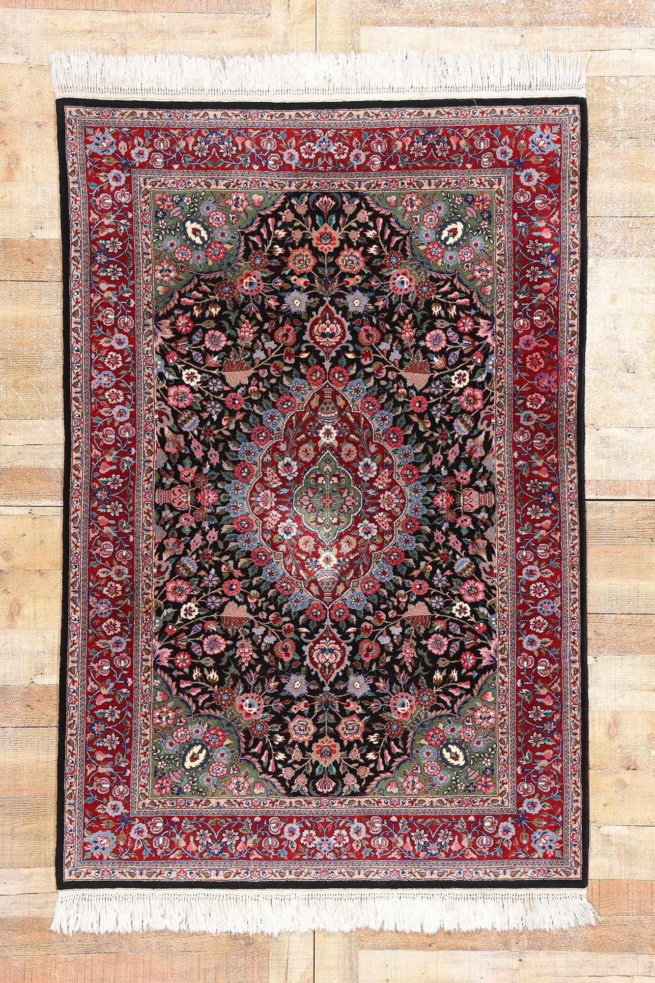 This stunning hand-knotted wool and silk vintage Chinese Tabriz rug exemplifies the beauty and timeless elegance of Persian-inspired design, woven with exceptional skill and artistry. The Chinese Tabriz rug features a striking central medallion surrounded by resplendent floral motifs, all set against a rich, dark field that highlights the vivid colors and fine details. The cusped medallion, anchored by a floral pendants at either end, seamlessly amalgamates into the surrounding array of lush florals, creating a harmonious balance of color and pattern that speaks to the rug's beautiful craftsmanship and historical significance.