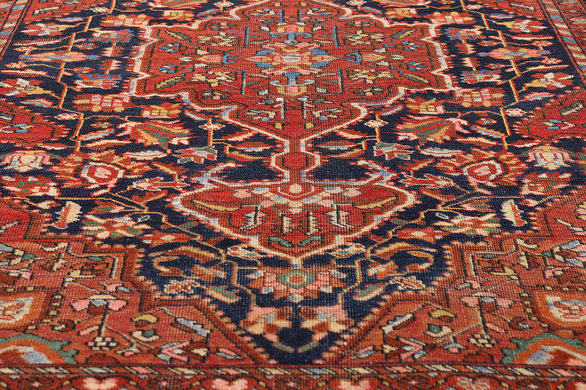 The heart of the rug radiates with a bold central medallion set against a navy and brick-red field, adorned with flowing arabesques, palmettes, and blossoming vines. Each motif is more than mere decoration—it is a symbolic language of prosperity, protection, and renewal. The scrolling vines speak of eternal growth, while the blossoms echo paradise gardens long celebrated in Persian poetry. The medallion itself acts as a cosmic center, harmonizing the chaos of pattern into spiritual order. This union of beauty and meaning elevates the rug from furnishing to heirloom.