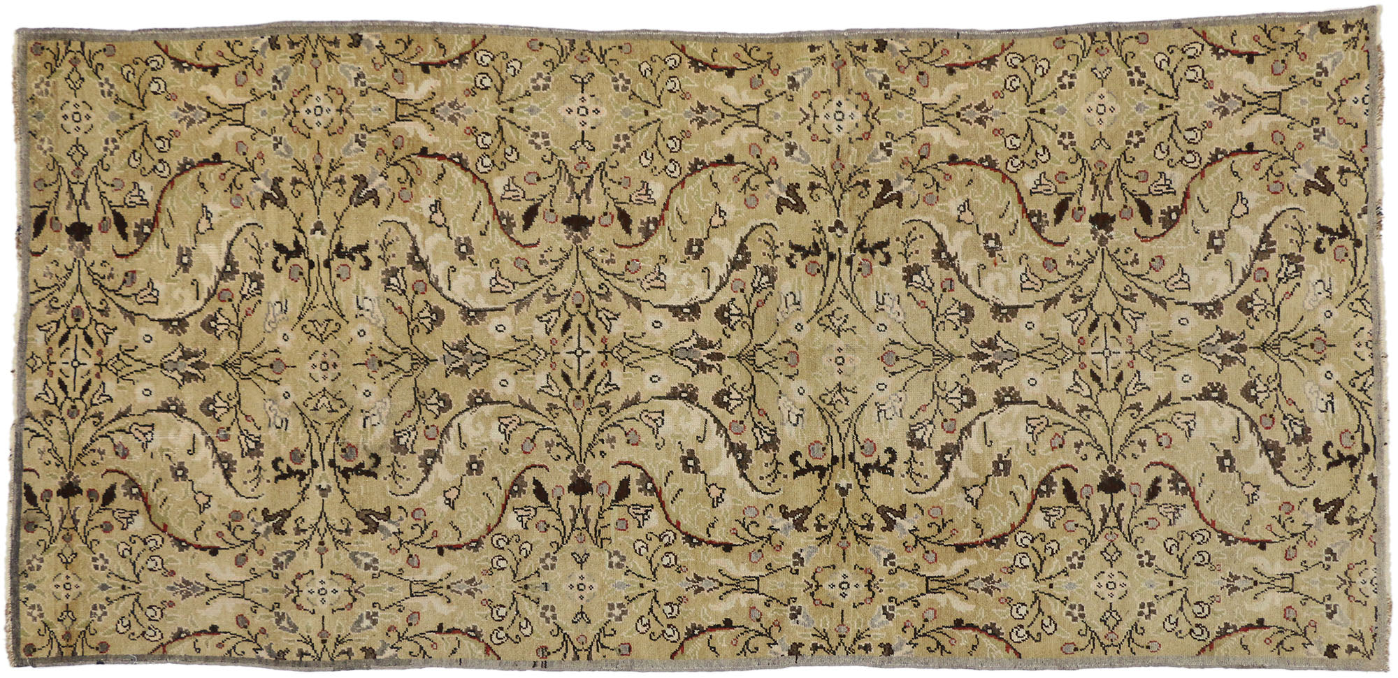 73754 Vintage Turkish Oushak Hallway Runner with Rustic Swedish Farmhouse Style 04'09 X 10'02. This hand-knotted wool vintage Turkish Oushak runner with rustic Swedish Farmhouse style is characterized by subtle tones and traditional elegance. The tan field and all-over arabesque elements of design serves as the main setting. Flowers, blossoms and vine scrolls meander throughout the field, giving this Oushak runner a feeling reminiscent of a Persian runner. Perfect for an entryway, alcove, nook, kitchen, bathroom, small space, mudroom, parlor, home office, den, walk-in closet, loft, lounge, sitting room, powder room, bedroom, study, suite, studio, short hall, hallway, foyer and entry.With its warm earth tones, charming patina and elegant design, this Turkish Oushak runner is well-suited for a wide range of interior styles: Traditional, Transitional, Eclectic, Modern, Mid-Century Modern, Contemporary, Industrial, Rustic, Lodge, Country, Arts & Crafts, Craftsman, Bohemian, Boho Chic, Shabby Chic, English Country, French Country, Gustavian, Swedish Farmhouse, Primitive and Tribal. Rendered in variegated shades of ecru, camel, tan, beige, sand, coffee, sienna, khaki, taupe, dark gray, charcoal, onyx with accents of brick red. Antique Wash. Abrash. Hand-knotted wool. Made in Turkey. Measures: 04'09 x 10'02.