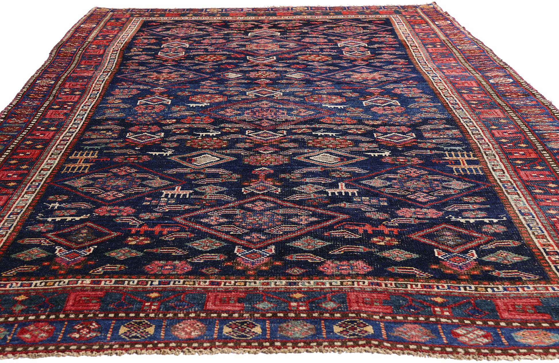 Emanating from the rugged highlands of Northwest Persia, this late 19th century hand-knotted wool antique Persian Kurd rug is a triumph of tribal artistry and enduring heritage. Woven by Kurdish weavers whose traditions date back centuries, this piece is a rare expression of cultural identity—each precious knot preserving a fragment of history, each motif carrying the symbolic weight of ancestral memory. Its deep indigo ground sets the stage for a mesmerizing lattice of diamond medallions, rosettes, and stylized florals, while zoomorphic figures of animals march rhythmically across the field, invoking fertility, protection, and the eternal bond between people and nature.