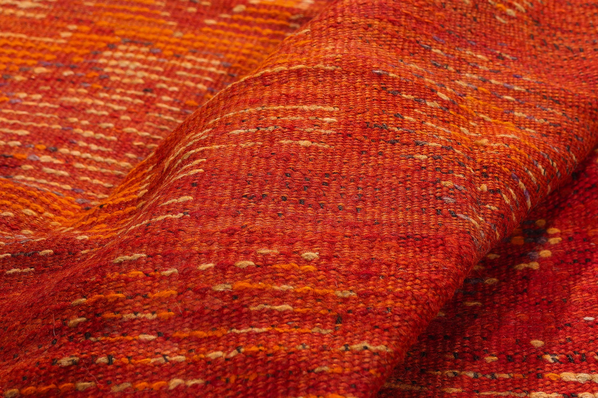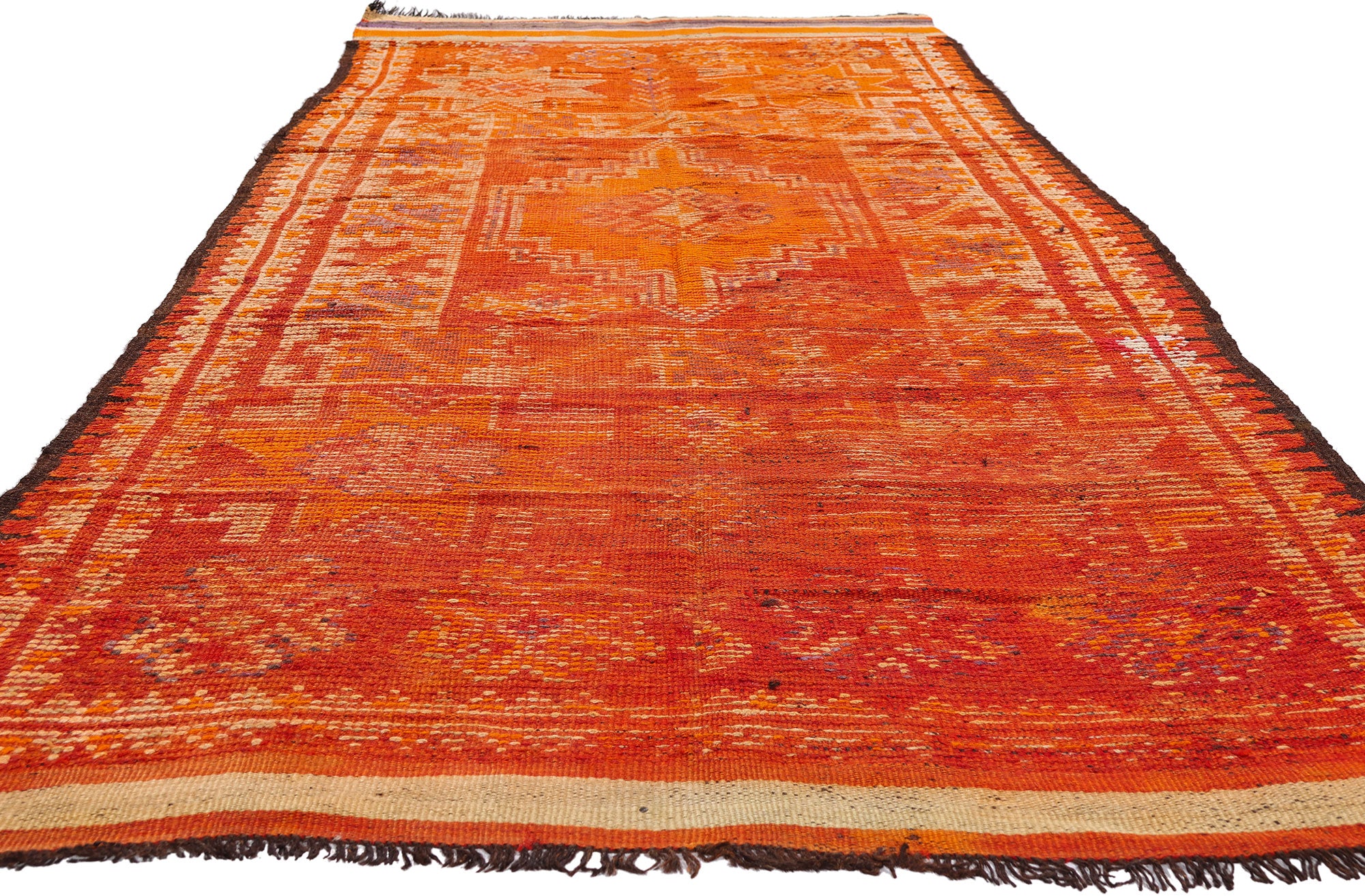 Radiating the warmth of a desert sunset, this hand-knotted wool vintage Taznakht Moroccan rug is a commanding expression of Berber artistry from the High Atlas Mountains. Its vibrant orange field glows with an intensity that feels almost ceremonial, as though woven to honor both earth and flame. Created by the Berber Tribes of Morocco, this piece carries the quiet authority of heritage—an heirloom born from tradition, yet bold enough to anchor the most discerning interiors. It is not merely collected; it is claimed.