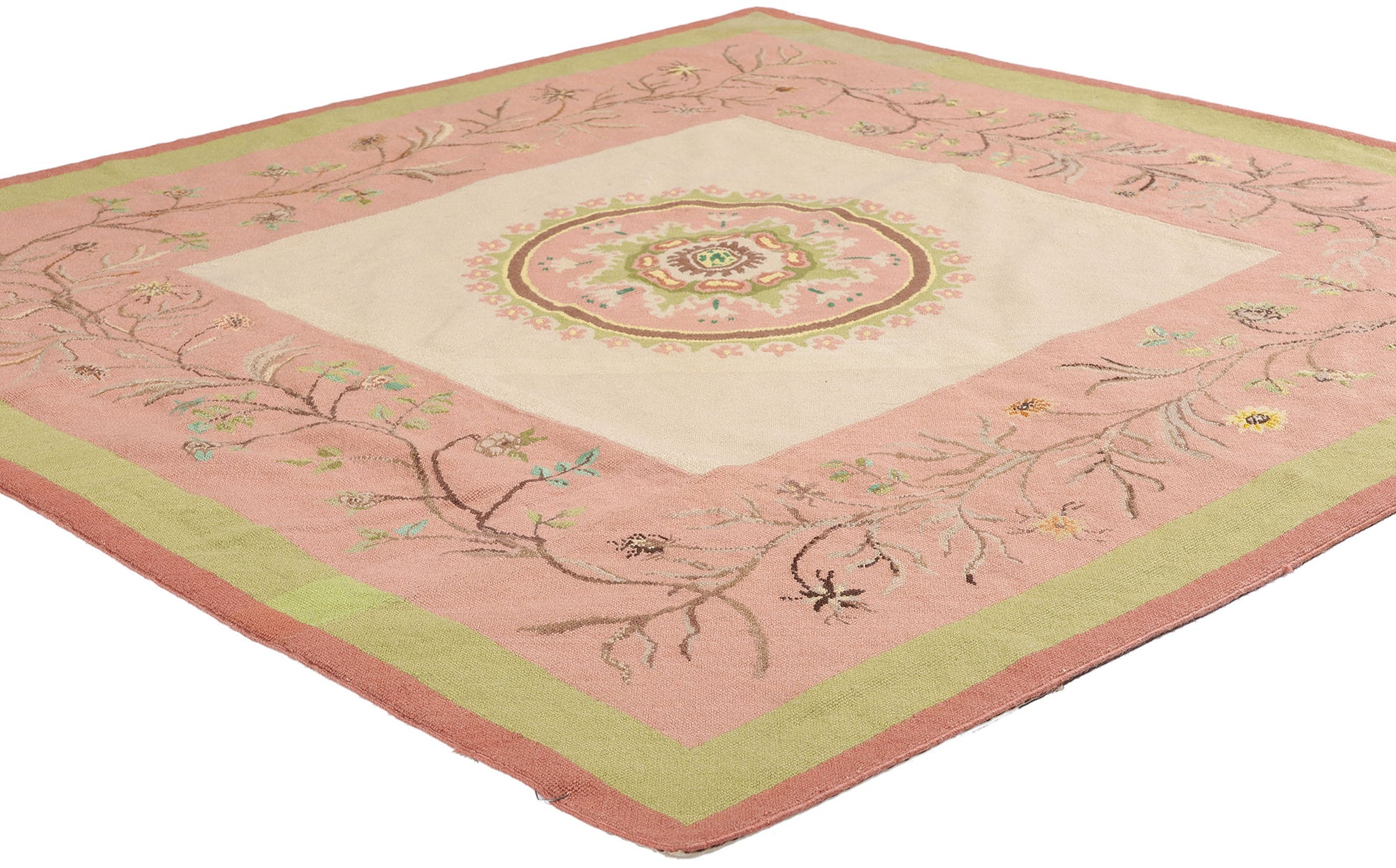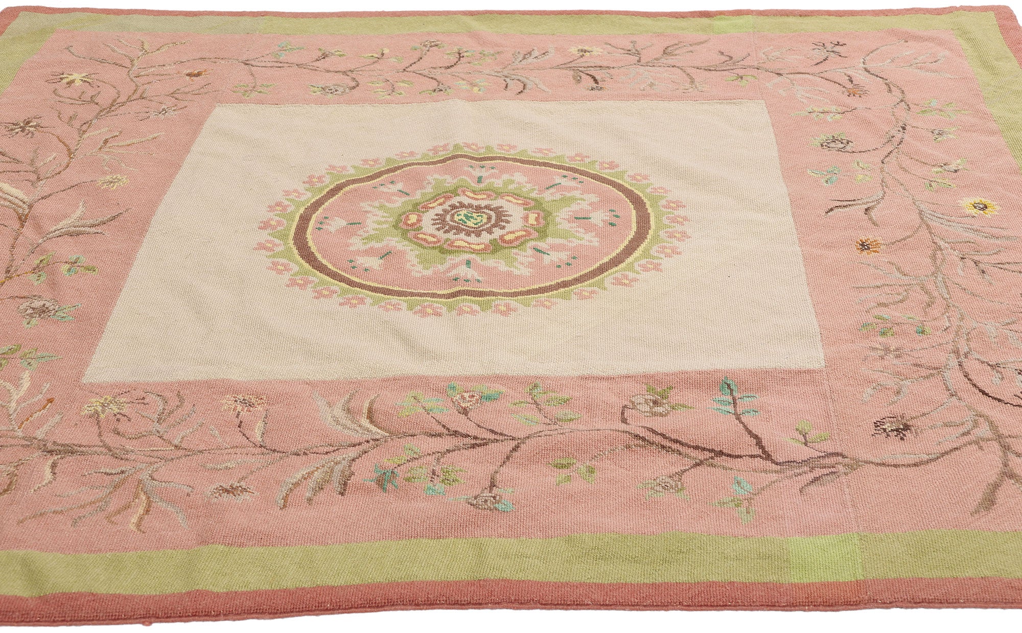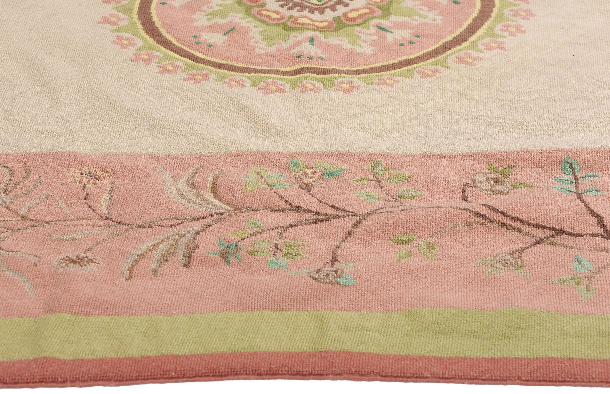 The medallion, framed by an elegant border of entwined vines and blossoming flowers, brings the natural world indoors, paying homage to the pastoral landscapes of Portugal. The carefully stitched floral motifs that decorate the borders offer a romantic narrative, evoking images of lush countryside gardens in bloom. The pink and green hues, delicately interwoven into the design, complement each other and give the needlepoint rug a soft, inviting appearance, perfect for creating a serene atmosphere in any room.