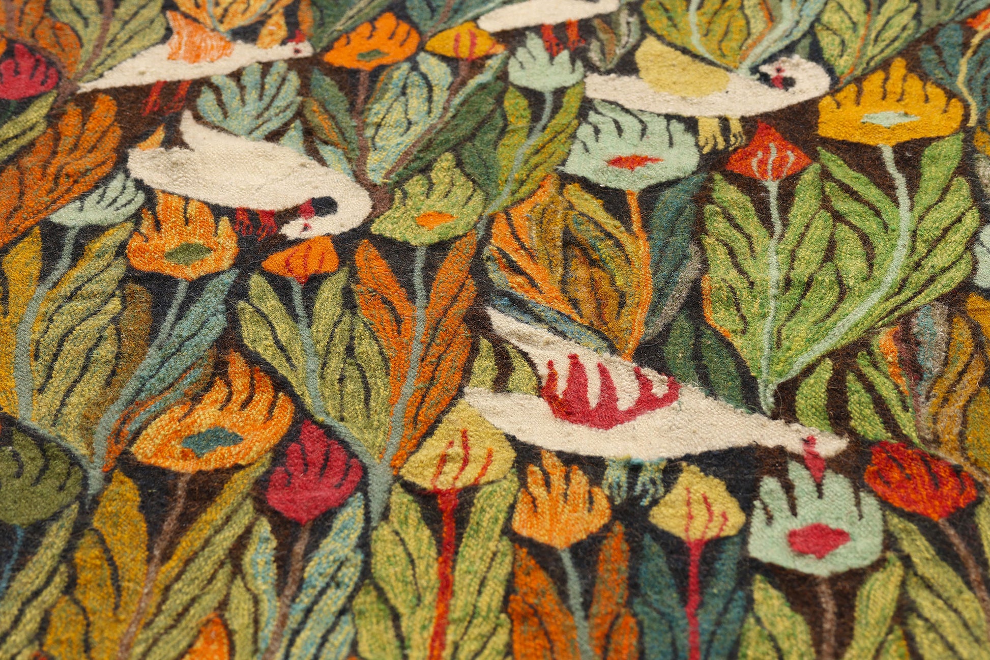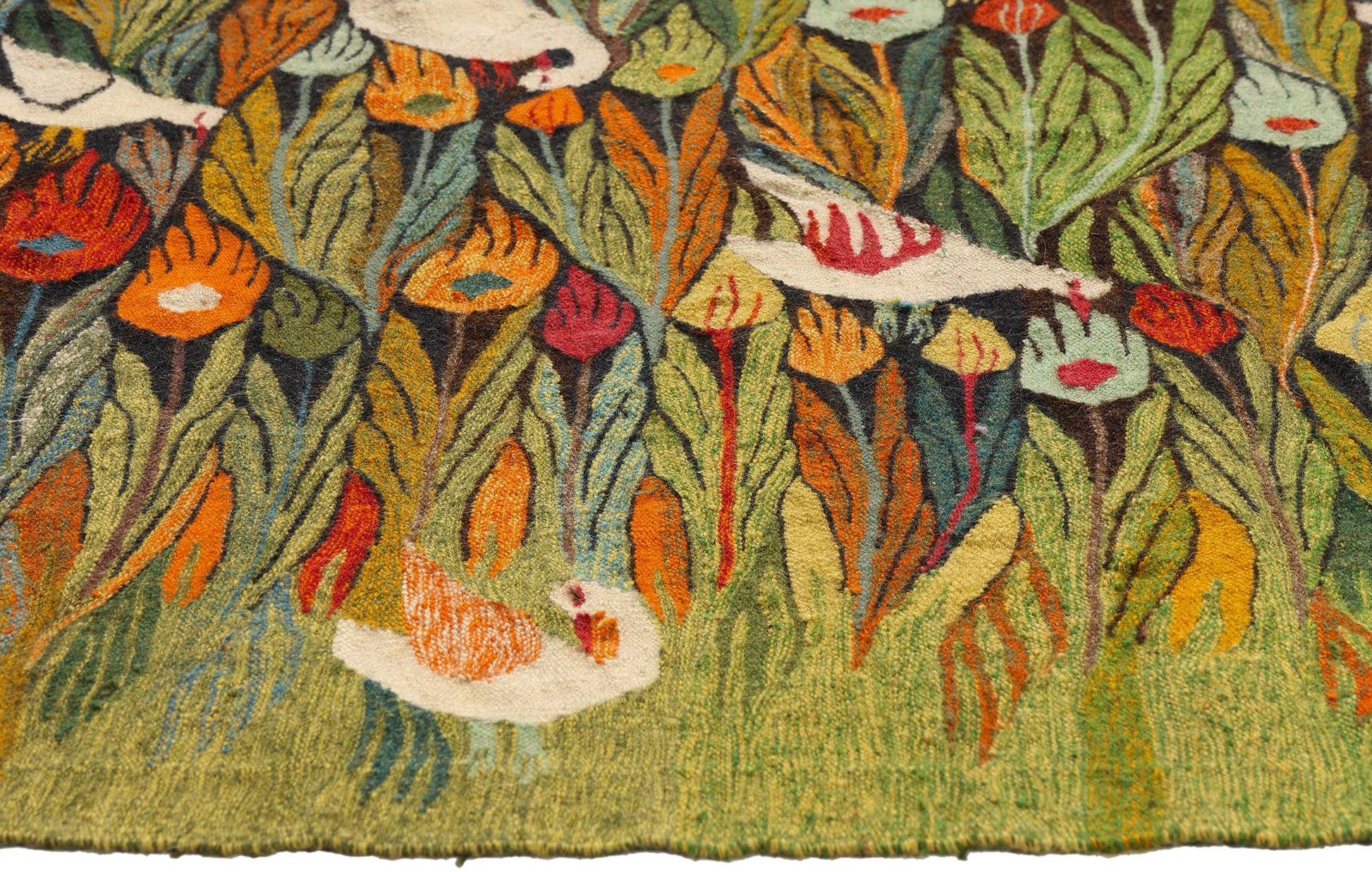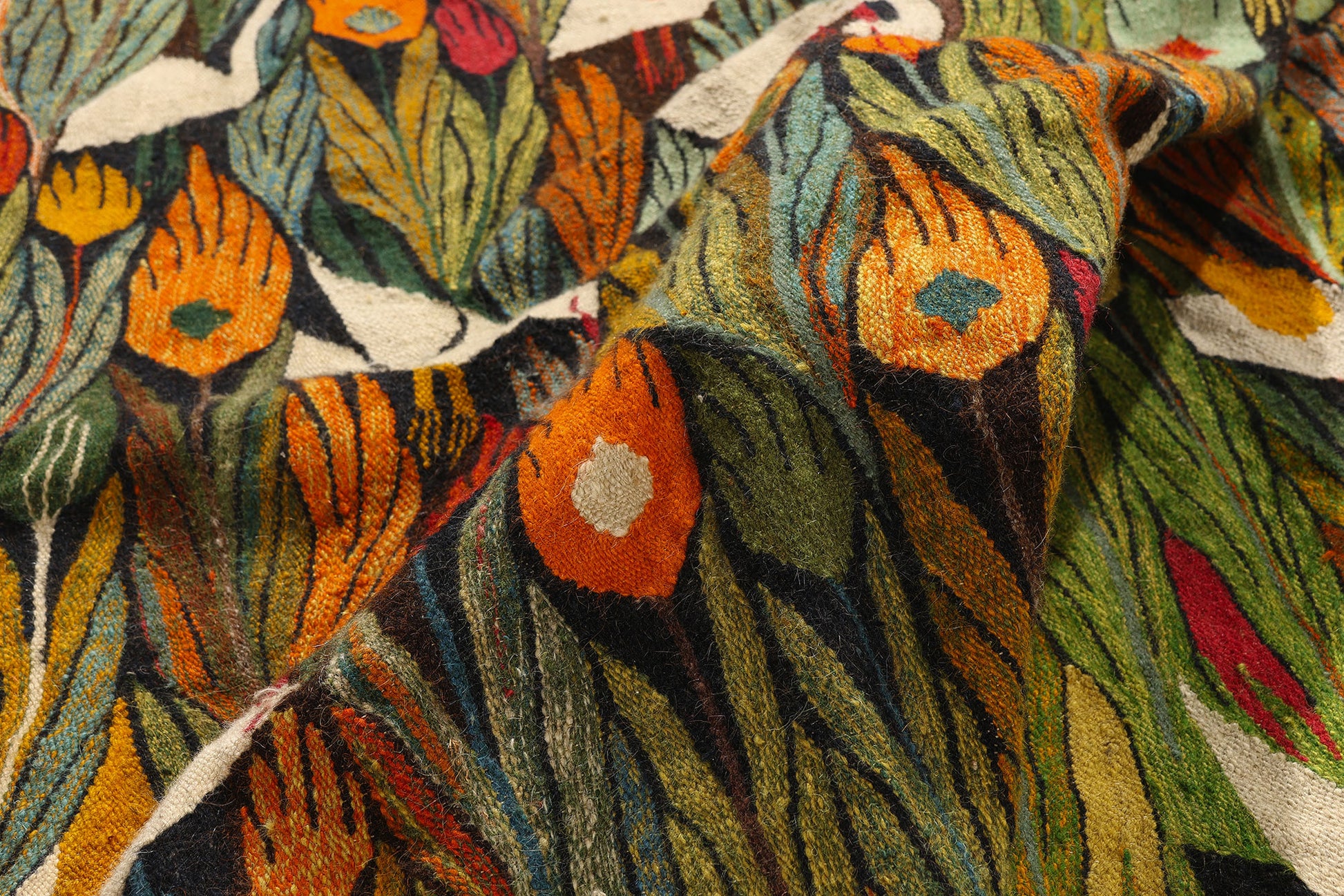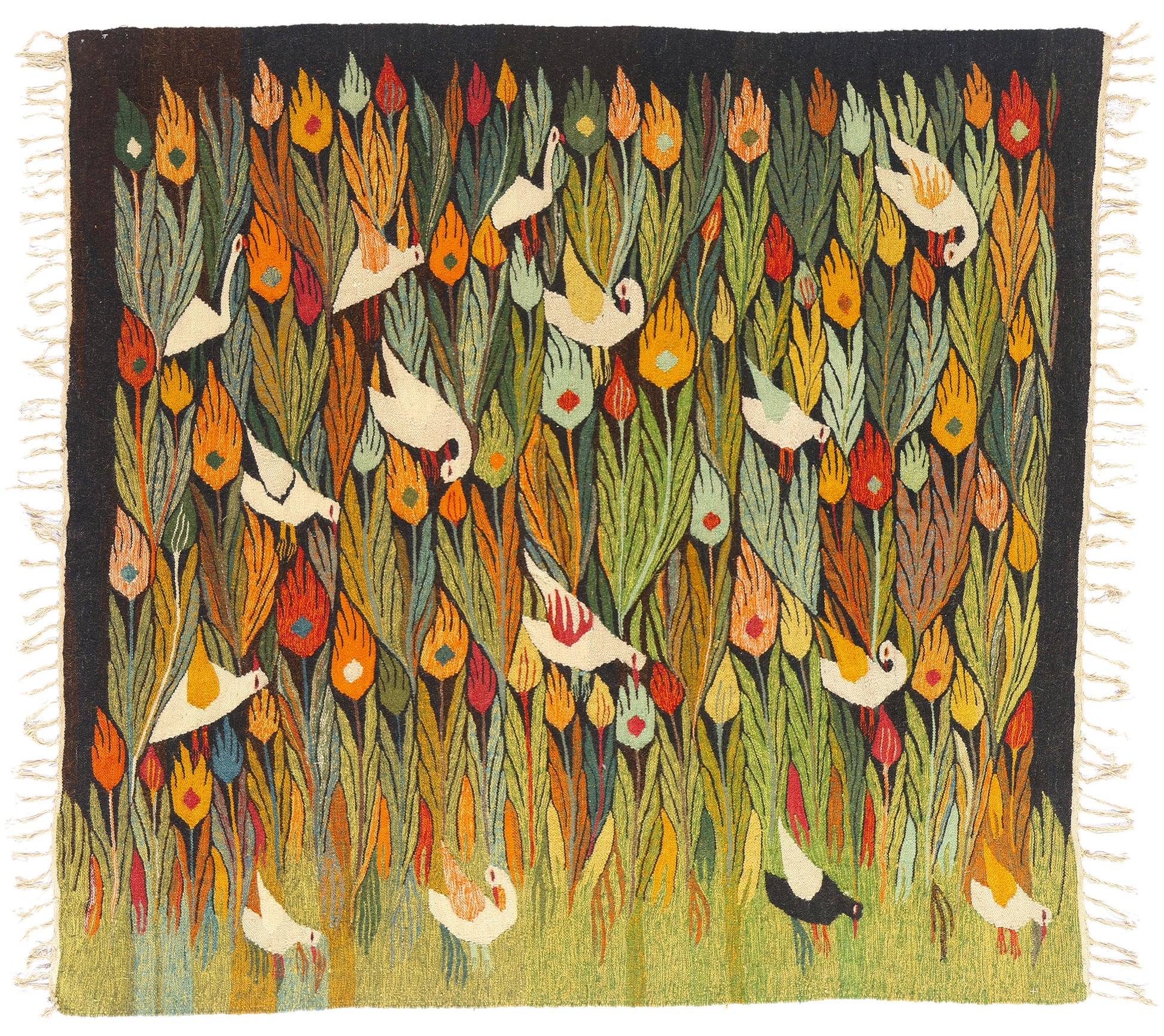 The tapestry’s dreamlike arrangement of flame-like foliage interspersed with stylized birds reflects the Art Center’s ethos of boundless creativity, where artisans translated their personal visions of Egypt’s flora and fauna into woven poetry. Natural vegetable dyes, applied with a painter’s sensibility, imbue the surface with a vivid yet harmonious palette—from the fiery ochres and glowing corals to the deep emeralds and rich ebony tones. This color orchestration, combined with meticulously handwoven textures, exudes the poise, purity, and timeless elegance that place Harrania tapestries firmly within the canon of modern Egyptian textile art.