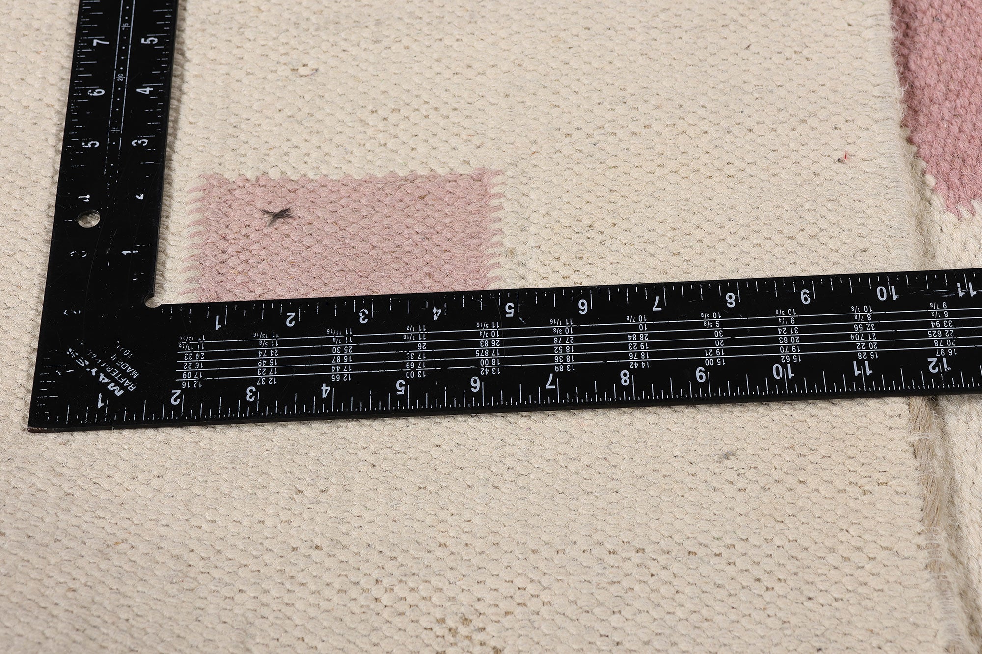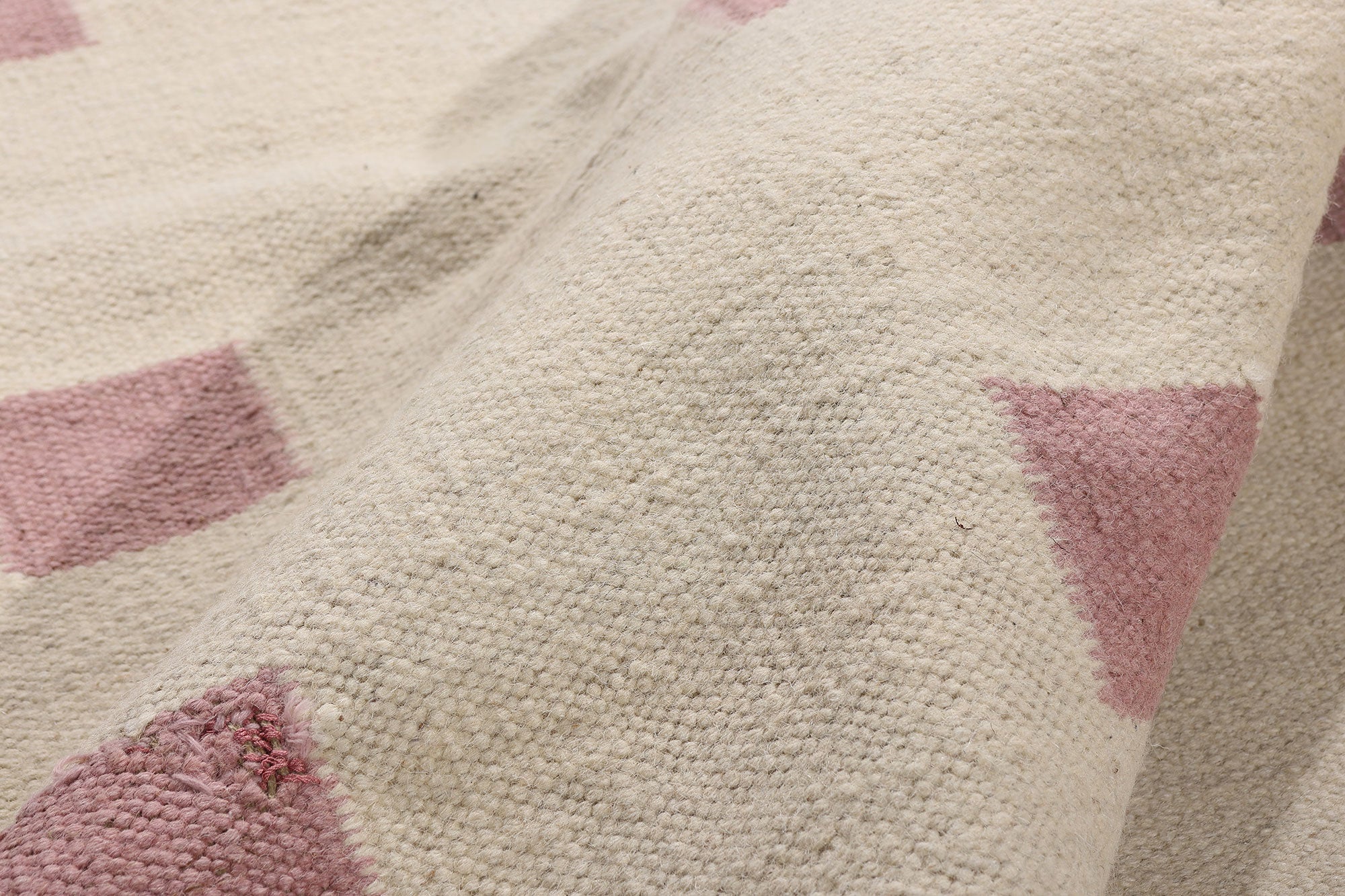 Framing the composition is a pair of rosy vertical bands—a refined, architectural gesture that anchors the symmetry of the field and reinforces its sculptural impact. These color-blocked edges echo the disciplined clarity of Bauhaus and mid-century Nordic design, bringing a quiet sense of structure to the soft, rhythmic interior grid. The result is a textile that feels at once timeless and fresh, effortlessly blending into contemporary settings while maintaining the soul of its heritage.