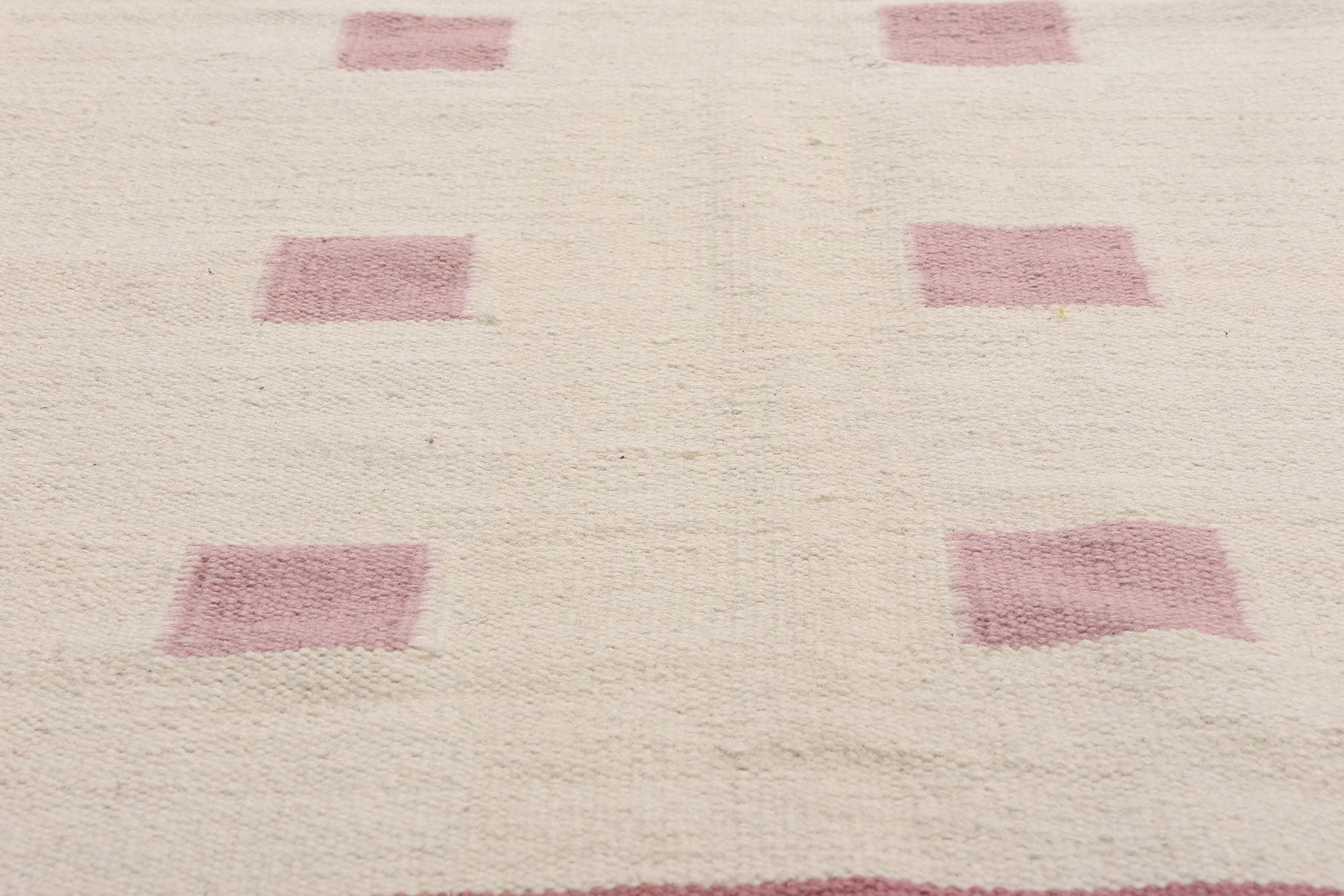 Step into a world of quiet Scandinavian refinement with this handwoven vintage Finnish rollakan rug—an understated yet irresistibly sophisticated textile that whispers luxury rather than shouting it. Its creamy mélange ground sets the tone, offering a serene, gallery-like backdrop that immediately elevates any interior. Floating across this luminous canvas is a disciplined grid of blush-rose squares, each one softened ever so slightly by the hand of the weaver, creating a cadence of geometry that feels both intentional and artfully imperfect. This balance of restraint and warmth embodies the Nordic philosophy of beauty through simplicity—an aesthetic cherished by collectors and high-end designers alike.