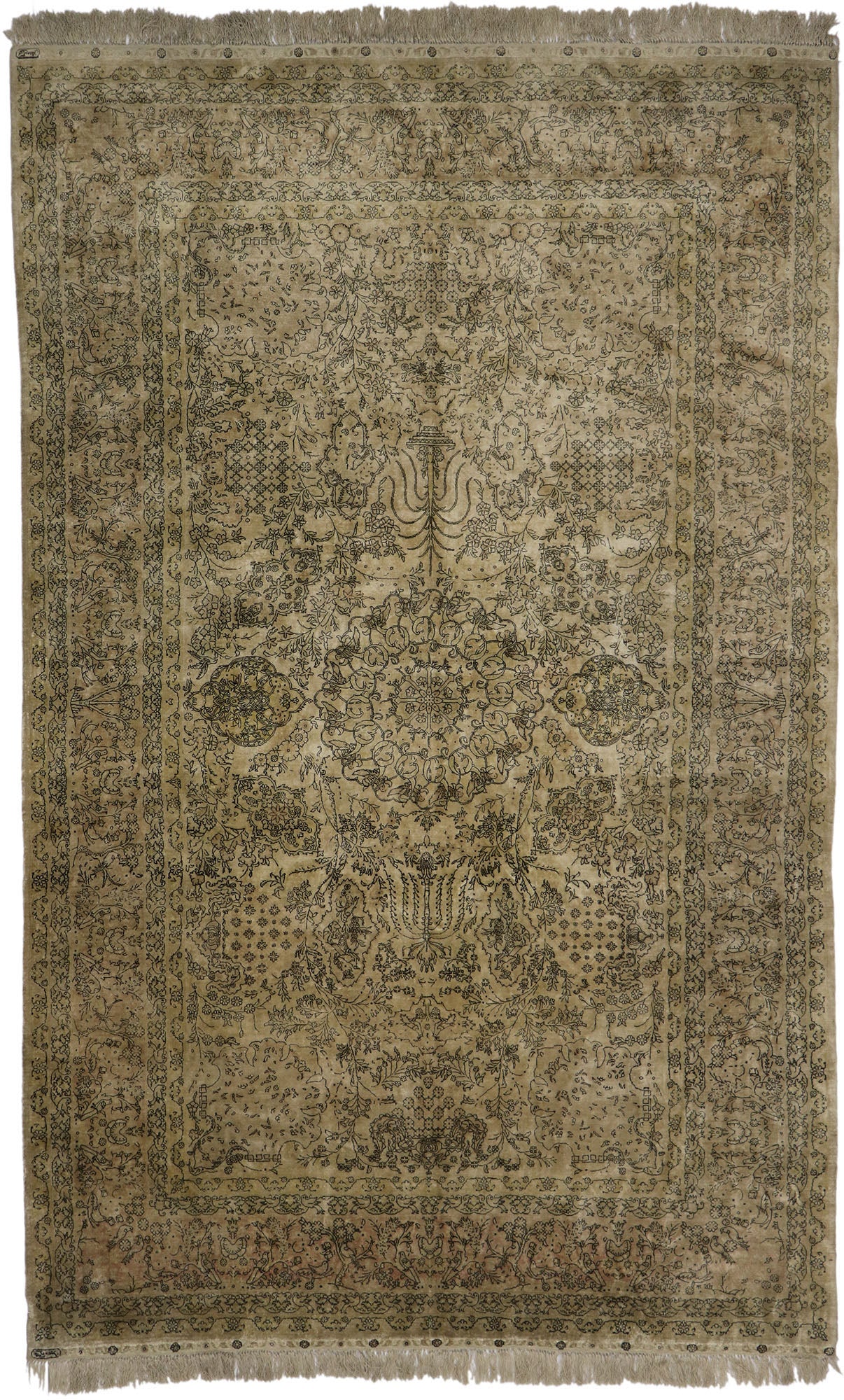 21685 Vintage Turkish Silk Hereke Rug with Art Nouveau Style 05'01 x 08'00. Warm and inviting with incredible detail and texture, this hand-knotted silk vintage Turkish Hereke rug charms with ease. Taking center stage is an open concentric round medallion decorated with rosettes, boteh, paisley, stylized florals, acanthus vine scrolls, and arabesque vines. The all-over botanical pattern composed of an array of opulent frondescence, cartouche motifs, hyacinth, star flowers, cloudband motifs, delicate florals and foliage. An elegant cartouche peeks from the delicate corner spandrels. It is enclosed with a complementary botanical border flanked with a double inner and outer floral meander guard band. With its ornate pattern, dazzling finish and warm earth-tone colors, this silk Hereke rug emanates so much character and will boost the coziness factor in nearly any space. Rendered in variegated shades of tan, sand, ecru, camel, khaki, biscotti, pale rose, and light sage with other accent colors. Perfect for a living room, bedroom, dining room, drawing room, private library, great room, wine cellar, executive suite, conservatory, state room, royal suite, hotel lobby, music room, golf locker room, billiards room, clubhouse, home office, master retreat, private Chambers, studio, study, loft, lounge, music room, entertainment parlor, trophy room, sunroom, den, mudroom, or sitting room. Iconic in its styling, it would be well-suited for a wide range of interior styles including Art Nouveau, Cotswold Country, London Proper, Southern Living, Artisan, French Cottage, Shaker, Amish, Puritan, English, Rustic, Artisan, Lodge, Cabin, Bungalow, Craftsman, Eclectic, American Colonial, Eastlake, Aesthetic Movement, Traditional, Swedish Farmhouse, Belgian, French Country, shabby chic, Contemporary, Urban, Flemish, Belgian, English Cottage, or Modern. Antique Wash. Abrash. Hand-knotted silk. Made in Turkey. Measures: 05'01 x 08'00.