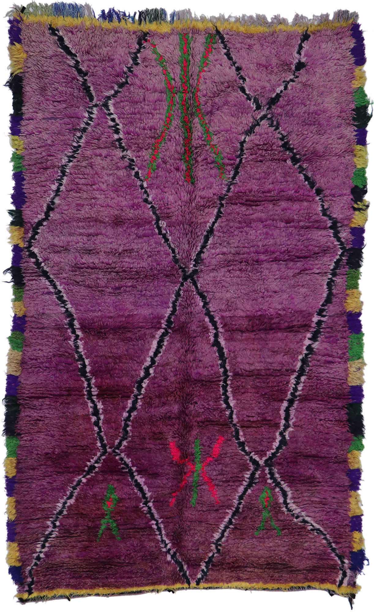 21521 Vintage Berber Purple Moroccan Rug with Bohemian Tribal Style 04'10 x 07'10. Showcasing a bold expressive design, incredible detail and texture, this hand knotted wool vintage Berber Moroccan rug is a captivating vision of woven beauty. The eye-catching diamond trellis and lively colors woven into this vintage Moroccan rug work together creating a truly unique look. The abrashed purple field features lines running from the top to the bottom crisscrossing in an organic manner, creating a handsomely asymmetrical lozenge trellis with a strong sense of dimensionality and a striking visual effect. It is enclosed with a color blocked border. Historical richness and full of Ancient Berber symbolism, this vintage Moroccan rug features traditional symbols of protection and femininity in the central area while the borders along the vertical sides traditionally represent the male's presence. In Moroccan rugs, male motifs often appear on the outer portions of the composition, framing and enclosing the female motifs. This presentation can be seen as symbolizing fertility, as well as protection and the sanctuary of the family. The amalgamation of colors harmonize one another, creating the perfect design and emanating function and versatility while staying true to the authentic spirit of Berber Tribe culture. Rendered in variegated shades of purple, grape, navy blue, royal blue, light green, yellow, lavender, green, plum, hot pink, and grape with other accent colors. Perfect for a living room, bedroom, dining room, children's area, nursery, drawing room, private library, billiards room, clubhouse, home office, master retreat, private Chambers, wine cellar, executive suite, conservatory, royal suite, hotel lobby, music room, studio, study, loft, lounge, entertainment parlor, trophy room, or sitting room. Well-suited for fashion-forward homes, eclectic interiors, and a variety of styles: Tribal, Boho Chic, Bohemian, Abstract, Expressionism, Cubism, Surrealism, Postmodern, Memphis Design, Modern, Contemporary, Eclectic, Modern Mexican, Artisan, Lodge, Cabin, Rustic, Retro, Art Moderne, International, Nomadic, Mid-Century Modern, Hygge, Mys, Mysigt, Industrial, Urban, and Loft. Berber Tribes of Morocco. Abrash. Hand-knotted wool. Made in Morocco. Measures: 04'10 x 07'10.