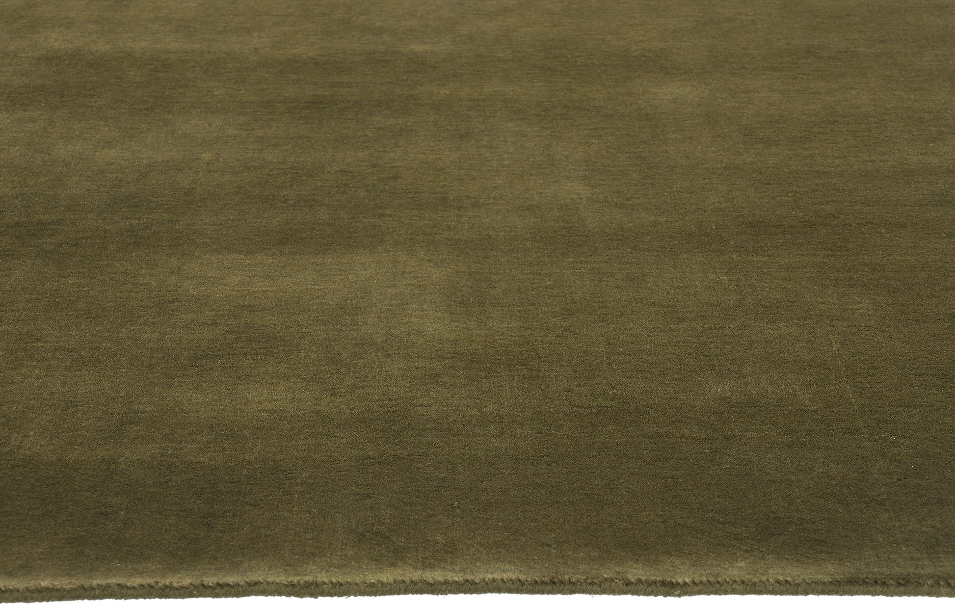 This Solid Olive Green Modern Area Rug perfectly marries biophilic design with an earthy, sophisticated aesthetic. Handcrafted with exquisite detail, its rich olive green color, interwoven with shades of Spanish moss, evokes the serenity of tranquil landscapes. The soft gradations and tonal variations across this modern Indian rug add depth and texture, capturing the essence of nature's subtle beauty.
