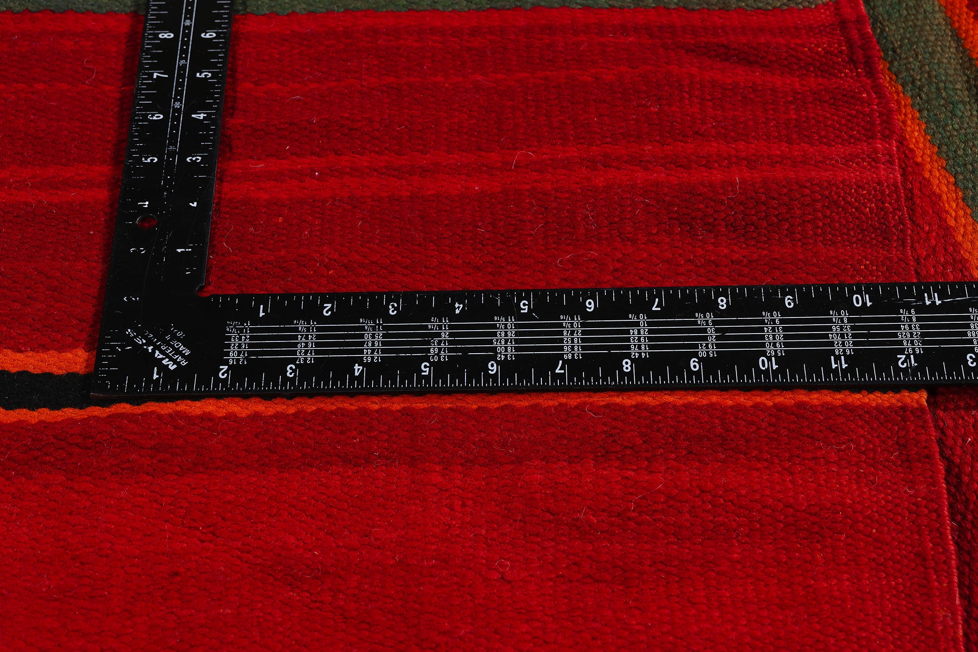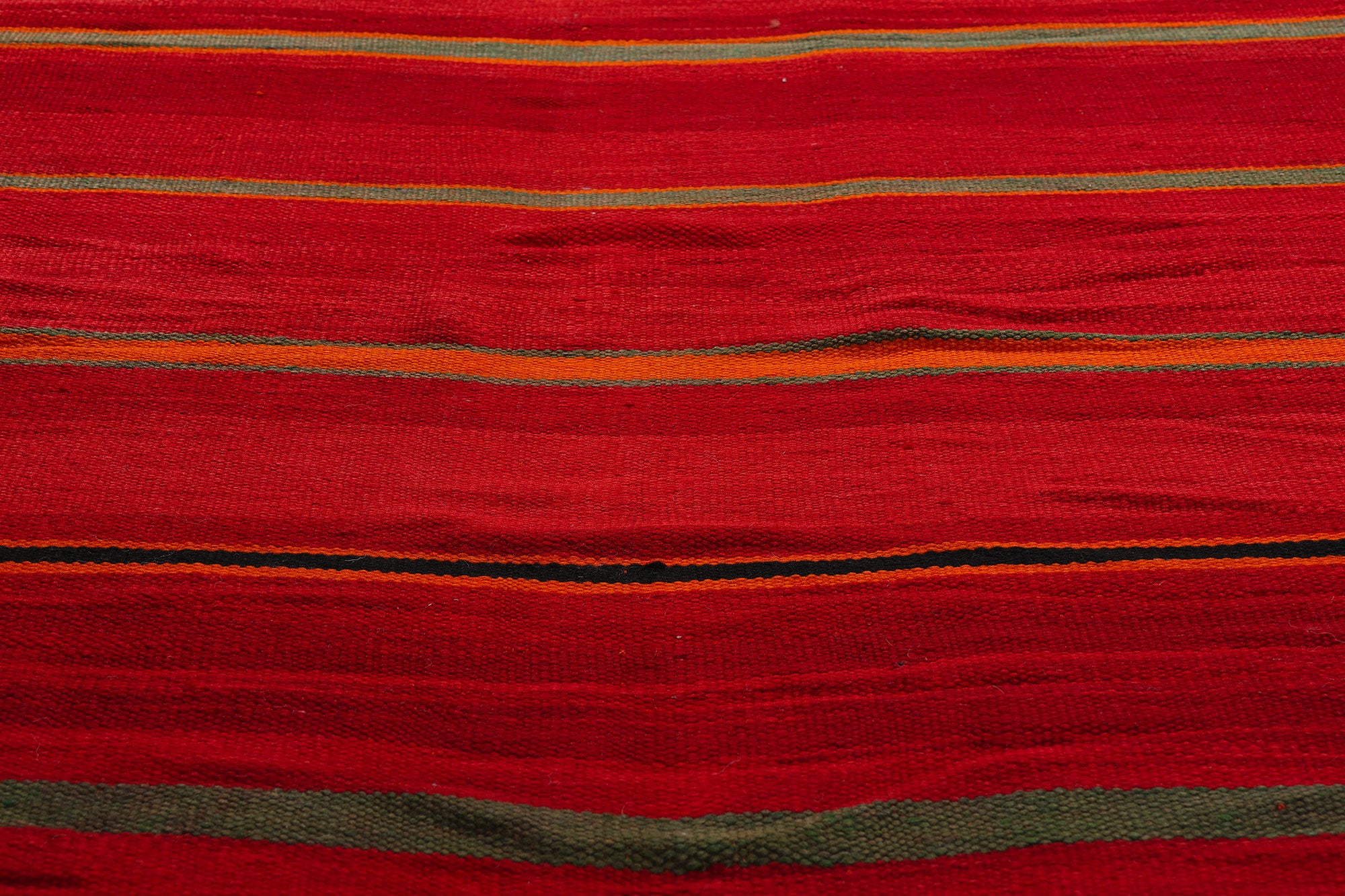 Bathed in brilliant tones of crimson and flame, this handwoven wool vintage Moroccan kilim rug radiates an aura of exclusivity and prestige. Its bold striped composition, rendered in rhythmic bands of red, orange, and subtle accents of green and black, is not just a study in color but a celebration of Moroccan weaving heritage. To the discerning collector, such a piece is more than décor—it is a statement of cultivated taste, a woven treasure that embodies rarity, refinement, and the timeless spirit of Berber artistry.
