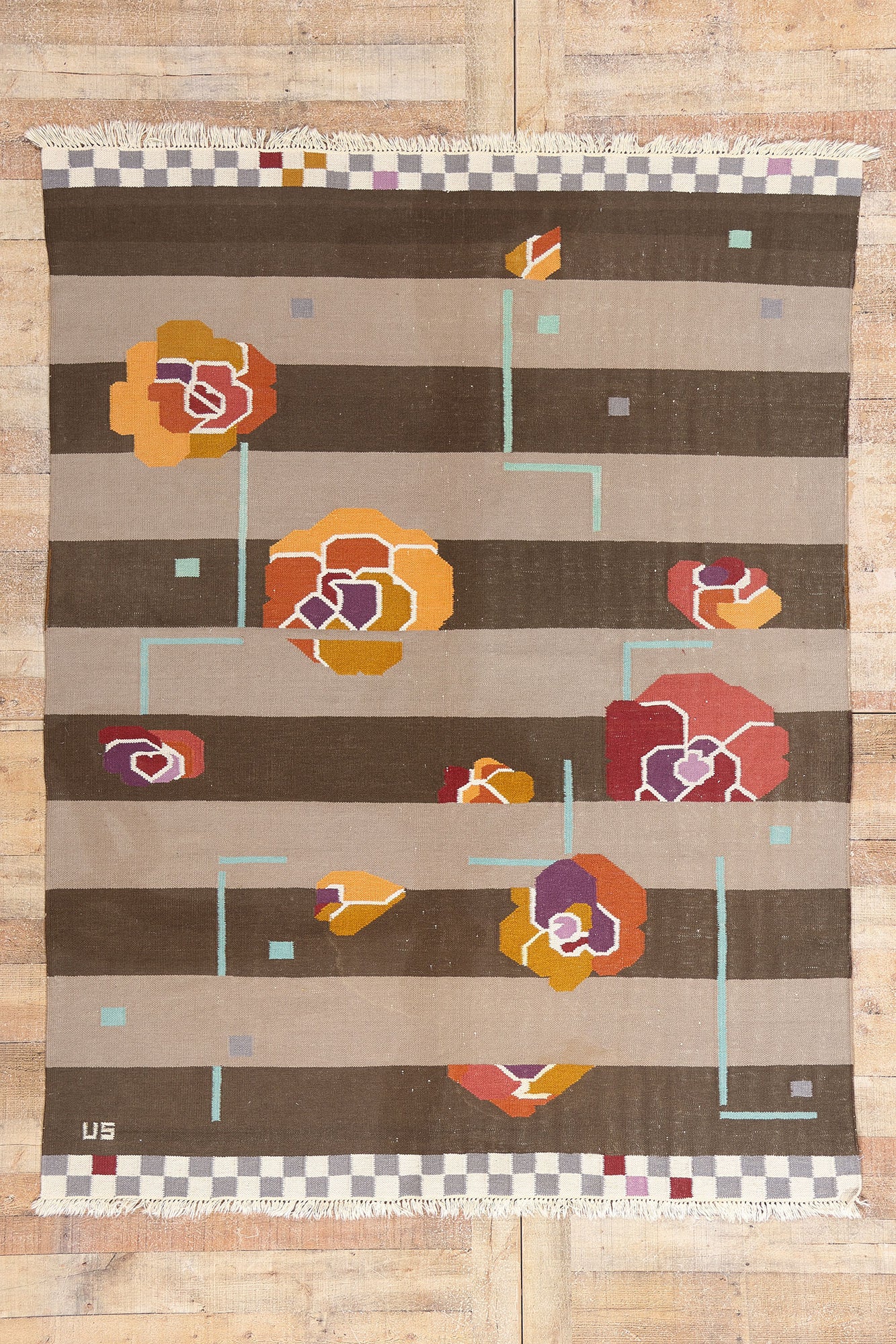Woven in the golden age of Scandinavian Modernism, this exceptional vintage Swedish rollakan—signed by the noted textile designer Ulla Schumacher (“US”)—embodies the alluring fusion of Nordic restraint and artistic daring. Its presence alone suggests a cultivated eye: the kind of heirloom that quietly telegraphs connoisseurship while elevating the surrounding architecture. Schumacher’s work is coveted precisely because she distilled the Scandinavian ethos into something fresh, urbane, and unapologetically modern. Here, every detail reflects that signature refinement.