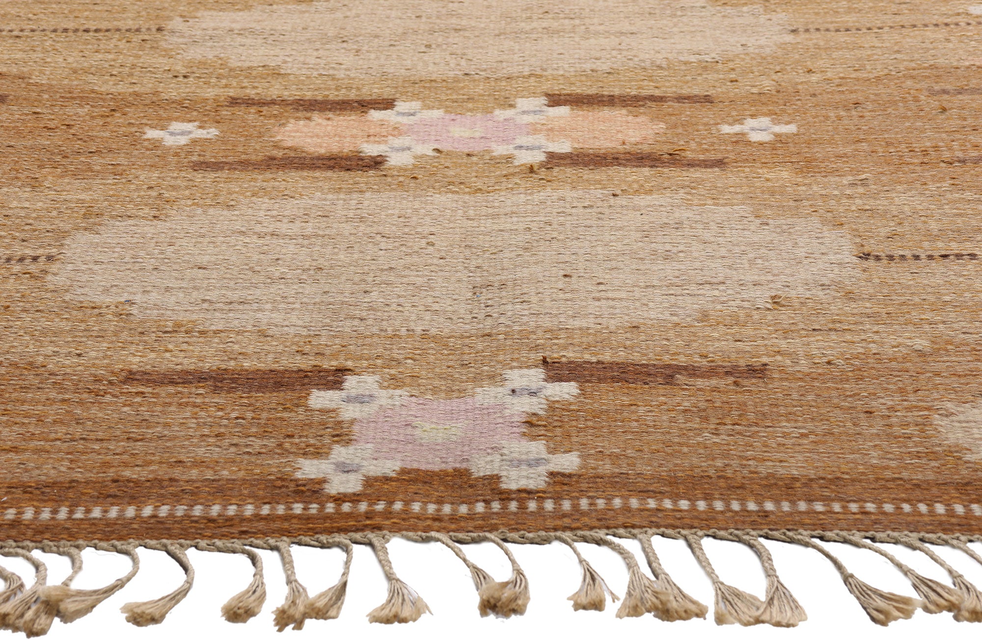 This handwoven Swedish rollakan by the celebrated Gitt Grännsjö-Carlsson is one of those rare Scandinavian treasures that immediately announces its pedigree. Its palette—sun-kissed ambers, honeyed ochres, and the softest blush florals—feels like the glowing light of a Nordic summer evening distilled into textile form. Every nuance of color has that refined restraint and poetic warmth that collectors covet, the kind of organic harmony that signals both exceptional craftsmanship and impeccable artistic intuition.