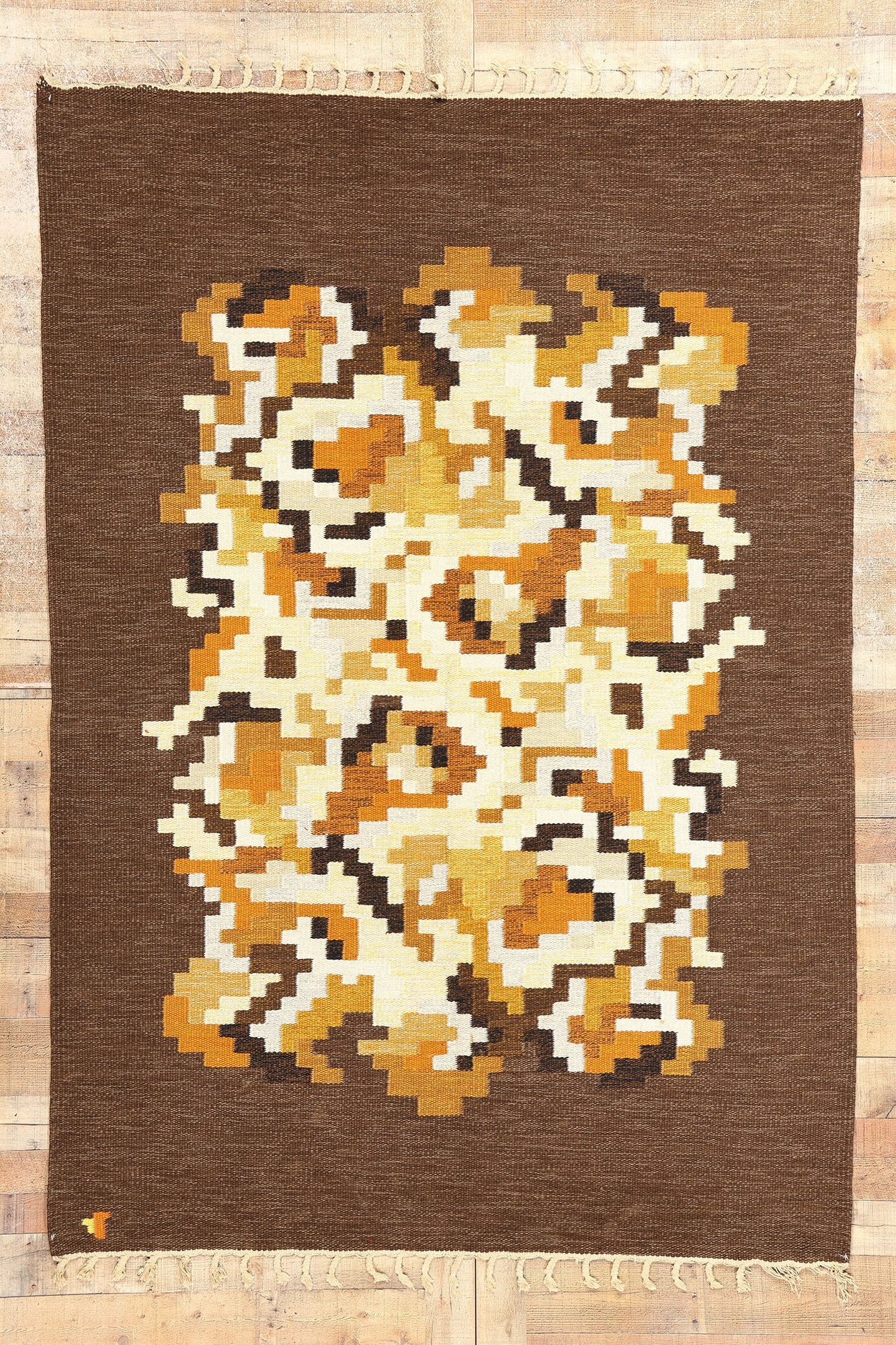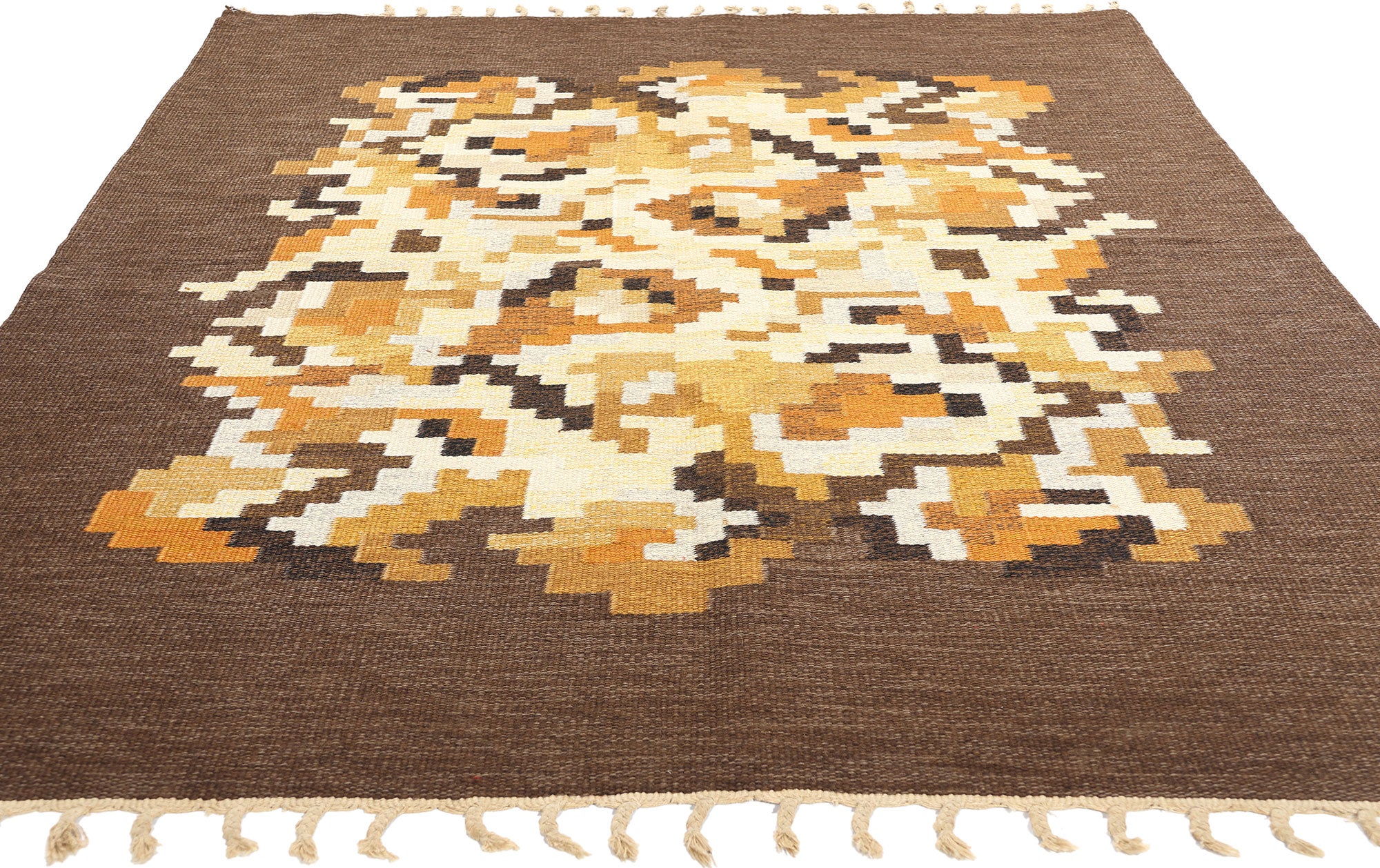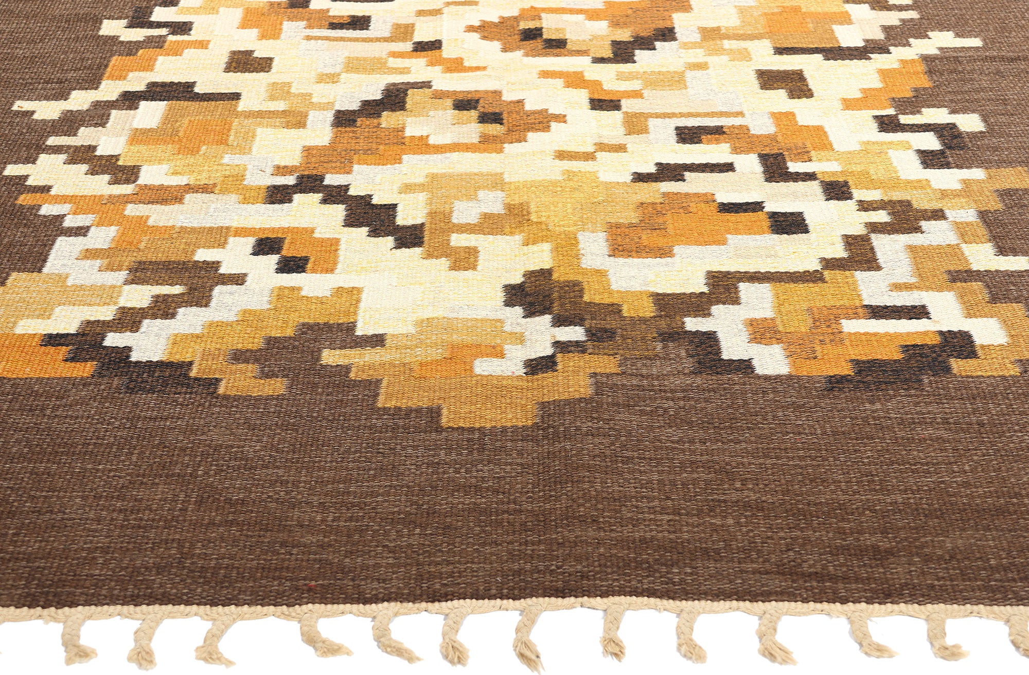 This handwoven wool vintage Swedish rollakan rug, known as Model Korall brun, was designed by Erik Lundberg for Vavaregarden in Sweden, emanating warmth and charm. With its bold expressive design and meticulous attention to detail, the rug stands as a captivating example of woven beauty. The abrashed brown field serves as a canvas for an abstract composition of rectilinear shapes, evoking a strong sense of dimensionality and depth. Lundberg's skillful arrangement transforms the organized chaos into an artistic expression, enhancing the rug's visual impact and allure.