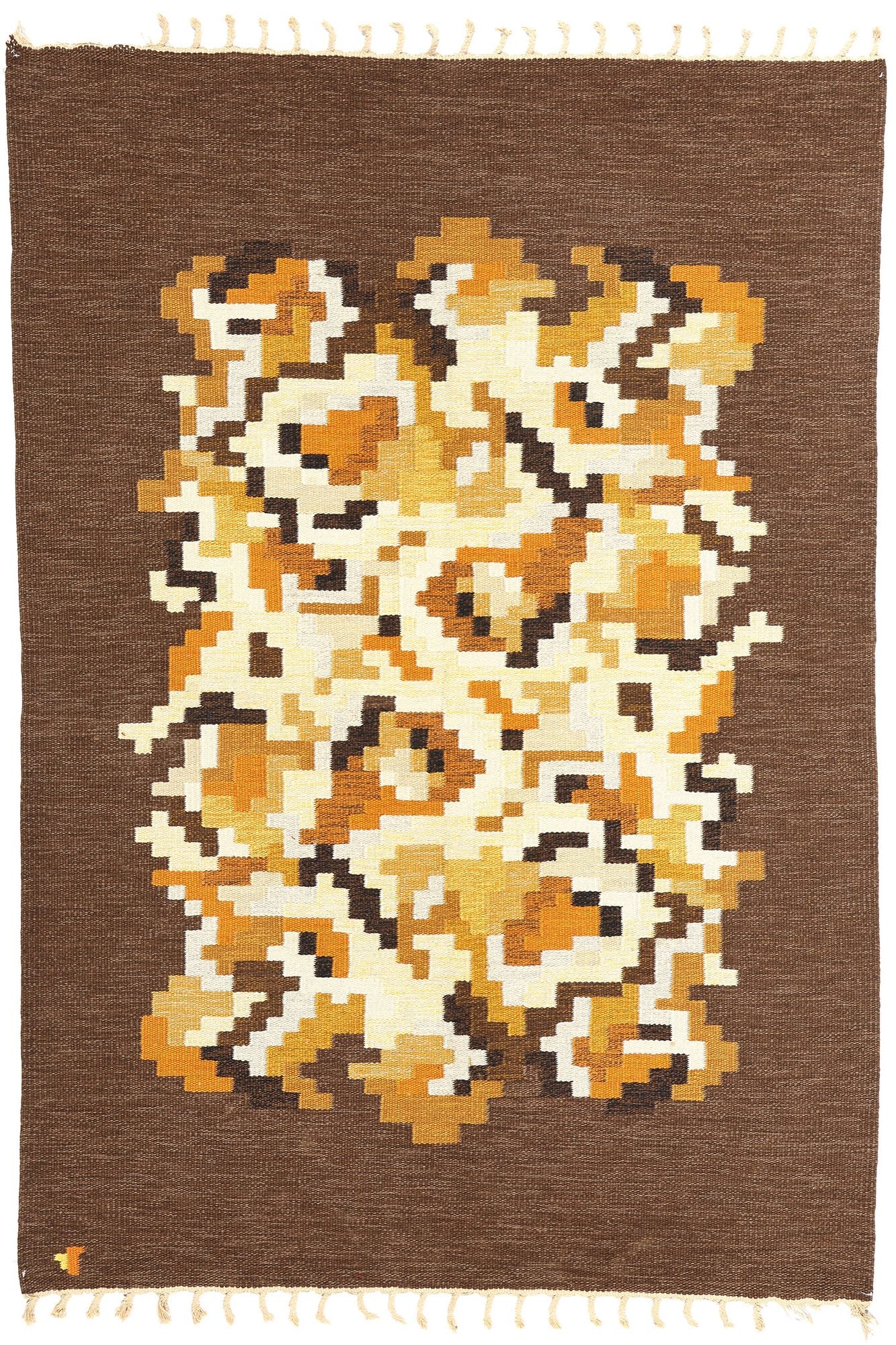 Erik Lundberg, a Swedish weaver behind the firm Vavaregarden, which translates to Weavers Farm, employed local weavers in Malmo during the 1960s to produce hand-woven flat-weave "rolakan" rugs, though his role as a designer versus businessman remains uncertain. Subsequently, Lundberg's rugs attracted the attention of Svangsta Mattor AB, leading to the acquisition of his firm and its relocation to Eringsboda. Lundberg's daughter, Gertie, joined the company as a designer in the mid-1960s and later became its artistic director. The firm, known for manufacturing rugs and scenic wall-hangings, continues to produce many of Lundberg's designs today, with challenges in determining their age due to ongoing production. Vavaregarden's symbol, resembling a "V," is actually a two-toned T shape inspired by a tree outside the studio window and is woven in colors matching each rug, aiding in identifying the rug's orientation.