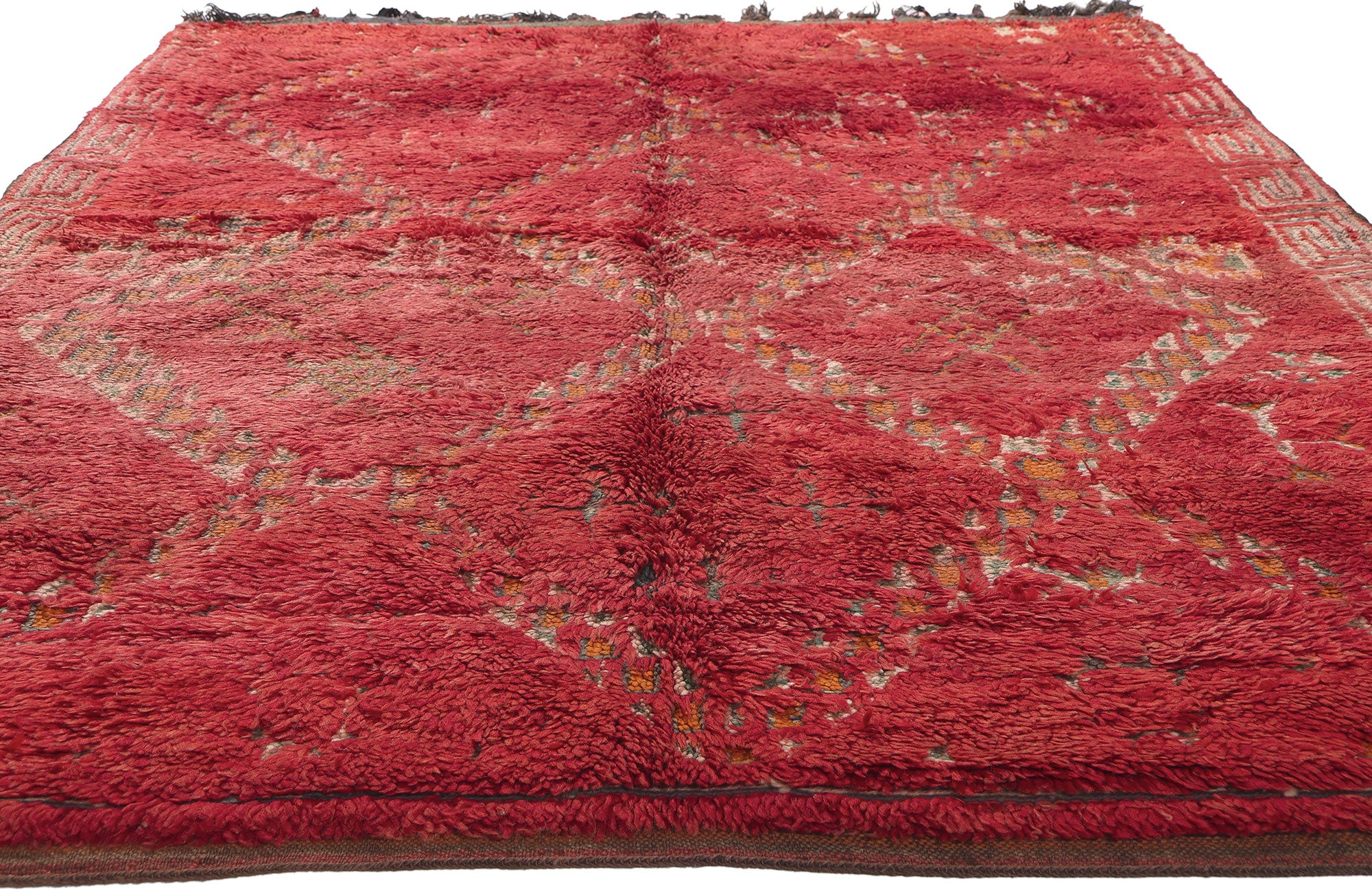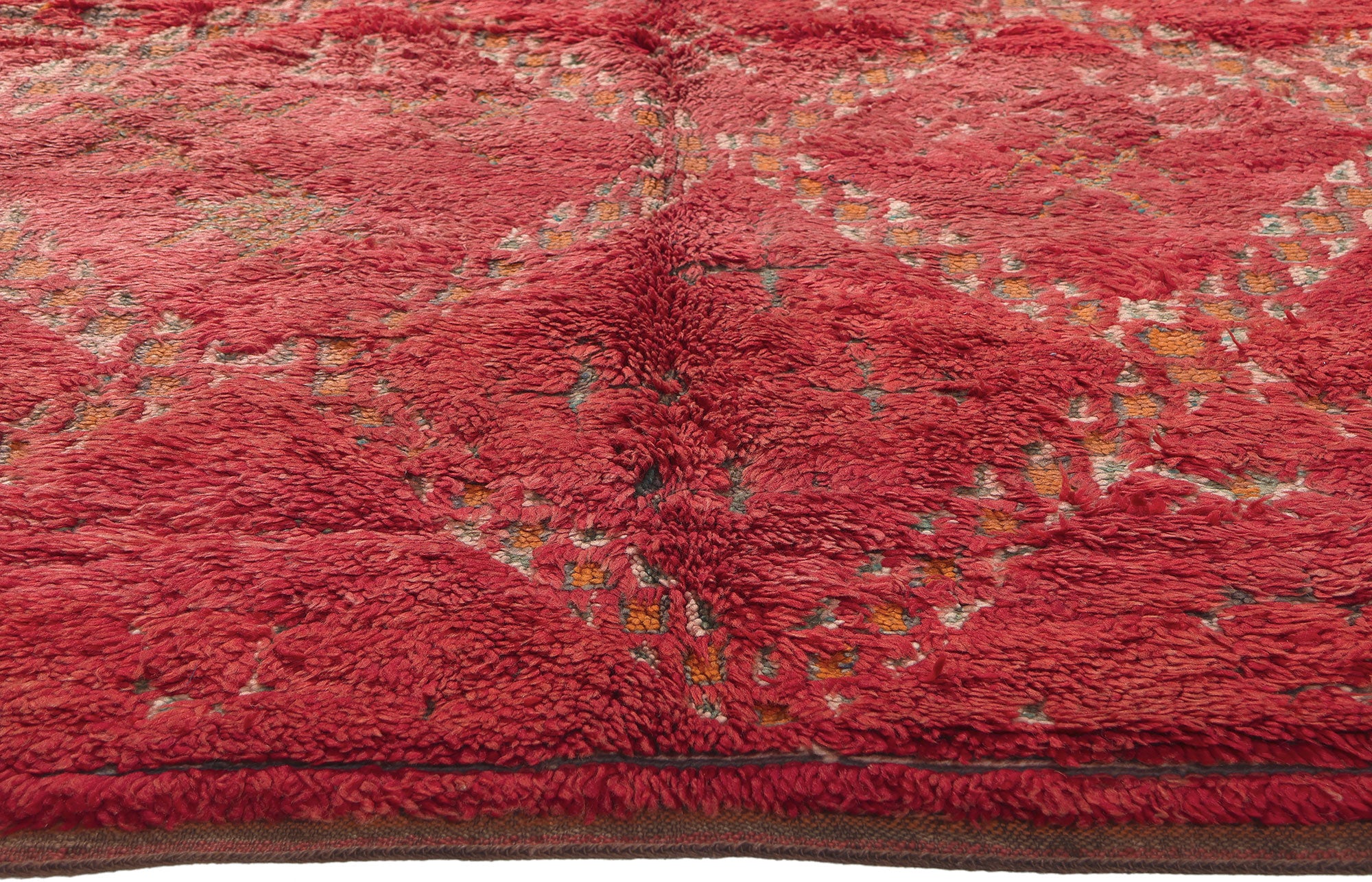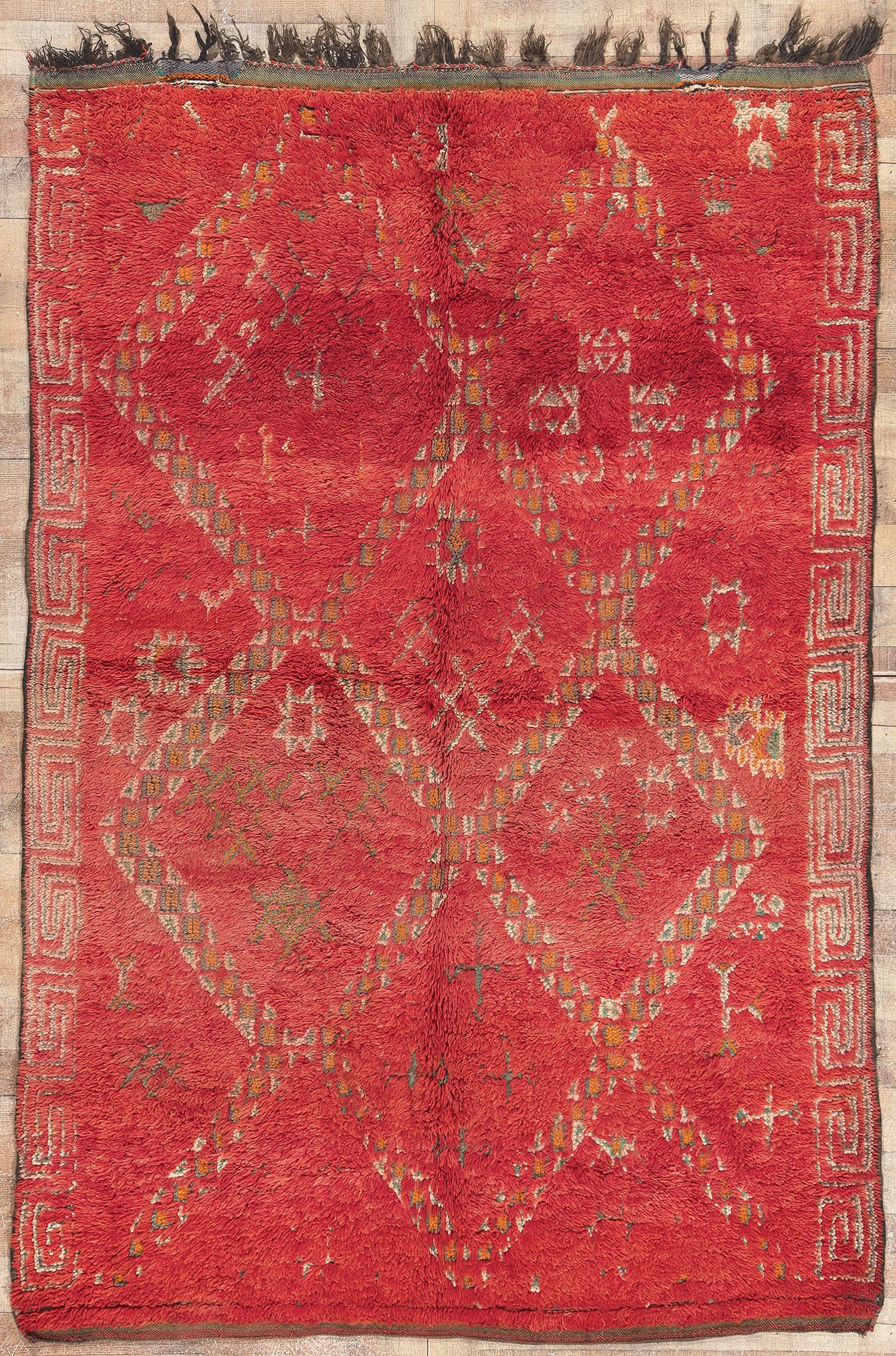 In this hand-knotted wool vintage Beni MGuild Moroccan rug, embrace the fusion of bold bohemian aesthetics and Midcentury Modern style. The intricate diamond design and vibrant colors woven into this piece collaborate seamlessly to evoke an ultra-cozy ambiance. The abrashed red field serves as the canvas for a lozenge lattice adorned with ambiguous motifs and tribal symbols, adding layers of visual intrigue. Framing the composition is a Greek key meander border, a hallmark of Midcentury Modern design, lending a touch of geometric elegance to the Moroccan rug's boho charm. Step into the captivating intersection of two distinct styles, where each element contributes to the rug's unique visual narrative.
