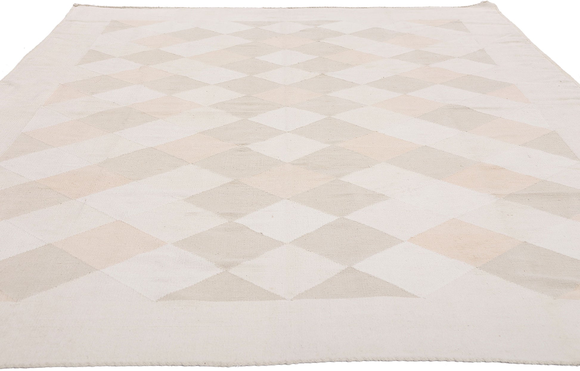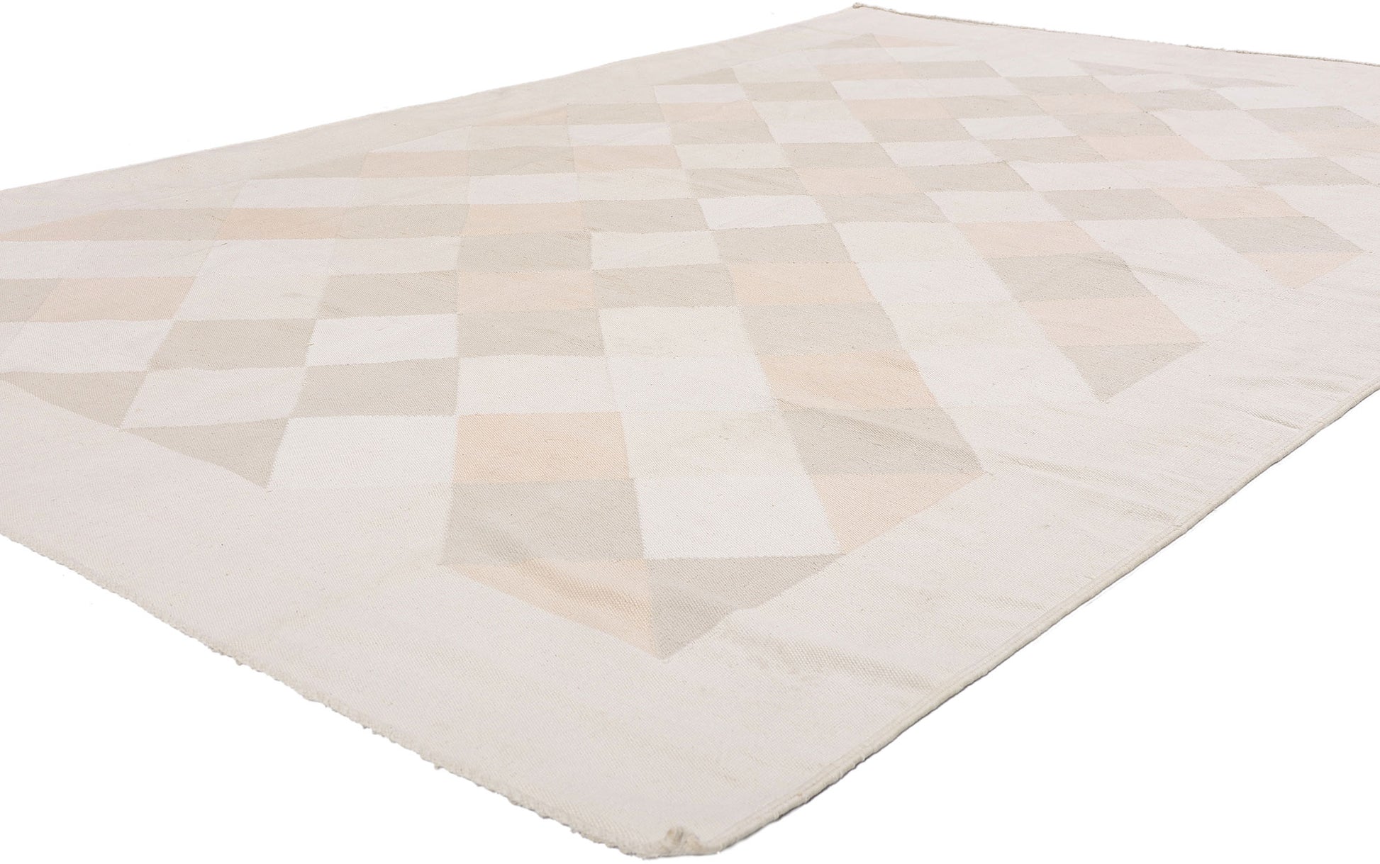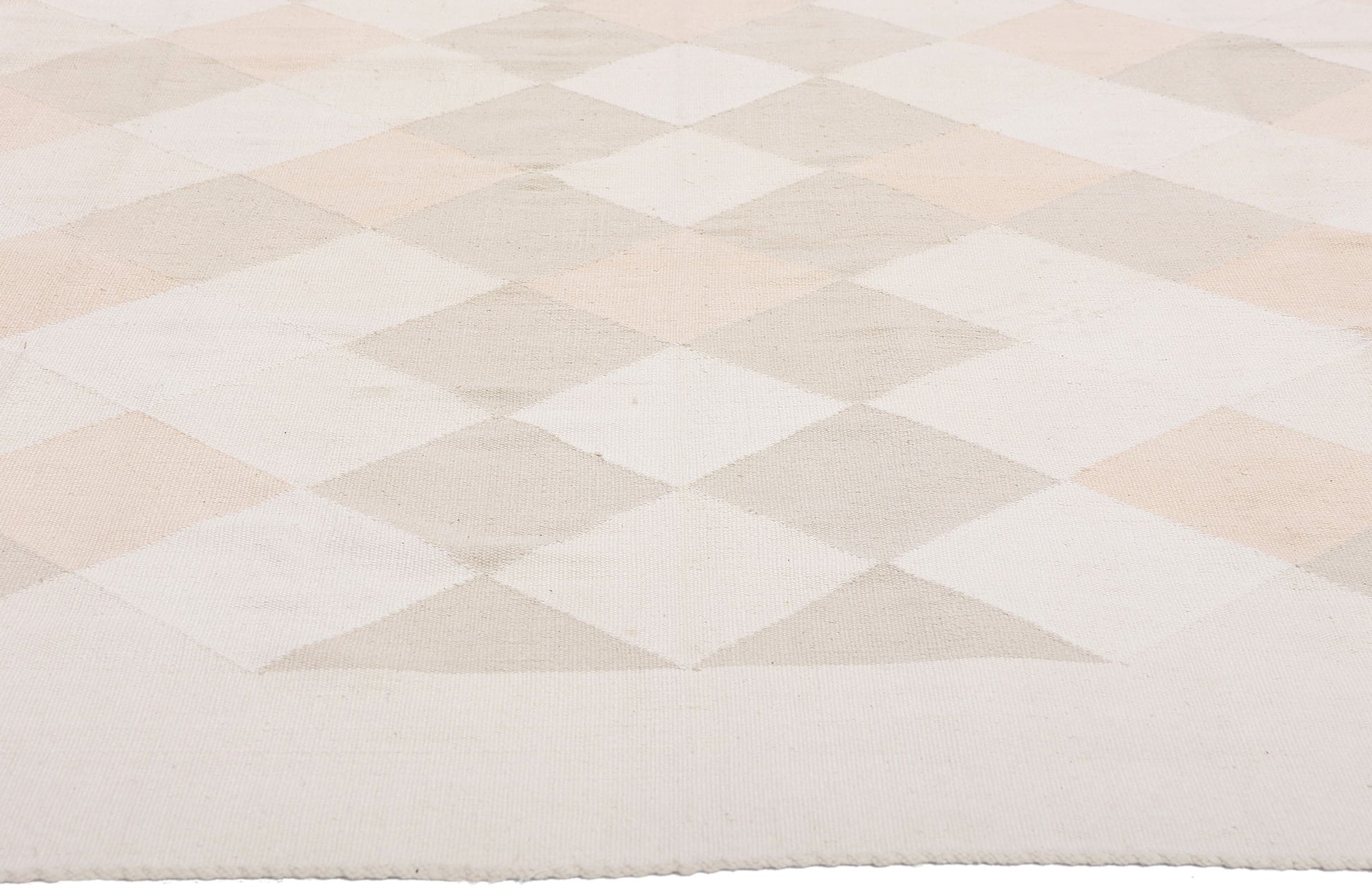 What elevates this exquisite work of art into the realm of true collectible design is its remarkable balance between structure and softness. The geometry carries echoes of early 20th-century functionalist ideals—an Organic Bauhaus sensibility translated through the warmth of handwoven cotton. Yet it remains entirely grounded in natural harmony, its muted palette and gentle abrashed tonal shifts reflecting the philosophy of Shibui: understated elegance, quiet complexity, and enduring beauty. This duality—architectural precision softened by artisanal nuance—imbues the rug with a sense of intellectual and aesthetic prestige.