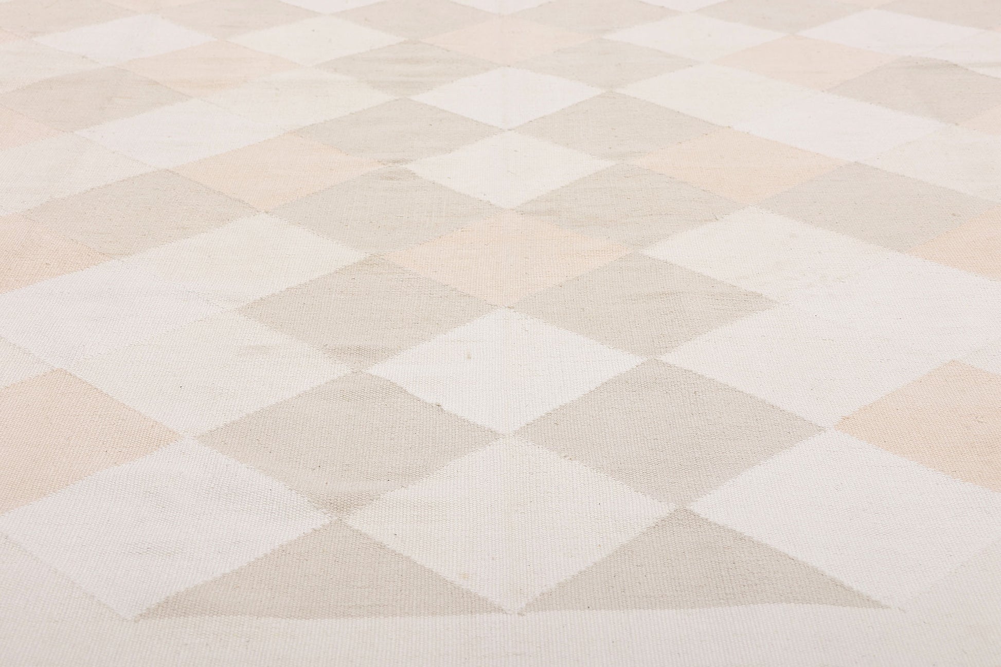 Woven by hand in India, this vintage cotton Dhurrie reveals a rare and deeply cultivated sense of restraint—an artistry that whispers rather than declares. Its softly modulated field, composed in shades of beige, sand, champagne, and warm taupe, evokes the quiet luxury of natural materials aged to perfection. This is not merely a rug, but an atmosphere—an invitation into a world where refinement is measured in nuance, and beauty is discovered slowly, in layers of tone and texture.