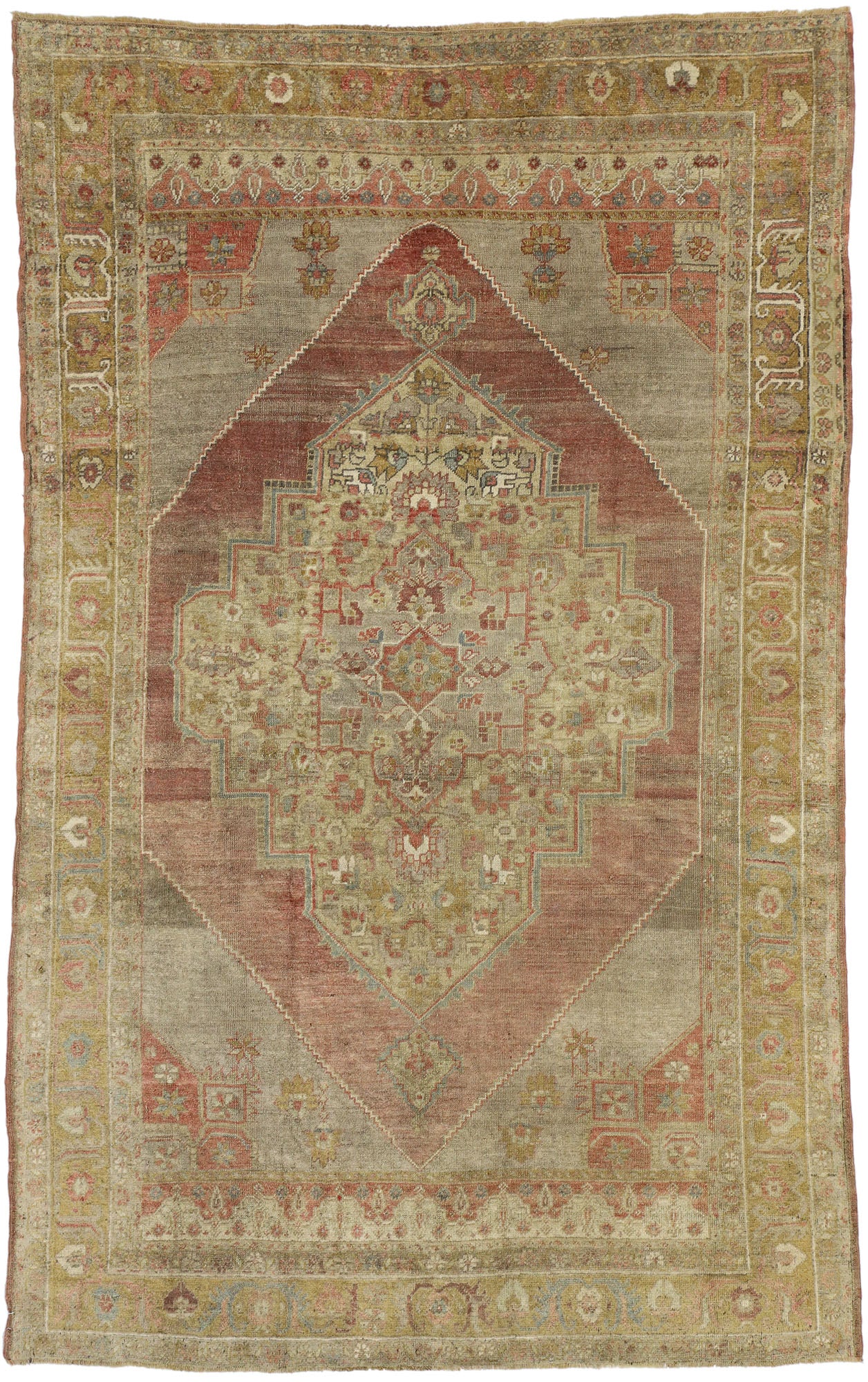 Soft and sumptuous, this hand knotted wool vintage Turkish Oushak rug with Jacobean style brings regal allure and rusticity to any interior it graces. Gentle abrash gradations appear throughout, adding to the casual aesthetic. Yet, the traditional formality of its grand medallion and elaborate spandrels lend a more Jacobean flair. This charmingly distressed vintage Oushak rug with Jacobean Style is incredibly versatile and looks just as ravishing in a Parisian loft along the Left Bank as it would in a re-purposed farmhouse in the countryside. Cherish this vintage Oushak rug flair for years to come.