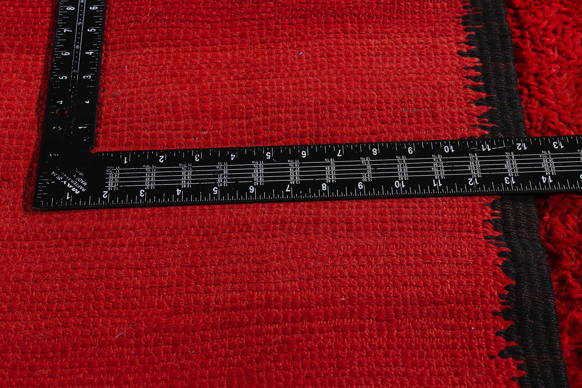 This striking vintage Beni Mrirt rug is a masterpiece of both bold restraint and spiritual symbolism, hand-knotted by the Berber tribes of Morocco in the High Atlas Mountains. Its radiant red field—deep, plush, and saturated—feels like fire held in wool, a living expression of ancestral power and elemental beauty. Against this sea of vermilion, small lozenges of ember-orange are scattered like sacred embers, invoking motifs passed down through generations of oral and tactile memory. This is not mere décor—it is an artifact of cultural continuity and the quiet poetry of nomadic life.
