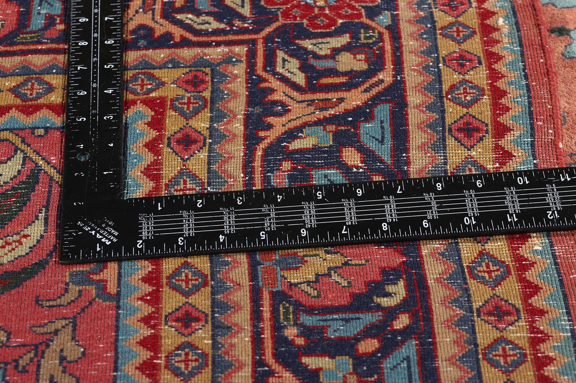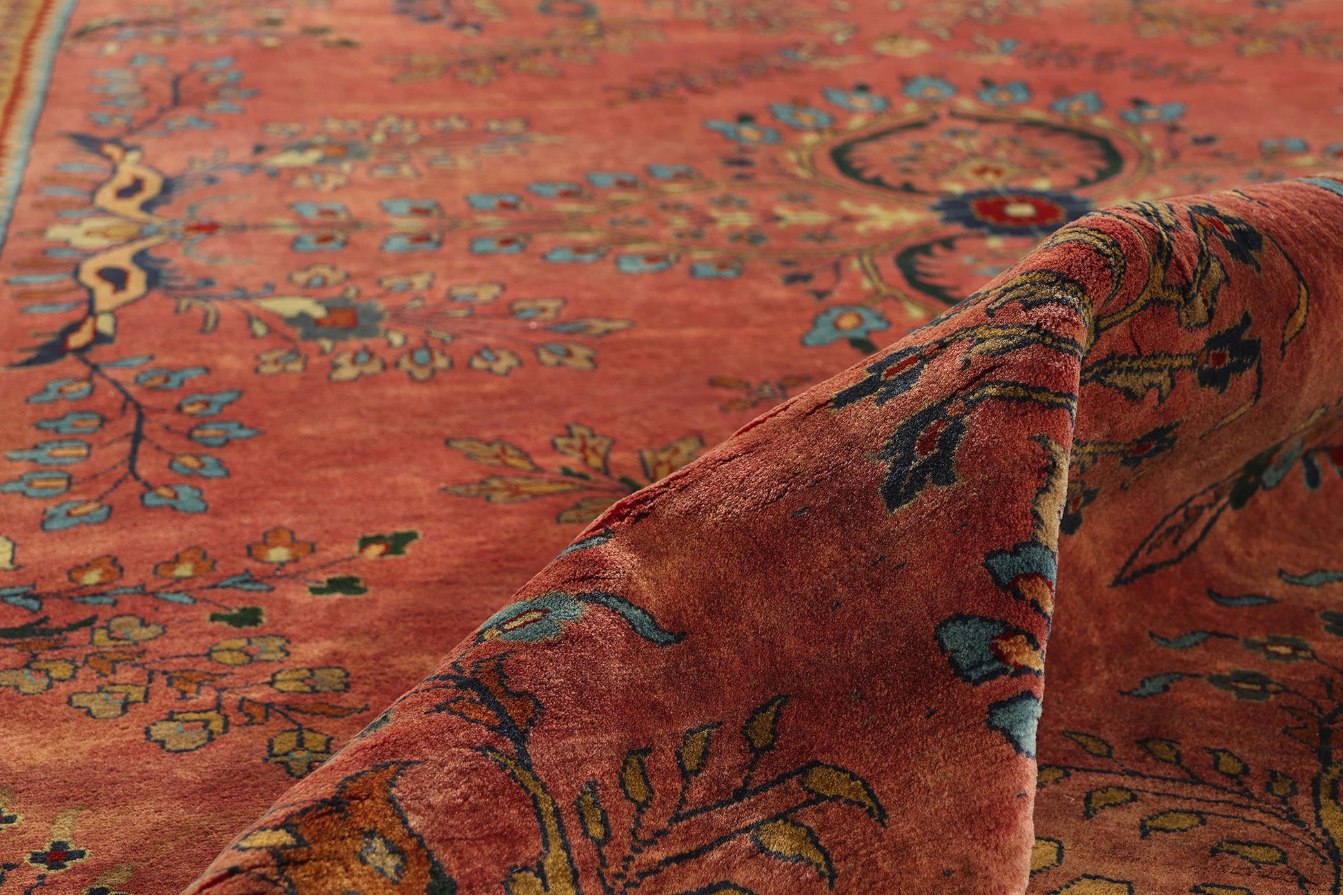 Woven in the heart of mid-20th century India, this hand knotted wool vintage Indian Sarouk rug stands as a luminous tribute to the grandeur of its Persian forebears while reflecting the evolving aesthetic of a globalizing world. Crafted during the 1950s or early 1960s, a time when Indian ateliers mastered the art of reinterpretation for Western audiences, this piece bridges continents through wool and warp. Its soft red field, softly abrashed by time and hand-dyeing technique, evokes a twilight orchard—the realm of fading blooms and whispered histories. Centered within this dreamy landscape is a gently radiating floral medallion, its form flanked by symmetrical sprays and mirrored bouquets, laid with courtly precision.