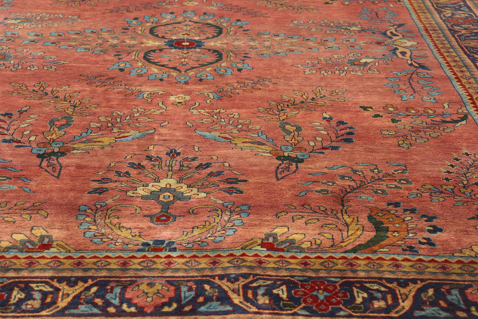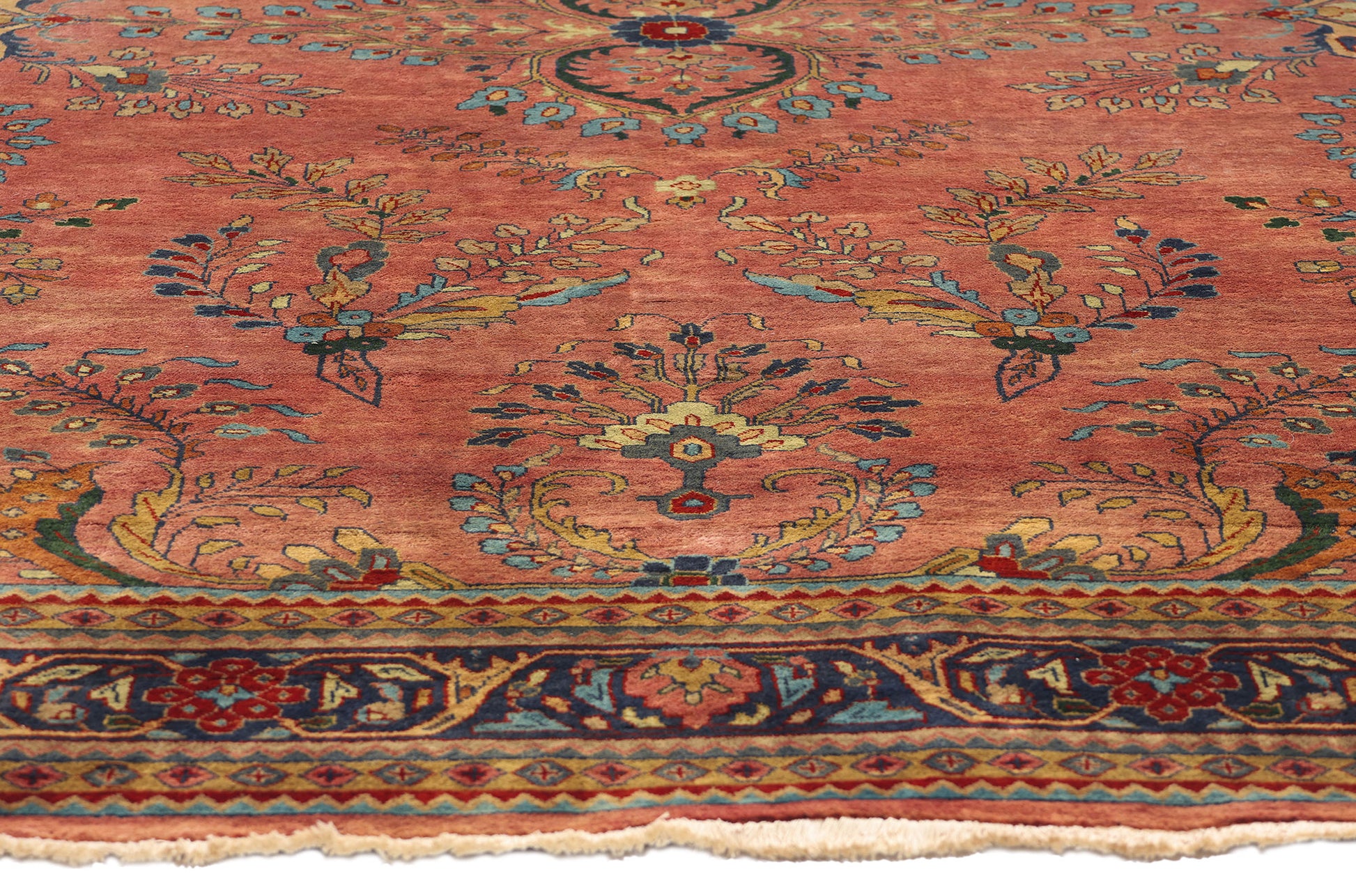 The design language, unmistakably Sarouk, carries echoes of the American market's demand for formal balance and restrained elegance. Curving fronds, stylized botehs, and teardrop palmettes meander gracefully across the field, forming a dense botanical constellation that feels both ornamental and serene. Rendered in a palette of rustic red, brown, sky blue, taupe, navy blue, and goldenrod, the motifs pulse with a painterly softness. These hues, derived from synthetic yet skillfully modulated dyes, conjure the palette of 20th-century romanticism—colors once favored in drawing rooms rich with floral upholstery, polished mahogany, and soft lamplight.