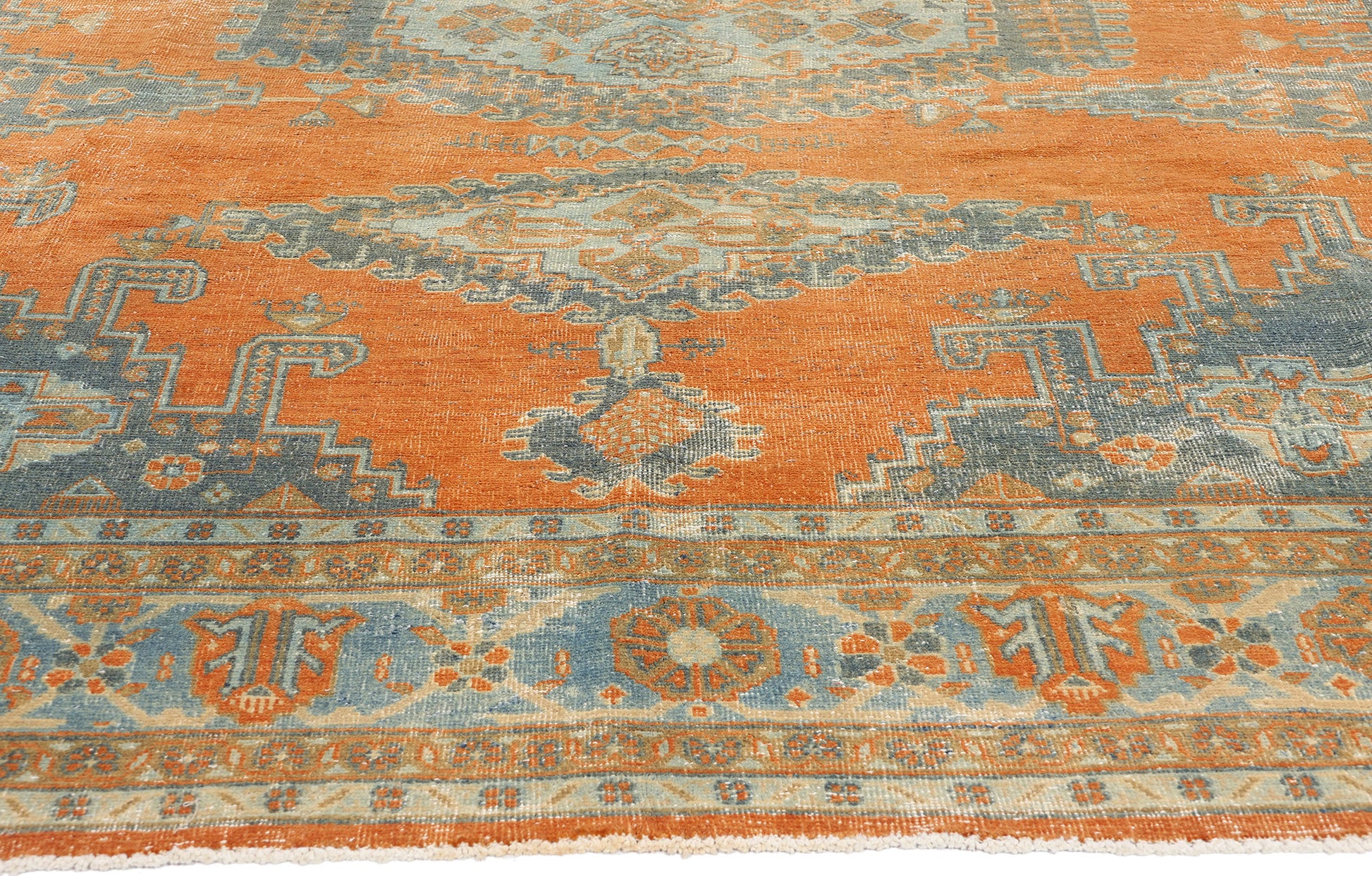 This hand-knotted wool distressed antique Persian Viss rug masterfully blends laid-back luxury with a modern rustic sensibility, offering a captivating glimpse into the artistic traditions of the Vist region in the Central District of Khansar County. The Persian rug’s antique-washed orange field radiates a sense of warmth, while its rich cultural and symbolic significance elevates it to an exceptional work of art. The central hooked hexagonal medallion, adorned with hooked lozenge pendants at either end, serves as the focal point, drawing the eye with its symmetrical elegance and compelling visual appeal.