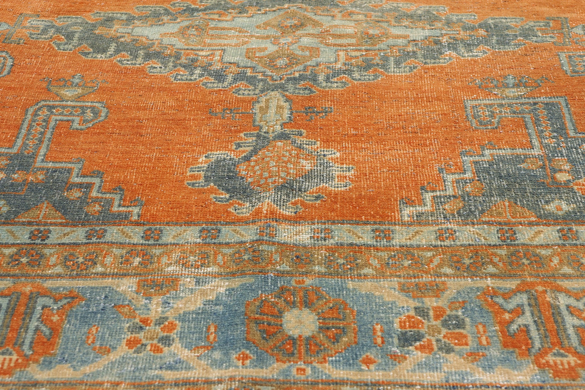The corner spandrels extend along the sides, creating a subtle inner frame filled with ziggurats, tree of life motifs, floral buds, and scorpion symbols. These intricate designs evoke a sense of continuity and harmony with nature, bringing a sacred and protective energy to the distressed Persian rug. The delicate balance of geometric patterns and symbolic motifs speaks to the mastery of the weavers, whose craftsmanship has woven history, spirituality, and nature into a single, timeless piece.