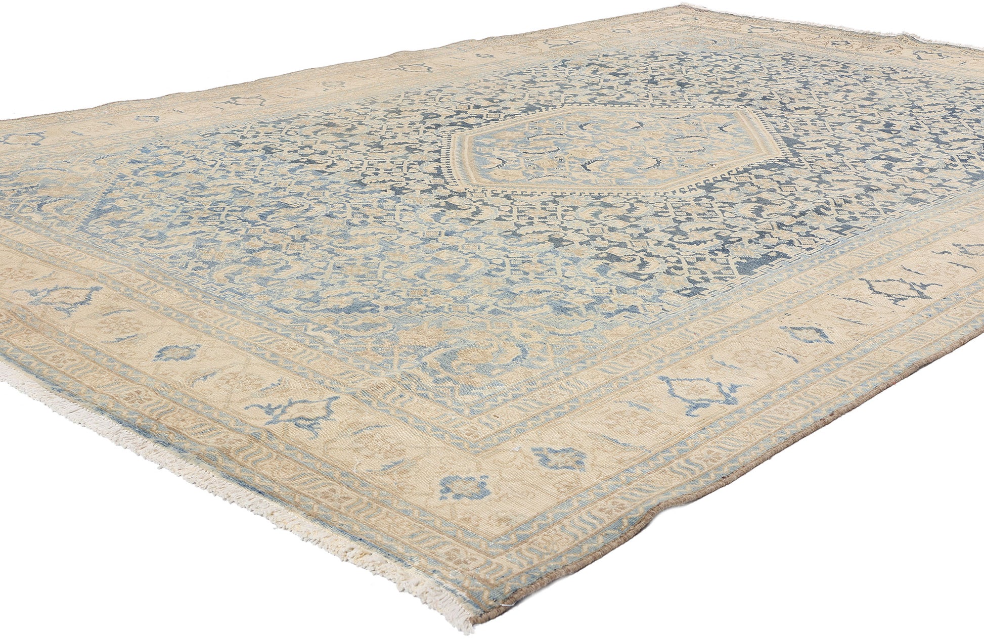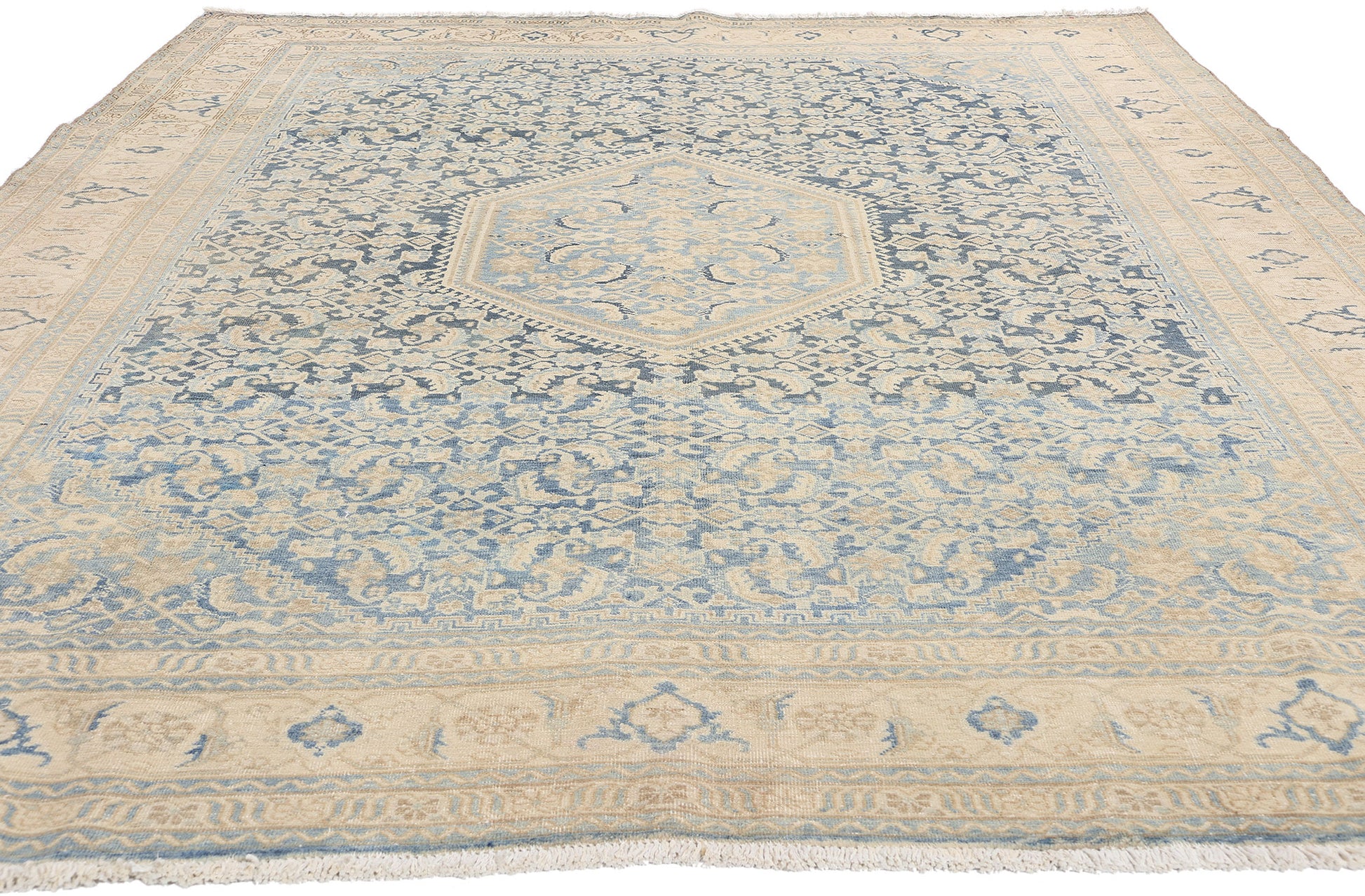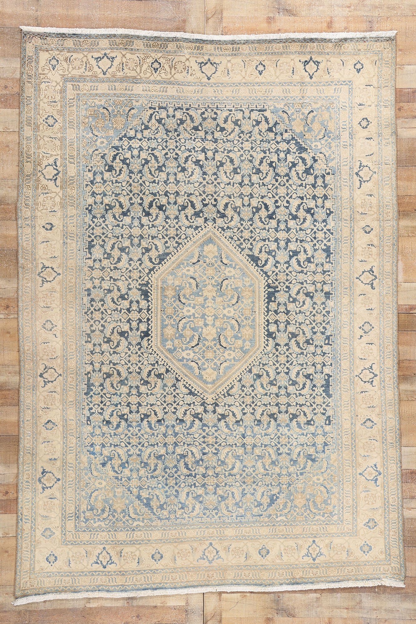 This hand-knotted wool distressed antique Persian Malayer rug effortlessly balances light and airy tones with a sense of relaxed refinement, making it a stunning example of time-honored craftsmanship. Its distressed composition, enhanced by an antique wash, exudes a weathered finesse that highlights its enduring beauty. The distressed Persian area rug invites you to appreciate its layered history and artistry while evoking a feeling of laid-back luxury. With its soothing palette and intricate design, this piece bridges the gap between nostalgic charm and quiet sophistication.