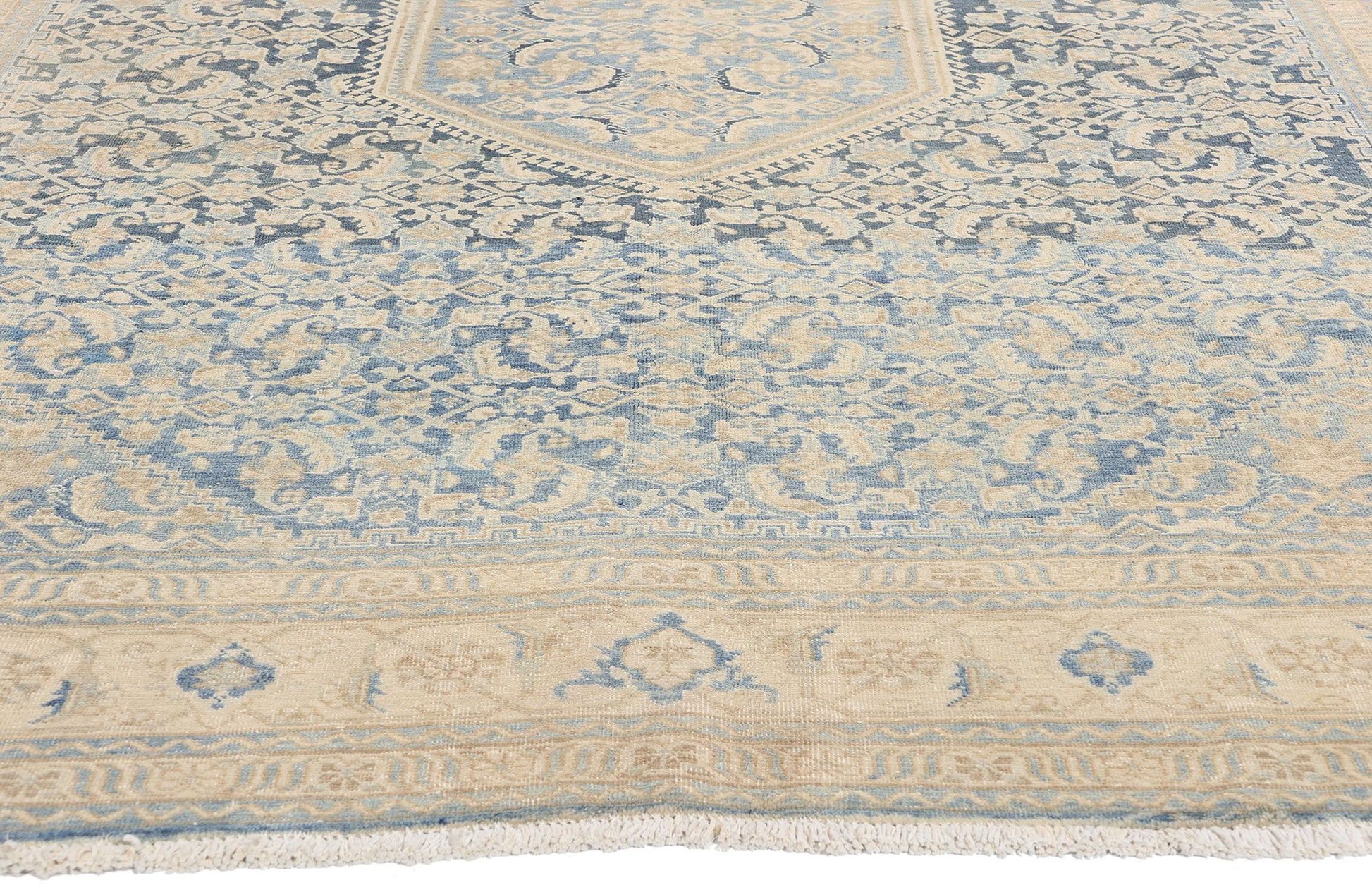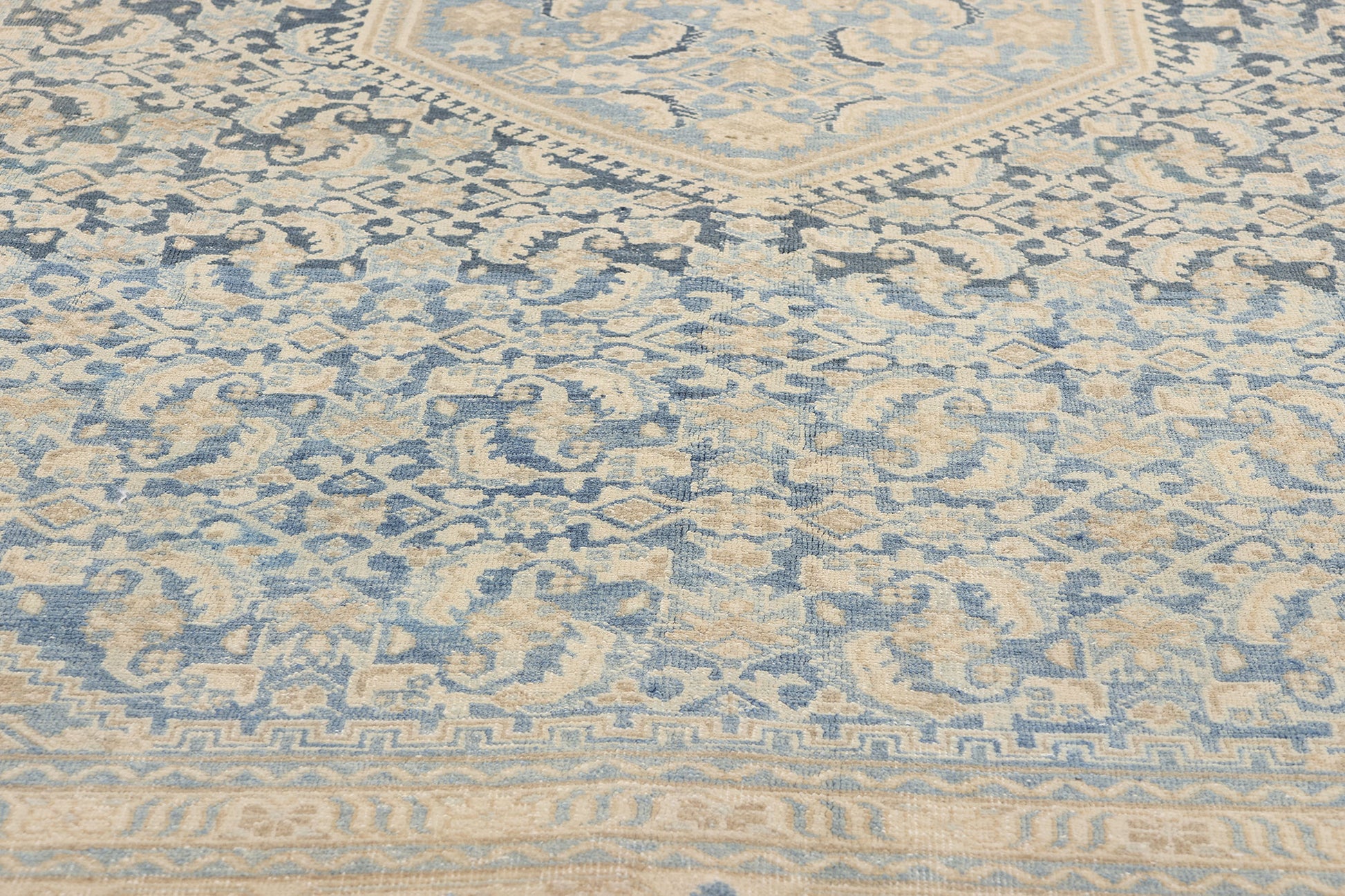 Taking center stage is a captivating light blue hooked hexagonal medallion, intricately decorated with the Classic Herati design. Also known as the Mahi or Fish pattern, the Herati motif is one of the most widespread and well-known Persian designs. Its composition features a flower centered in a diamond, surrounded by curving lanceolate leaves that resemble fish swimming in harmony. This ancient pattern, believed to symbolize fish rising just beneath the water’s surface to swim in the full moon’s reflection, imbues the rug with a sense of mysticism and cultural depth. The medallion commands attention while seamlessly blending into the allover geometric pattern of Herati motifs that dance across the richly striated blue field.