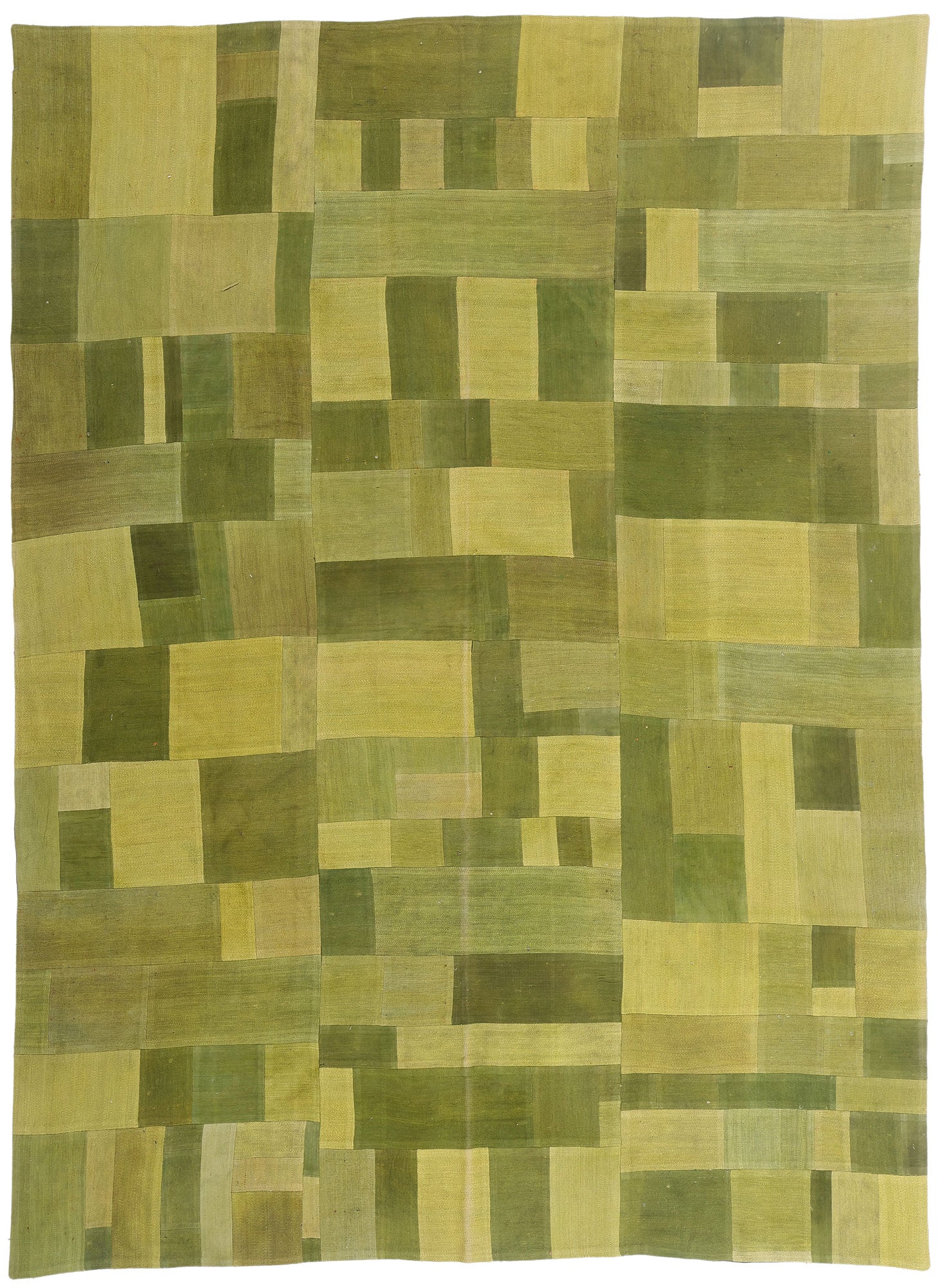 The exceptional design unfolds as a rhythmic mosaic of tonal greens, ranging from soft olive and moss to muted sage and golden lichen. These hues shift gently across the surface, creating a painterly composition that recalls the layered landscapes of nature—rolling hills, cultivated fields, and the quiet poetry of earth meeting sky. Each rectangular fragment holds delicate abrash and tonal variation, revealing the hand of the artisan and the passage of time, lending depth and authenticity that cannot be replicated.