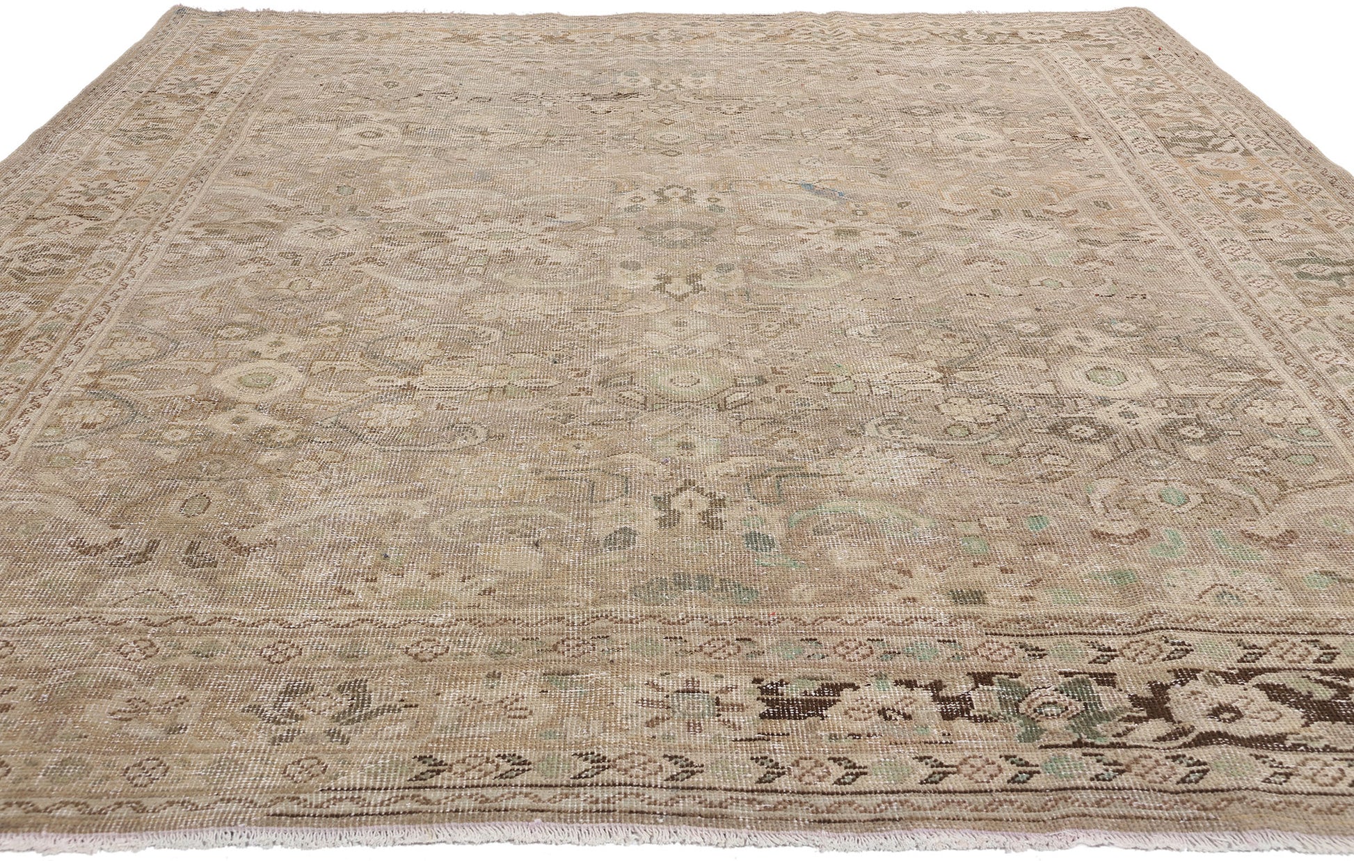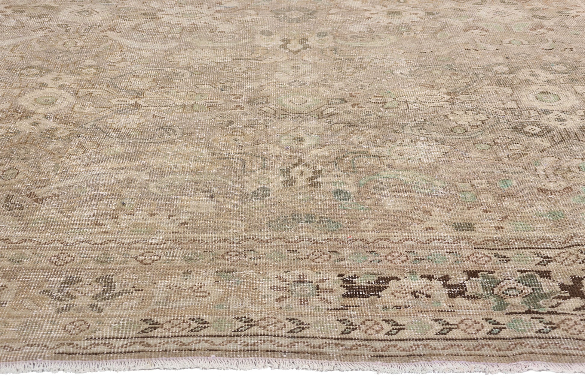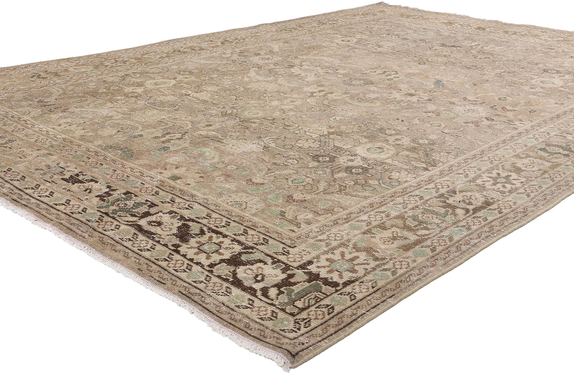 This hand-knotted wool distressed vintage Persian Mahal rug effortlessly merges biophilic design with modern rustic charm, creating a timeless piece that celebrates the enchantment of nature and artisanal craftsmanship. Its antique-washed palette, composed of soothing neutral earth tones, exudes an understated elegance, making it a versatile addition to interiors that embrace relaxed refinement and quiet sophistication. The gently distressed surface and subtle patina tell a story of age and character, lending the Persian rug a nostalgic charm that enriches its aesthetic allure.