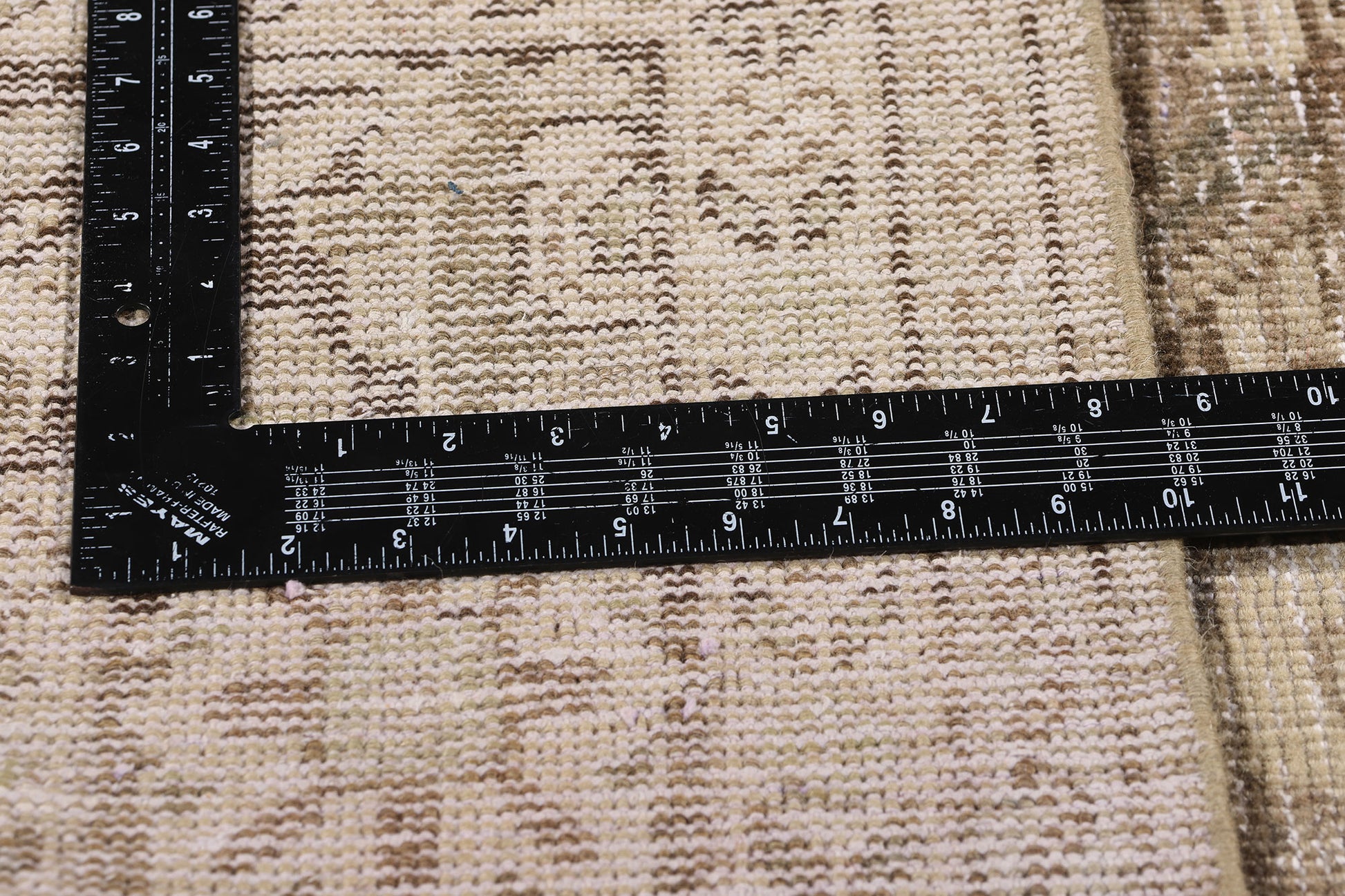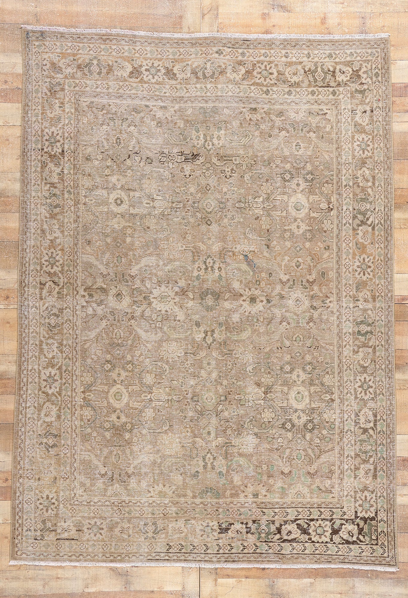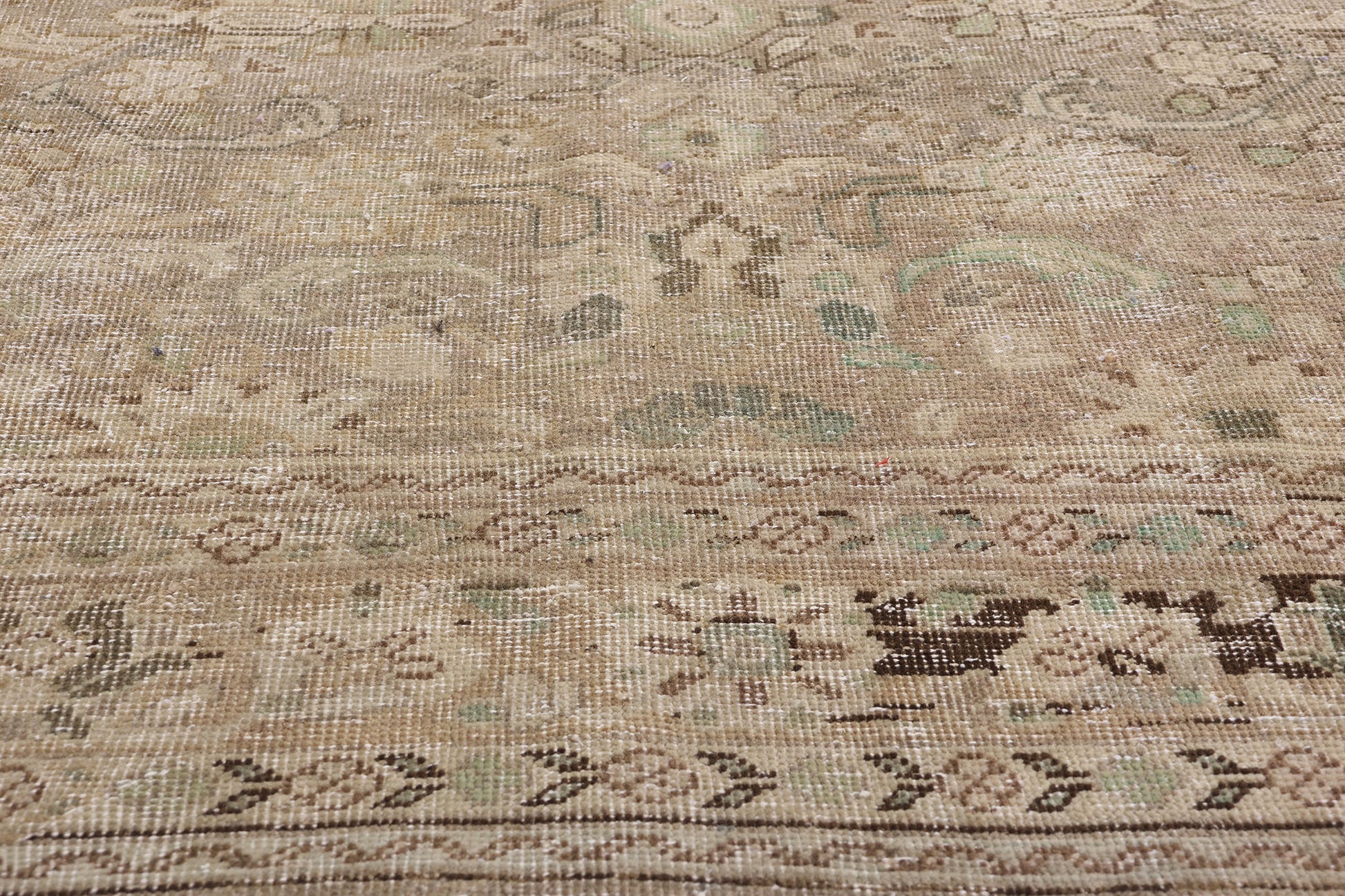 This hand-knotted wool distressed vintage Persian Mahal rug effortlessly merges biophilic design with modern rustic charm, creating a timeless piece that celebrates the enchantment of nature and artisanal craftsmanship. Its antique-washed palette, composed of soothing neutral earth tones, exudes an understated elegance, making it a versatile addition to interiors that embrace relaxed refinement and quiet sophistication. The gently distressed surface and subtle patina tell a story of age and character, lending the Persian rug a nostalgic charm that enriches its aesthetic allure.