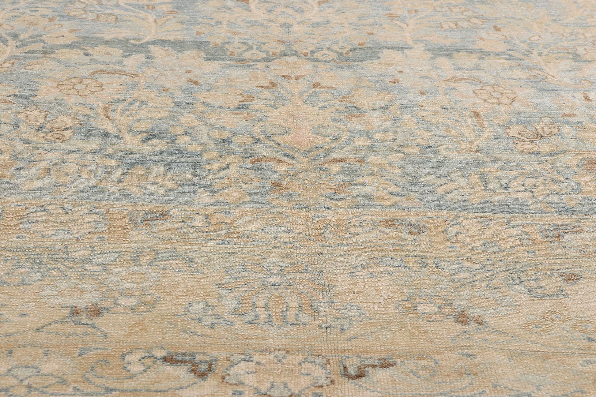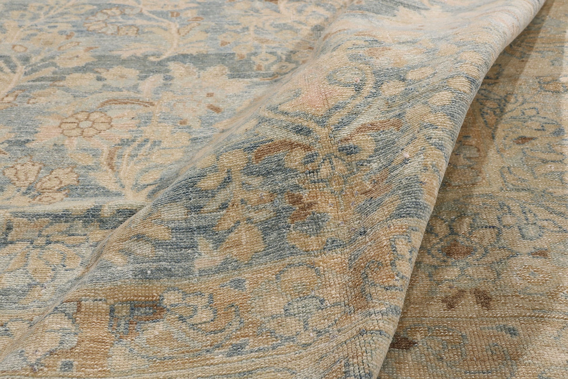 The framing border is no less poetic. A sequence of lotus blossoms and imperial peonies—both ancient symbols of purity, wealth, and enlightenment—encircle the field like a protective mantra. These are flanked by finely drawn boteh guard bands, the eternal Persian flame leaf that blesses and protects. It is a composition of subtle power, where each line of knotting is both decorative and devotional. To live with such a piece is to embrace not only a refined aesthetic, but also the deeper symbolism and social good embedded in preserving artisan culture.