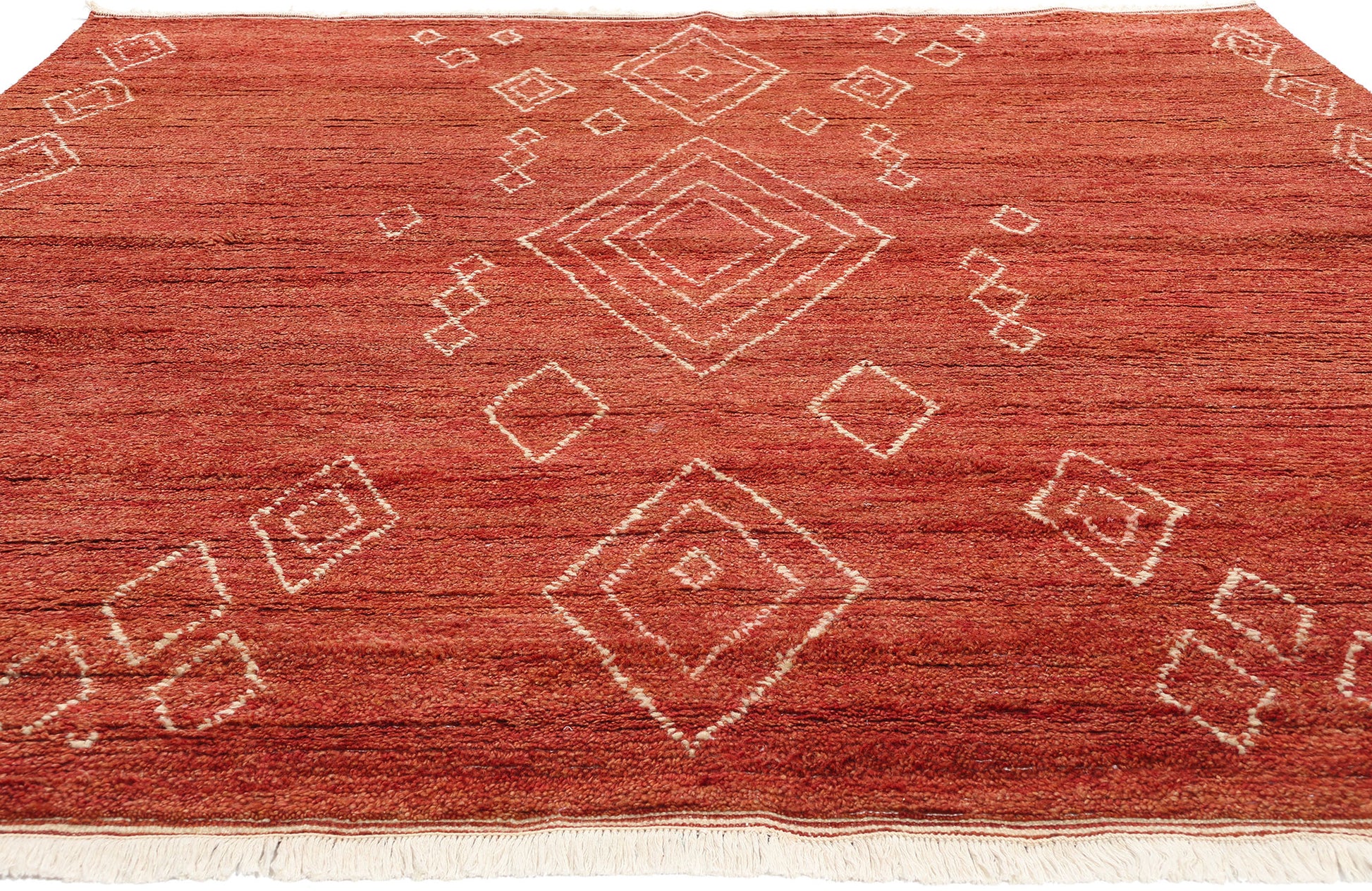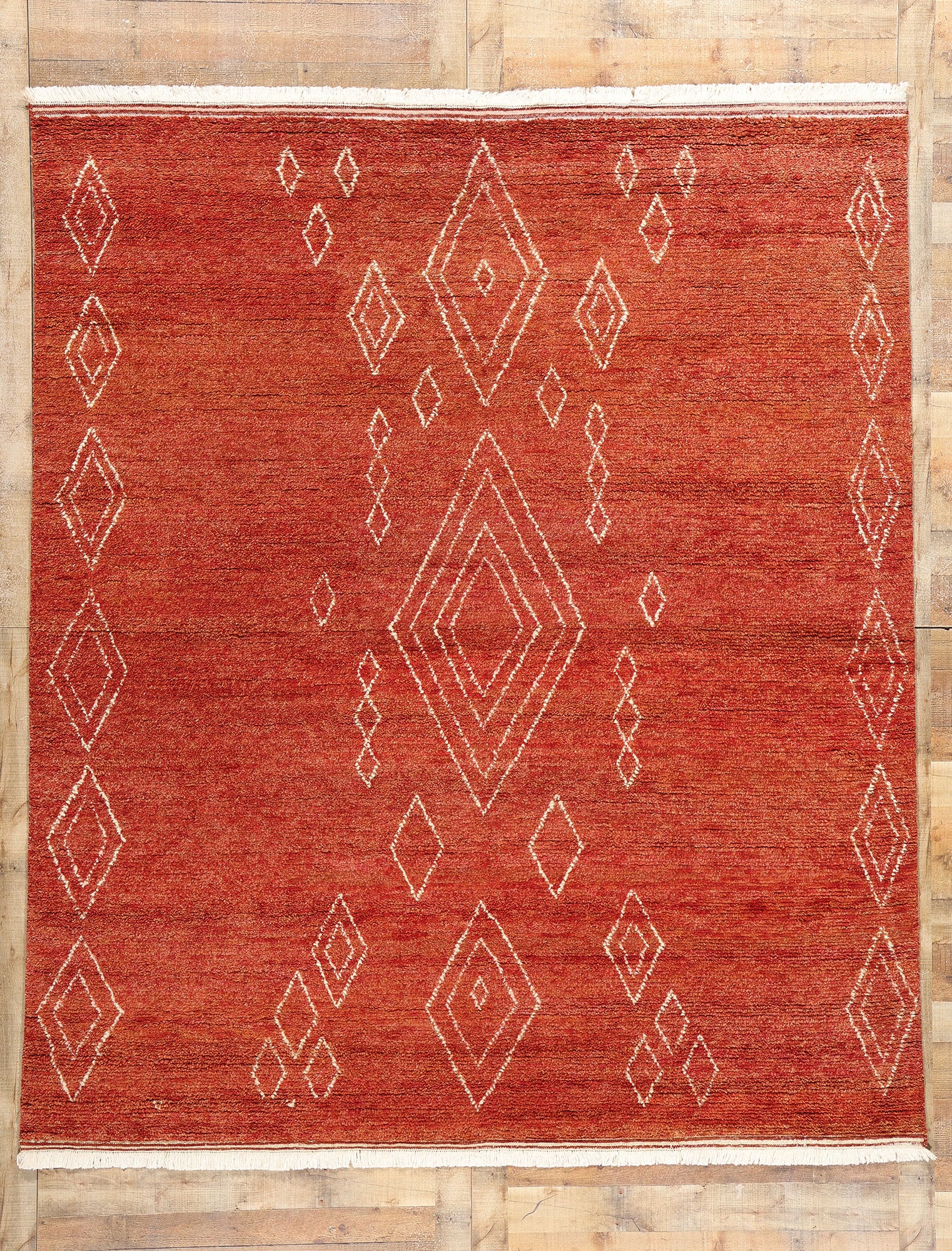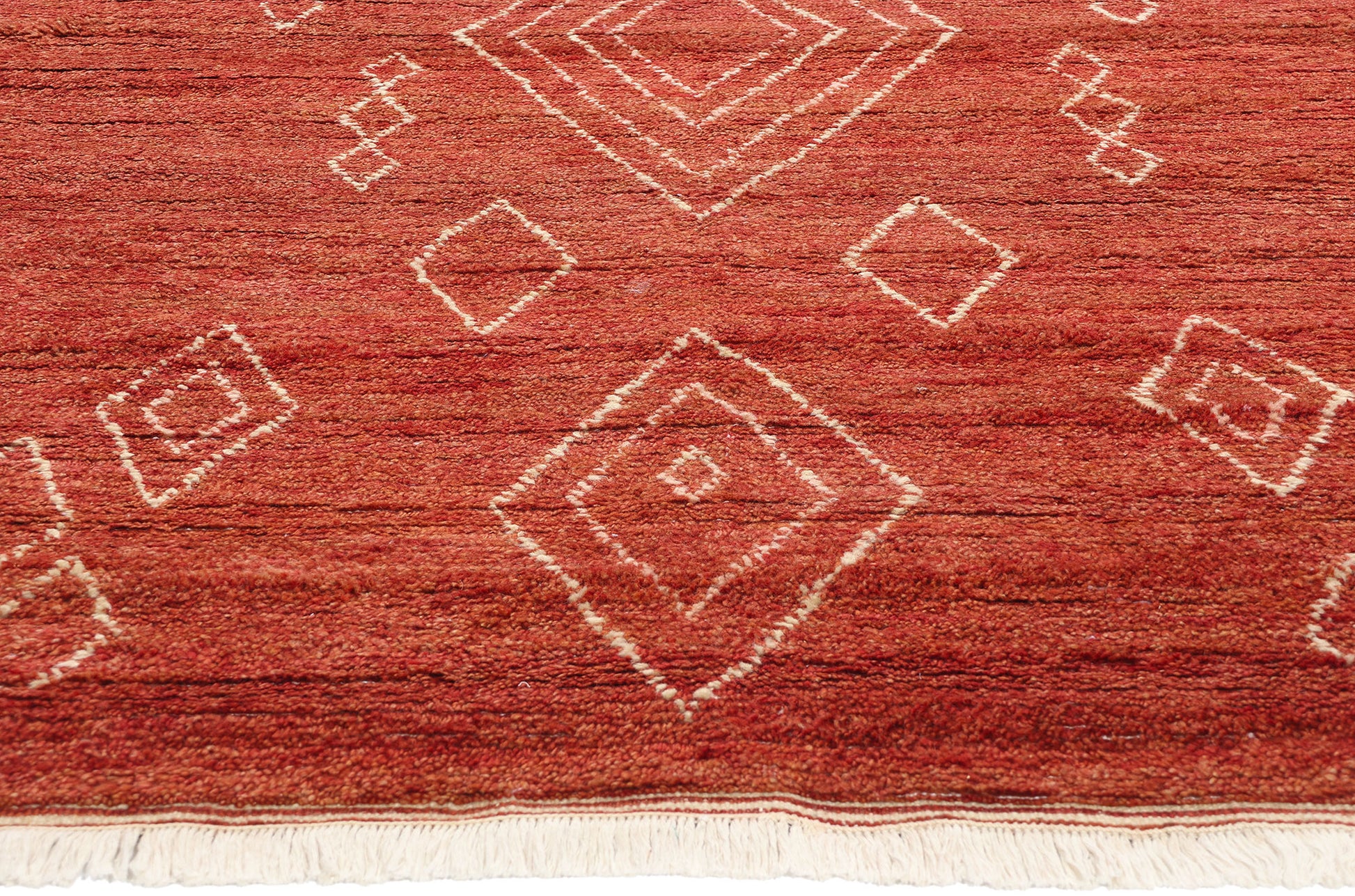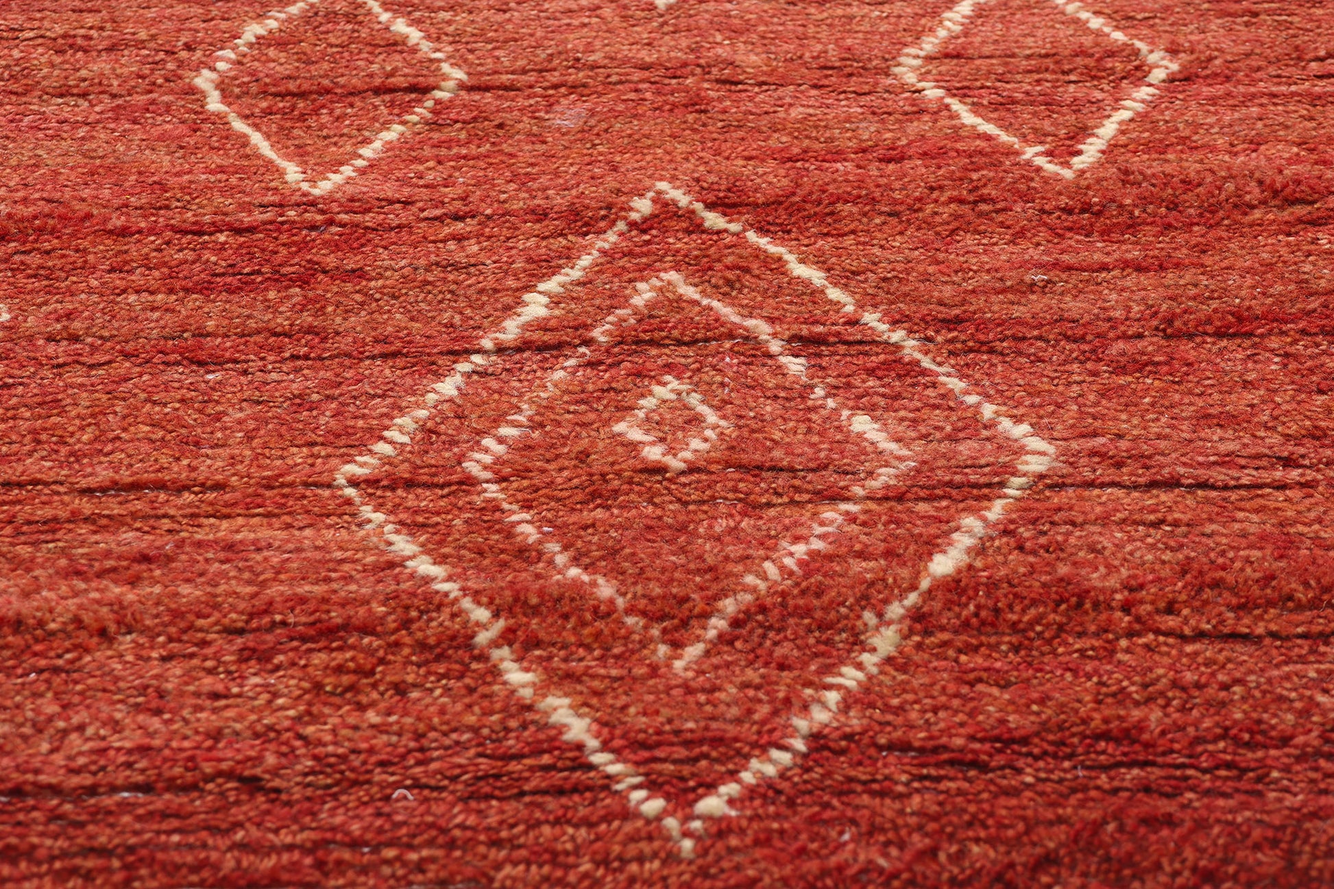 This hand knotted wool Crimson Desert Oasis Modern Red Moroccan Rug is a stunning embodiment of vibrant color and intricate tribal design, offering a bold yet serene addition to any interior space. This Moroccan area rug captures the deep, rich tones of a crimson sunset, evoking the warmth and mystery of a desert landscape. The esoteric diamond design, meticulously woven into the fabric, reflect traditional Moroccan lozenge motifs, bringing a sense of history and cultural depth into the modern home.