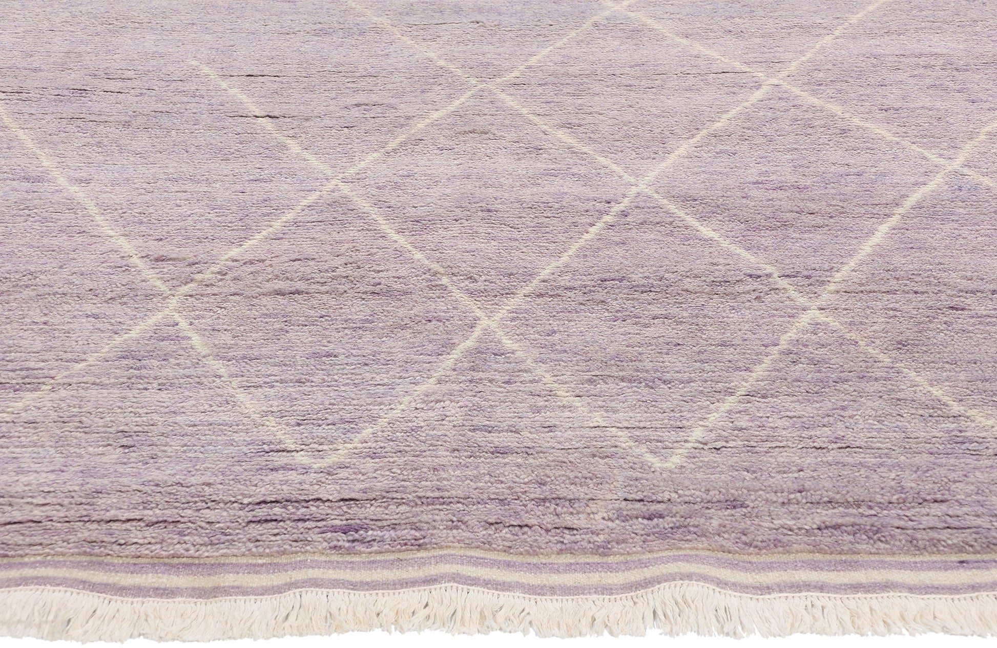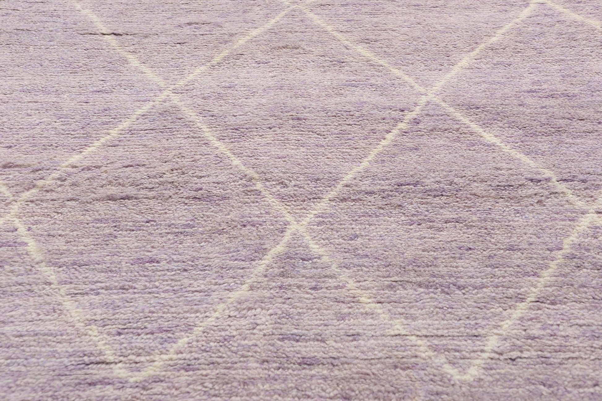 This hand knotted wool Lavender Mirage Modern Moroccan rug is a stunning example of tribal allure and Indian craftsmanship that brings an air of tranquility and elegance to almost any space. With its soft purple tones, this Moroccan area rug evokes a serene and ethereal atmosphere, as if the very essence of a lavender field has been woven into its fibers. The delicate design is subtle yet captivating, with an organic lozenge lattice that seem to drift across the surface like a gentle breeze, creating a dreamlike quality that is both enchanting and inviting.