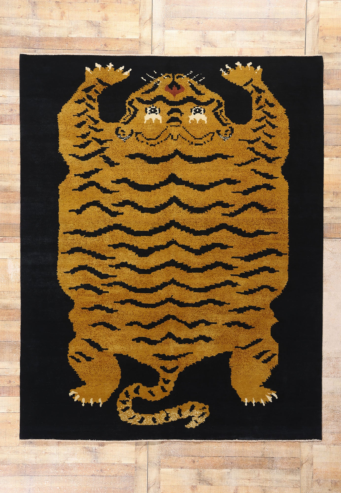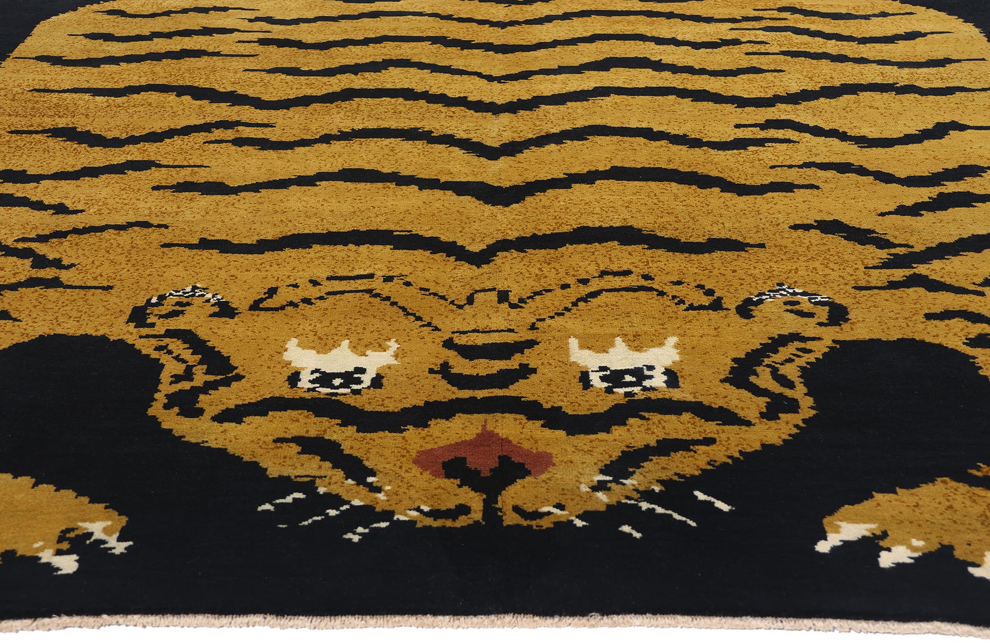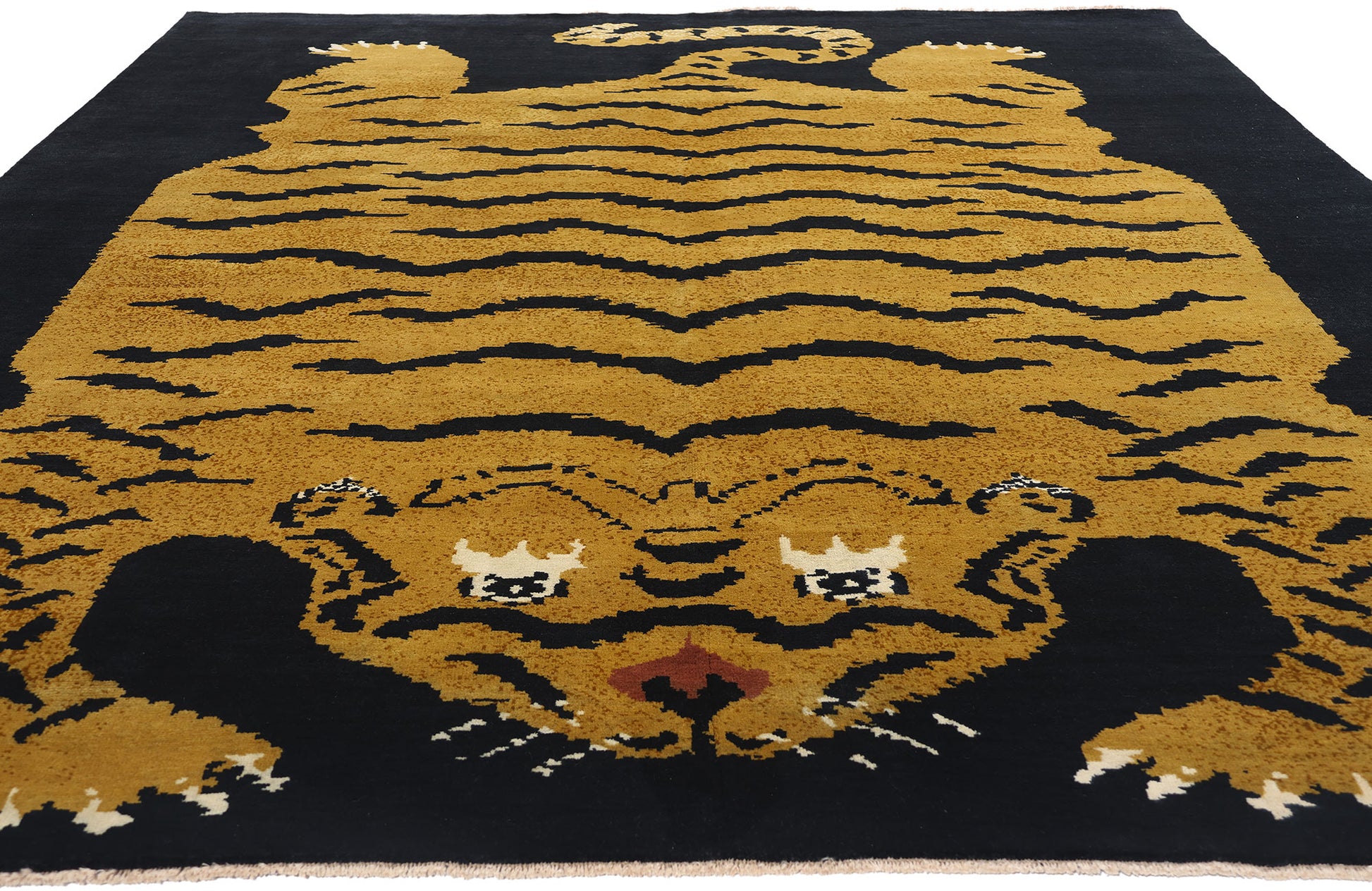 This hand-knotted wool modern Tibetan Tiger rug is a striking piece of woven artistry that beautifully captures the essence of traditional Tibetan design with a contemporary flair. The rug's bold and captivating design features a powerful tiger sprawled across a deep black background, its golden-hued body adorned with dynamic black stripes. This visually arresting composition immediately draws the eye, imbuing the rug with a sense of strength and vitality.
