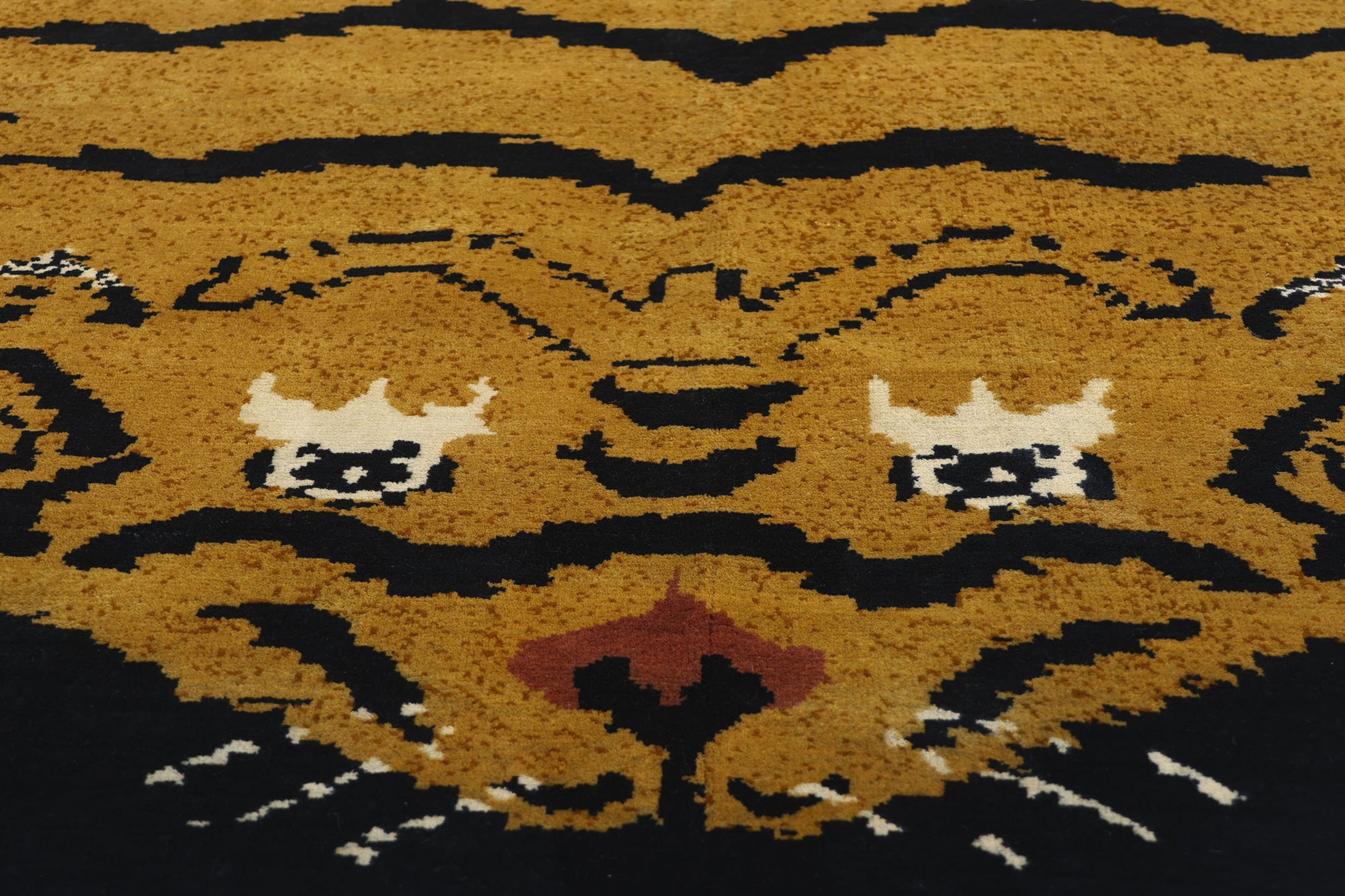 Beyond its symbolic significance, this modern Tibetan Tiger rug also embodies a sense of luxury and sophistication. The high-quality wool used in its creation ensures durability and a plush texture, making it a comfortable and elegant addition to any space. The rug's bold design and cultural symbolism make it a perfect statement piece, adding a touch of exotic charm and historical depth to contemporary interiors. This rug not only serves as a functional floor covering but also as a work of art that celebrates the rich heritage and timeless beauty of Tibetan craftsmanship.
