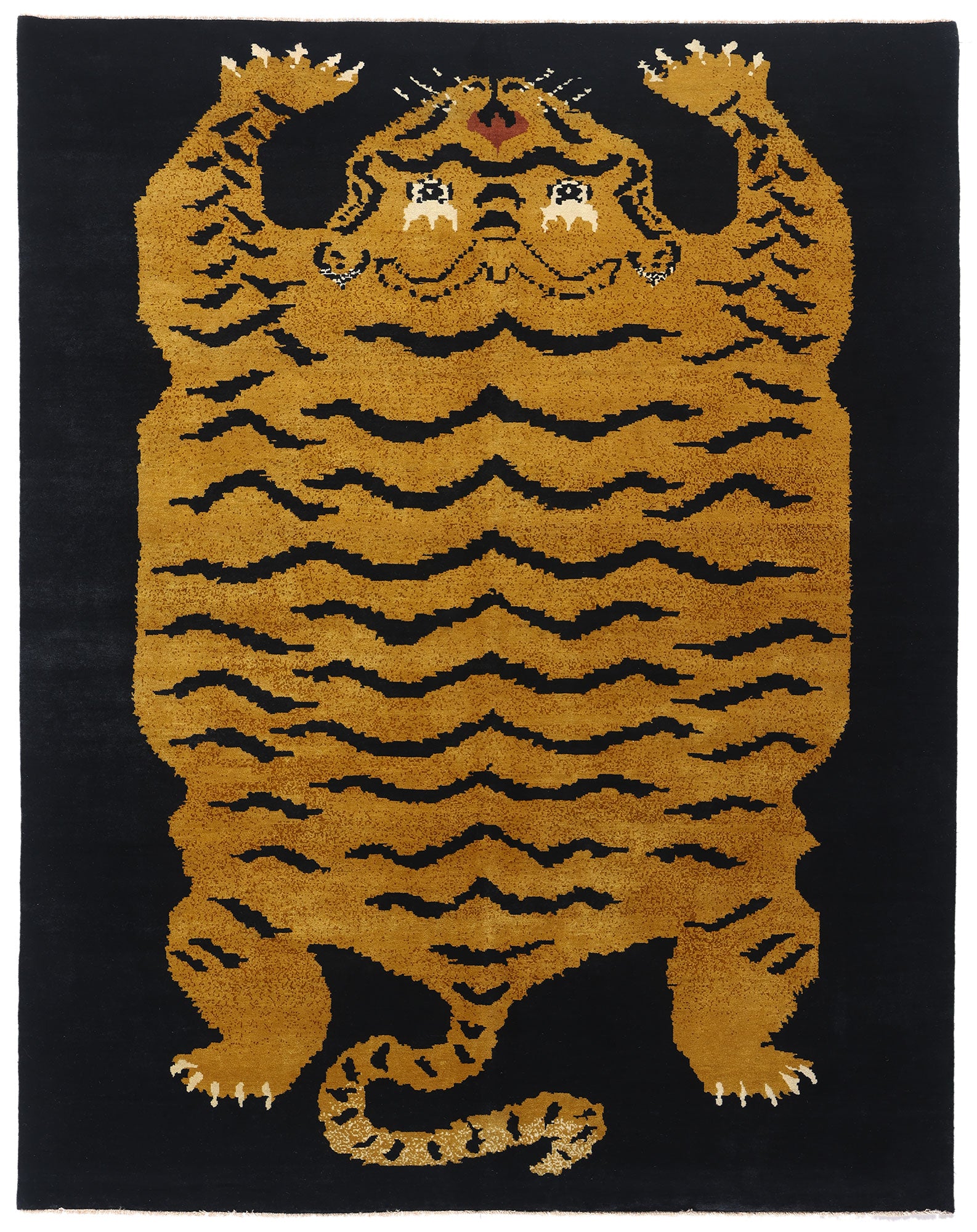 The tiger, a revered symbol in Tibetan culture, represents protection, courage, and spiritual power. Traditionally, tiger rugs were used by monks and high-ranking officials to signify their authority and status. The depiction of the tiger with its fierce expression and prominent claws conveys a sense of guardianship, warding off evil spirits and negative energies. The intricate detailing in the tiger's face and body reflects the high level of craftsmanship involved in creating this masterpiece, while the rich contrast between the golden tiger and the dark background adds depth and intensity to the design.