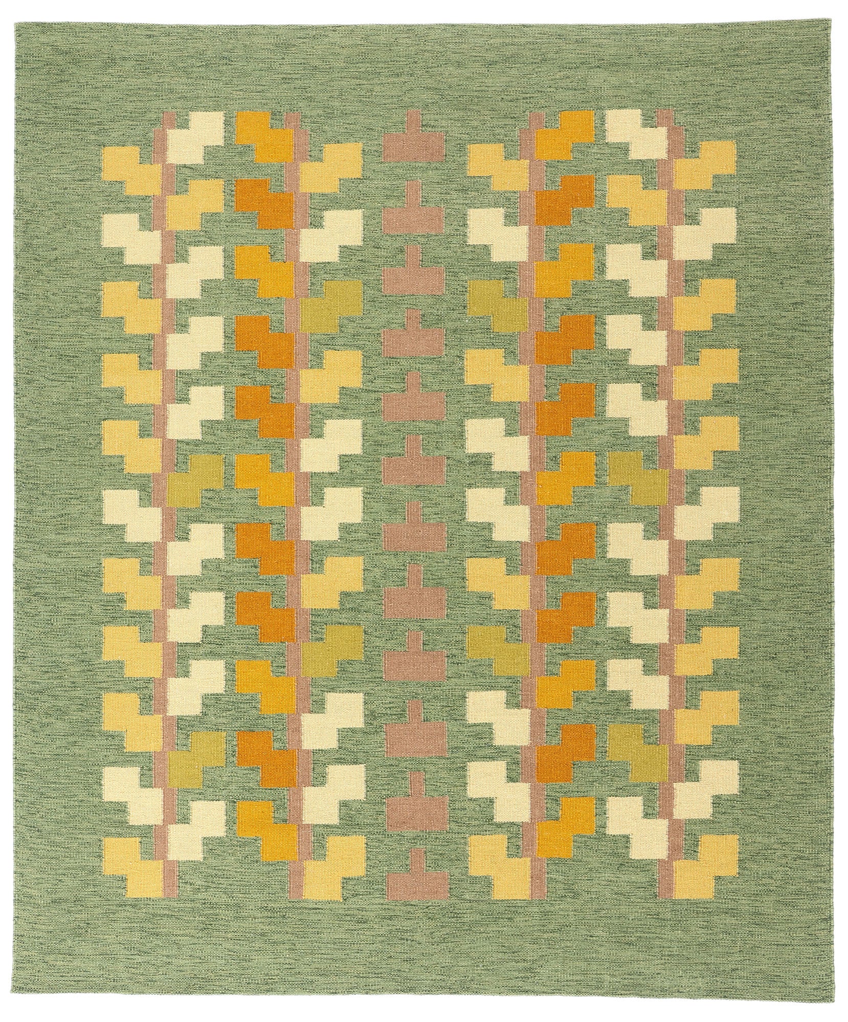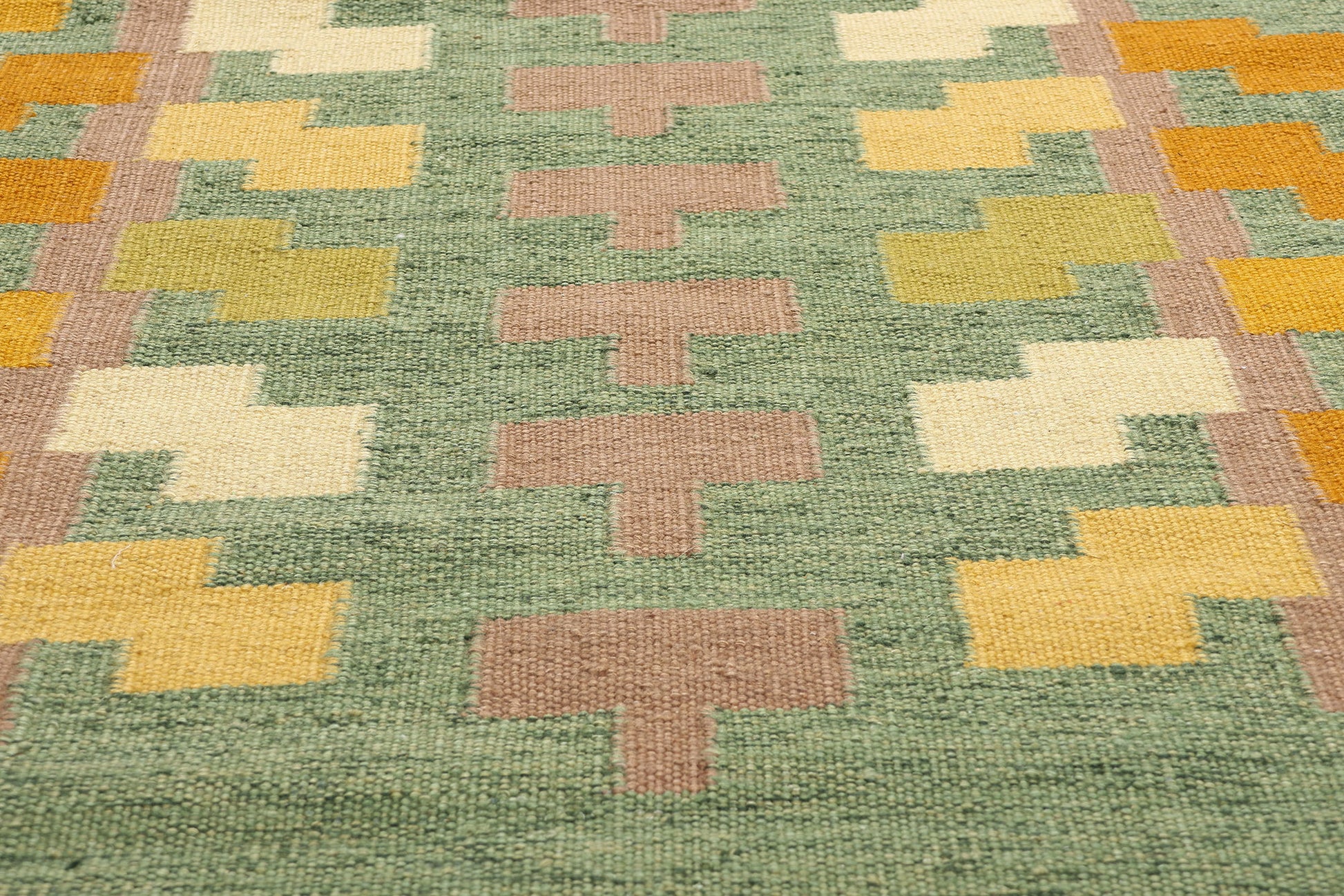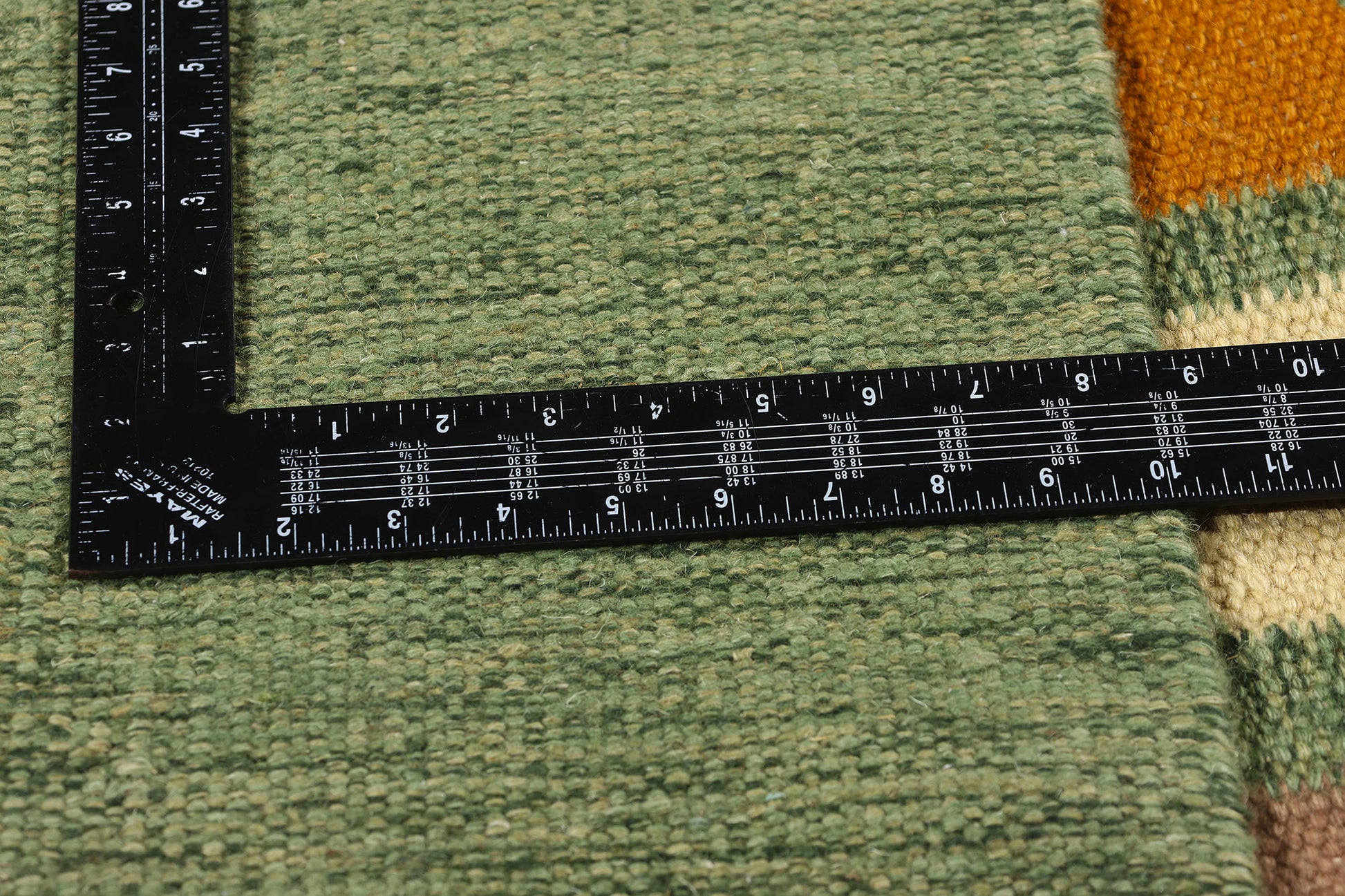 This Swedish Scandinavian Inspired kilim rug is a contemporary reinterpretation that draws inspiration from the spirit of Judith Johansson's "Dvargbjork" design while introducing a fresh perspective tailored to modern aesthetics and trends. Crafted with Indian wool using advanced weaving techniques, the flatweave rug departs from the original's grid-like structure, embracing elongated motifs and a softer, more organic color palette. These design choices align with modern trends such as Biophilia and Hygge, celebrating the natural world and evoking a sense of comfort and well-being.