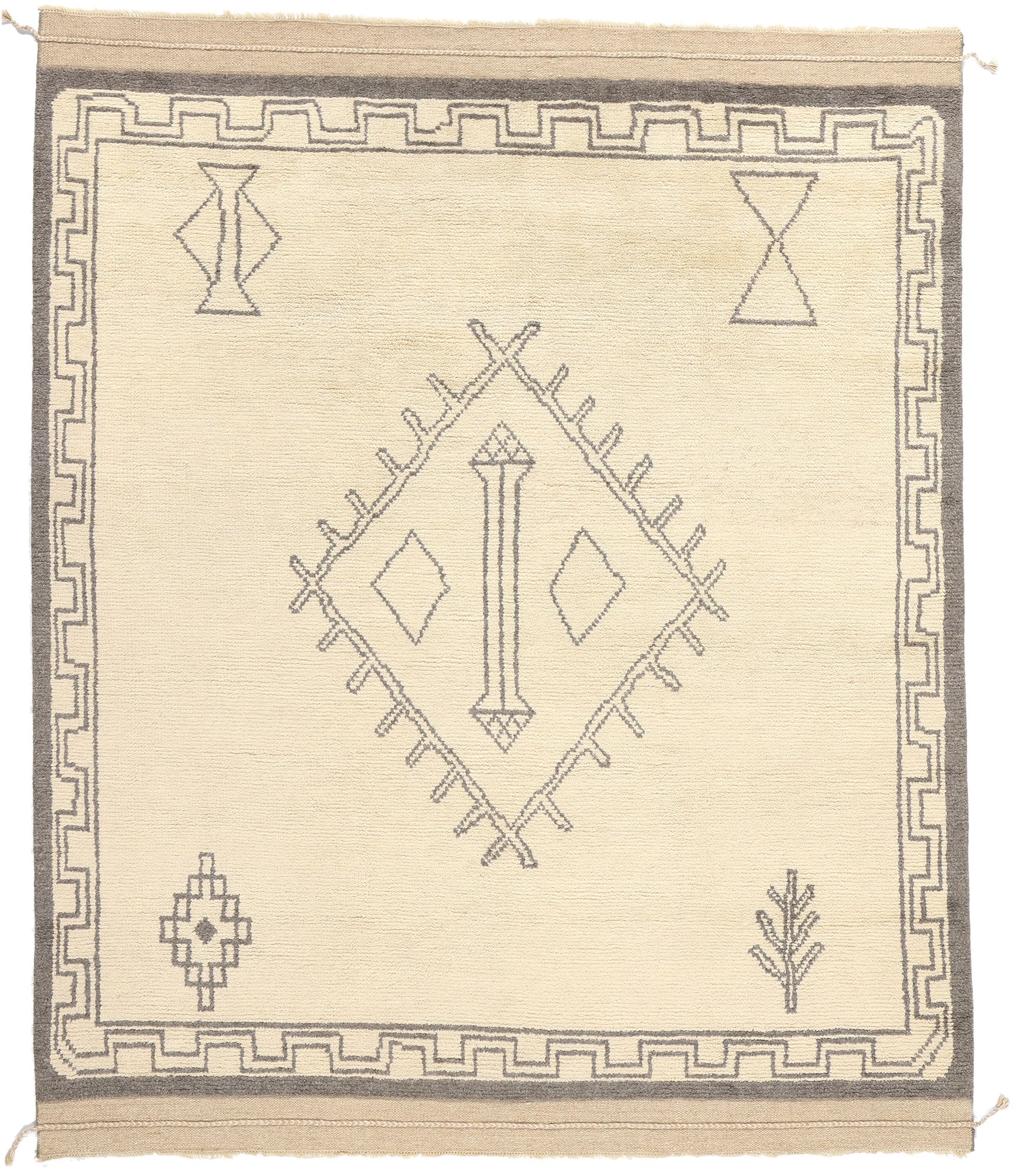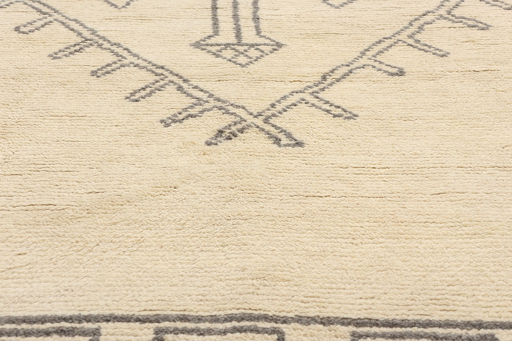 This hand knotted wool Modern Moroccan rug is a serene embodiment of contemporary tribal craftsmanship, designed to evoke a sense of calm and balance. The neutral beige composition features a subdued and esoteric pattern that resonates with the organic flow of nature, making it an ideal piece for those who appreciate the understated elegance found in Organic Modern, Wabi-Sabi, and Shibui design styles. The neutral tones, highlighted by intricate geometric motifs, create a harmonious blend that is both visually soothing and culturally rich.
