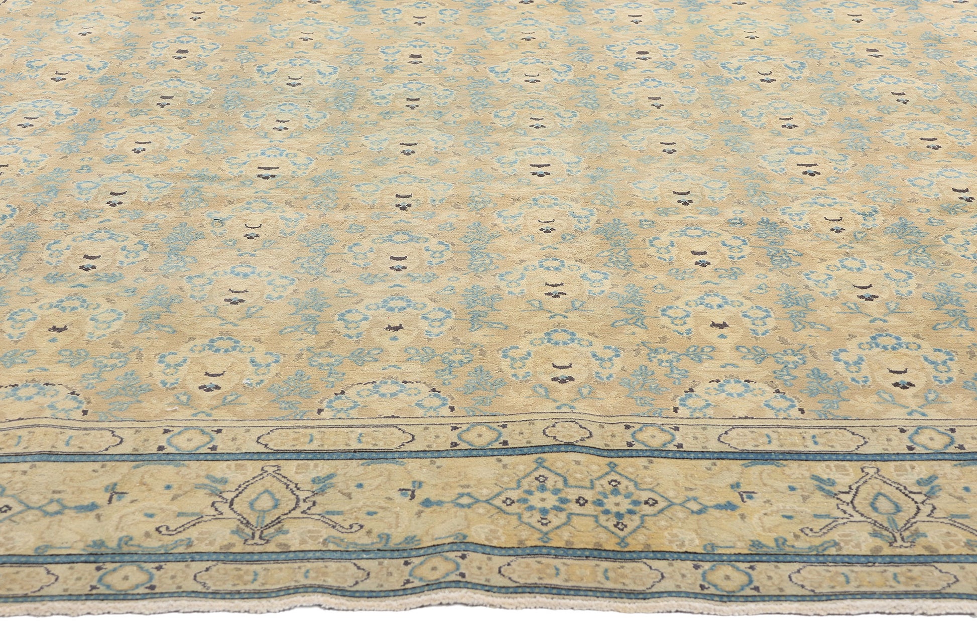 The muted palette of this Persian masterpiece showcases shades of beige, champagne, and gentle blues, creating a sense of relaxed refinement that invites tranquility into any space. The weathered beauty of the piece gives it a sense of effortless luxury, transforming nearly any environment into one of laid-back elegance. Each inch of this distressed Persian rug tells a story of generations past, where delicate craftsmanship met the passage of time, resulting in a piece that feels both lived-in and eternal. The softness of its tones and textures echoes the natural world, making it a perfect complement to spaces that cherish both history and modernity.