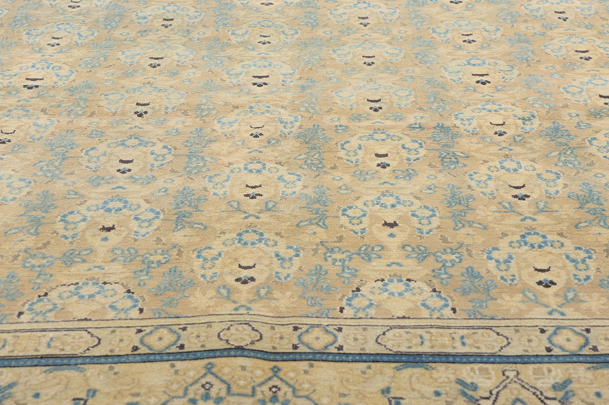 Framing the Mashhad rug, the Shah Abbas palmette border acts as a striking contrast, its ornate and symmetrical design grounded by inner and outer cartouche guard bands. These borders, while framing the central design, offer a sense of structure that enhances the flowing motifs within the field. The careful detailing of the cartouche guard bands complements the boldness of the central design, adding an extra layer of intricacy to the Persian rug’s composition. The fine balance between the allover Mina Khani motifs and the enclosing borders contributes to the rug’s harmonious beauty, showcasing Persian rug-making mastery.