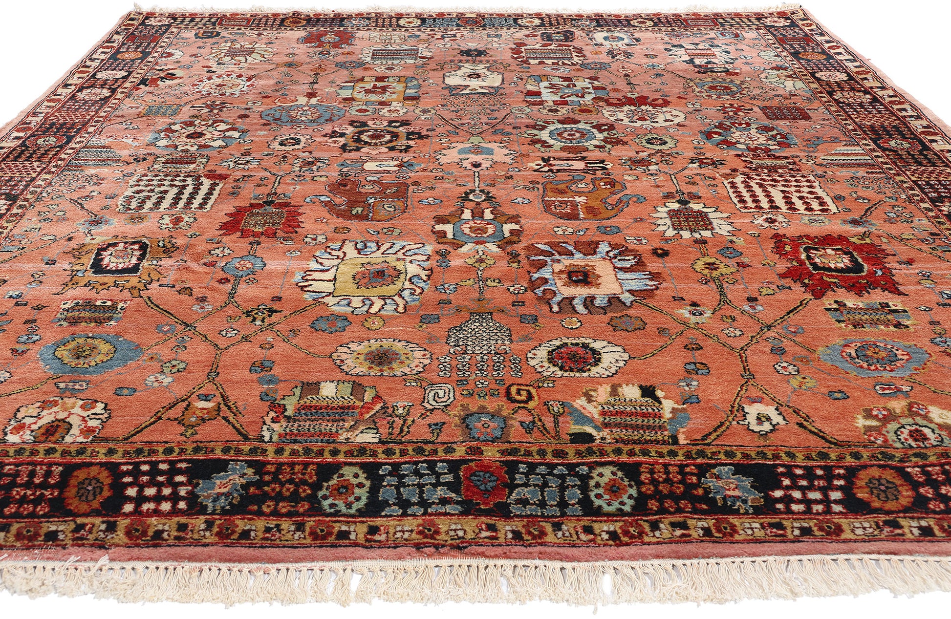 This hand-knotted wool vintage Persian Tabriz rug is a magnificent example of cultural storytelling and artistic expression, blending classical Persian influences with the finesse of traditional Tabriz craftsmanship. The Tabriz rug’s central field is a vibrant canvas of artistry, adorned with an eclectic array of motifs, each rich in symbolism. Dominating the field are stylized vases, amulets, and botehs, framed by a sprawling lattice of floral vines that suggest endless regeneration and interconnectedness. The warm terracotta ground is accented by hues of soft blues, peach, beige, and burgundy, creating a palette that is both harmonious and captivating.
