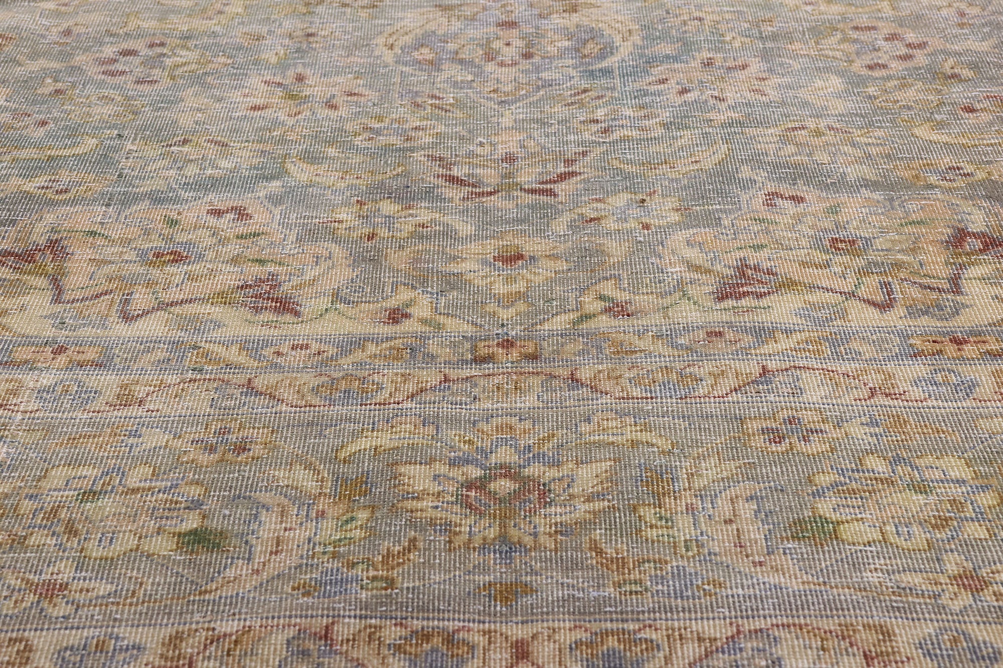 Steeped in elegance and refinement, this hand-knotted wool distressed vintage Persian Kashan rug embodies the grandeur of one of Persia’s most illustrious weaving centers. Kashan rugs have long been the choice of nobility and discerning collectors, treasured for their sophisticated artistry and exceptional craftsmanship. This particular piece, softened by time into a palette of muted silvers, celadon greens, and faded rose, carries with it the quiet dignity of age and the allure of exclusivity.